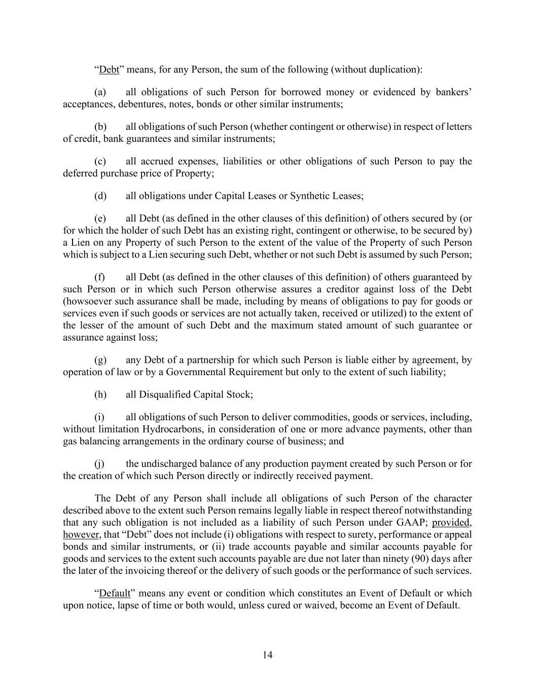 14 “Debt” means, for any Person, the sum of the following (without duplication): (a) all obligations of such Person for borrowed money or evidenced by bankers’ acceptances, debentures, notes, bonds or other similar instruments; (b) all obligations of such Person (whether contingent or otherwise) in respect of letters of credit, bank guarantees and similar instruments; (c) all accrued expenses, liabilities or other obligations of such Person to pay the deferred purchase price of Property; (d) all obligations under Capital Leases or Synthetic Leases; (e) all Debt (as defined in the other clauses of this definition) of others secured by (or for which the holder of such Debt has an existing right, contingent or otherwise, to be secured by) a Lien on any Property of such Person to the extent of the value of the Property of such Person which is subject to a Lien securing such Debt, whether or not such Debt is assumed by such Person; (f) all Debt (as defined in the other clauses of this definition) of others guaranteed by such Person or in which such Person otherwise assures a creditor against loss of the Debt (howsoever such assurance shall be made, including by means of obligations to pay for goods or services even if such goods or services are not actually taken, received or utilized) to the extent of the lesser of the amount of such Debt and the maximum stated amount of such guarantee or assurance against loss; (g) any Debt of a partnership for which such Person is liable either by agreement, by operation of law or by a Governmental Requirement but only to the extent of such liability; (h) all Disqualified Capital Stock; (i) all obligations of such Person to deliver commodities, goods or services, including, without limitation Hydrocarbons, in consideration of one or more advance payments, other than gas balancing arrangements in the ordinary course of business; and (j) the undischarged balance of any production payment created by such Person or for the creation of which such Person directly or indirectly received payment. The Debt of any Person shall include all obligations of such Person of the character described above to the extent such Person remains legally liable in respect thereof notwithstanding that any such obligation is not included as a liability of such Person under GAAP; provided, however, that “Debt” does not include (i) obligations with respect to surety, performance or appeal bonds and similar instruments, or (ii) trade accounts payable and similar accounts payable for goods and services to the extent such accounts payable are due not later than ninety (90) days after the later of the invoicing thereof or the delivery of such goods or the performance of such services. “Default” means any event or condition which constitutes an Event of Default or which upon notice, lapse of time or both would, unless cured or waived, become an Event of Default.
