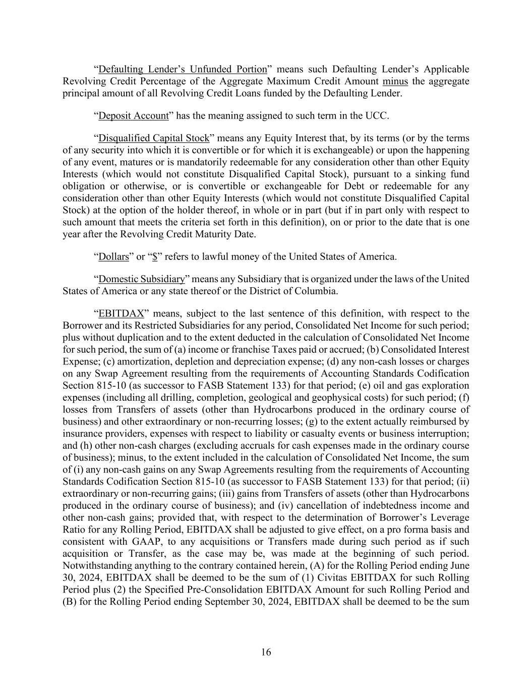 16 “Defaulting Lender’s Unfunded Portion” means such Defaulting Lender’s Applicable Revolving Credit Percentage of the Aggregate Maximum Credit Amount minus the aggregate principal amount of all Revolving Credit Loans funded by the Defaulting Lender. “Deposit Account” has the meaning assigned to such term in the UCC. “Disqualified Capital Stock” means any Equity Interest that, by its terms (or by the terms of any security into which it is convertible or for which it is exchangeable) or upon the happening of any event, matures or is mandatorily redeemable for any consideration other than other Equity Interests (which would not constitute Disqualified Capital Stock), pursuant to a sinking fund obligation or otherwise, or is convertible or exchangeable for Debt or redeemable for any consideration other than other Equity Interests (which would not constitute Disqualified Capital Stock) at the option of the holder thereof, in whole or in part (but if in part only with respect to such amount that meets the criteria set forth in this definition), on or prior to the date that is one year after the Revolving Credit Maturity Date. “Dollars” or “$” refers to lawful money of the United States of America. “Domestic Subsidiary” means any Subsidiary that is organized under the laws of the United States of America or any state thereof or the District of Columbia. “EBITDAX” means, subject to the last sentence of this definition, with respect to the Borrower and its Restricted Subsidiaries for any period, Consolidated Net Income for such period; plus without duplication and to the extent deducted in the calculation of Consolidated Net Income for such period, the sum of (a) income or franchise Taxes paid or accrued; (b) Consolidated Interest Expense; (c) amortization, depletion and depreciation expense; (d) any non-cash losses or charges on any Swap Agreement resulting from the requirements of Accounting Standards Codification Section 815-10 (as successor to FASB Statement 133) for that period; (e) oil and gas exploration expenses (including all drilling, completion, geological and geophysical costs) for such period; (f) losses from Transfers of assets (other than Hydrocarbons produced in the ordinary course of business) and other extraordinary or non-recurring losses; (g) to the extent actually reimbursed by insurance providers, expenses with respect to liability or casualty events or business interruption; and (h) other non-cash charges (excluding accruals for cash expenses made in the ordinary course of business); minus, to the extent included in the calculation of Consolidated Net Income, the sum of (i) any non-cash gains on any Swap Agreements resulting from the requirements of Accounting Standards Codification Section 815-10 (as successor to FASB Statement 133) for that period; (ii) extraordinary or non-recurring gains; (iii) gains from Transfers of assets (other than Hydrocarbons produced in the ordinary course of business); and (iv) cancellation of indebtedness income and other non-cash gains; provided that, with respect to the determination of Borrower’s Leverage Ratio for any Rolling Period, EBITDAX shall be adjusted to give effect, on a pro forma basis and consistent with GAAP, to any acquisitions or Transfers made during such period as if such acquisition or Transfer, as the case may be, was made at the beginning of such period. Notwithstanding anything to the contrary contained herein, (A) for the Rolling Period ending June 30, 2024, EBITDAX shall be deemed to be the sum of (1) Civitas EBITDAX for such Rolling Period plus (2) the Specified Pre-Consolidation EBITDAX Amount for such Rolling Period and (B) for the Rolling Period ending September 30, 2024, EBITDAX shall be deemed to be the sum