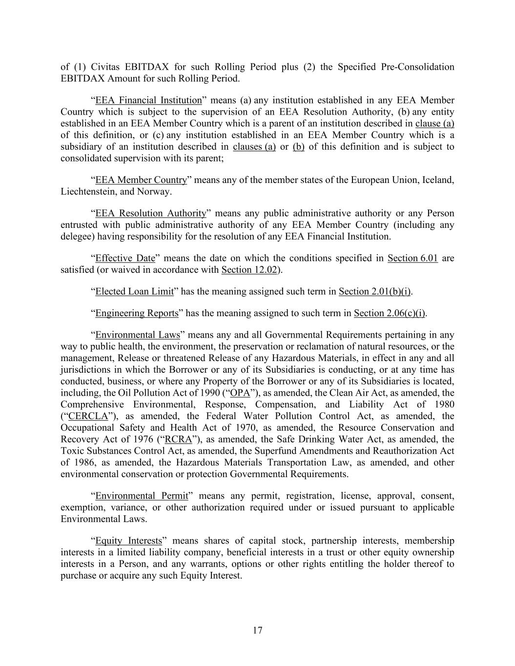 17 of (1) Civitas EBITDAX for such Rolling Period plus (2) the Specified Pre-Consolidation EBITDAX Amount for such Rolling Period. “EEA Financial Institution” means (a) any institution established in any EEA Member Country which is subject to the supervision of an EEA Resolution Authority, (b) any entity established in an EEA Member Country which is a parent of an institution described in clause (a) of this definition, or (c) any institution established in an EEA Member Country which is a subsidiary of an institution described in clauses (a) or (b) of this definition and is subject to consolidated supervision with its parent; “EEA Member Country” means any of the member states of the European Union, Iceland, Liechtenstein, and Norway. “EEA Resolution Authority” means any public administrative authority or any Person entrusted with public administrative authority of any EEA Member Country (including any delegee) having responsibility for the resolution of any EEA Financial Institution. “Effective Date” means the date on which the conditions specified in Section 6.01 are satisfied (or waived in accordance with Section 12.02). “Elected Loan Limit” has the meaning assigned such term in Section 2.01(b)(i). “Engineering Reports” has the meaning assigned to such term in Section 2.06(c)(i). “Environmental Laws” means any and all Governmental Requirements pertaining in any way to public health, the environment, the preservation or reclamation of natural resources, or the management, Release or threatened Release of any Hazardous Materials, in effect in any and all jurisdictions in which the Borrower or any of its Subsidiaries is conducting, or at any time has conducted, business, or where any Property of the Borrower or any of its Subsidiaries is located, including, the Oil Pollution Act of 1990 (“OPA”), as amended, the Clean Air Act, as amended, the Comprehensive Environmental, Response, Compensation, and Liability Act of 1980 (“CERCLA”), as amended, the Federal Water Pollution Control Act, as amended, the Occupational Safety and Health Act of 1970, as amended, the Resource Conservation and Recovery Act of 1976 (“RCRA”), as amended, the Safe Drinking Water Act, as amended, the Toxic Substances Control Act, as amended, the Superfund Amendments and Reauthorization Act of 1986, as amended, the Hazardous Materials Transportation Law, as amended, and other environmental conservation or protection Governmental Requirements. “Environmental Permit” means any permit, registration, license, approval, consent, exemption, variance, or other authorization required under or issued pursuant to applicable Environmental Laws. “Equity Interests” means shares of capital stock, partnership interests, membership interests in a limited liability company, beneficial interests in a trust or other equity ownership interests in a Person, and any warrants, options or other rights entitling the holder thereof to purchase or acquire any such Equity Interest.