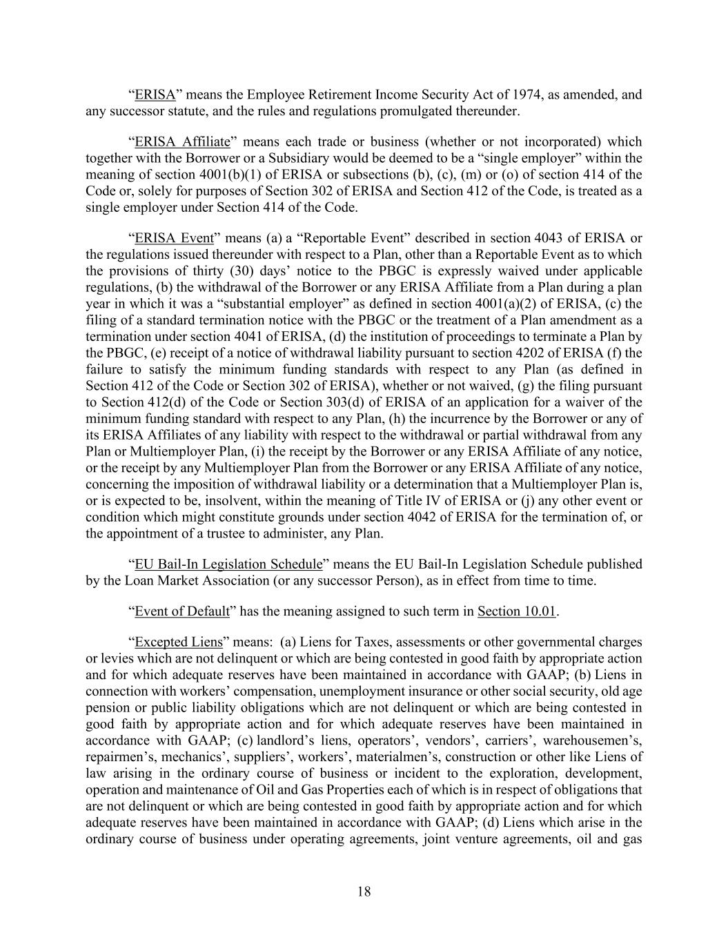 18 “ERISA” means the Employee Retirement Income Security Act of 1974, as amended, and any successor statute, and the rules and regulations promulgated thereunder. “ERISA Affiliate” means each trade or business (whether or not incorporated) which together with the Borrower or a Subsidiary would be deemed to be a “single employer” within the meaning of section 4001(b)(1) of ERISA or subsections (b), (c), (m) or (o) of section 414 of the Code or, solely for purposes of Section 302 of ERISA and Section 412 of the Code, is treated as a single employer under Section 414 of the Code. “ERISA Event” means (a) a “Reportable Event” described in section 4043 of ERISA or the regulations issued thereunder with respect to a Plan, other than a Reportable Event as to which the provisions of thirty (30) days’ notice to the PBGC is expressly waived under applicable regulations, (b) the withdrawal of the Borrower or any ERISA Affiliate from a Plan during a plan year in which it was a “substantial employer” as defined in section 4001(a)(2) of ERISA, (c) the filing of a standard termination notice with the PBGC or the treatment of a Plan amendment as a termination under section 4041 of ERISA, (d) the institution of proceedings to terminate a Plan by the PBGC, (e) receipt of a notice of withdrawal liability pursuant to section 4202 of ERISA (f) the failure to satisfy the minimum funding standards with respect to any Plan (as defined in Section 412 of the Code or Section 302 of ERISA), whether or not waived, (g) the filing pursuant to Section 412(d) of the Code or Section 303(d) of ERISA of an application for a waiver of the minimum funding standard with respect to any Plan, (h) the incurrence by the Borrower or any of its ERISA Affiliates of any liability with respect to the withdrawal or partial withdrawal from any Plan or Multiemployer Plan, (i) the receipt by the Borrower or any ERISA Affiliate of any notice, or the receipt by any Multiemployer Plan from the Borrower or any ERISA Affiliate of any notice, concerning the imposition of withdrawal liability or a determination that a Multiemployer Plan is, or is expected to be, insolvent, within the meaning of Title IV of ERISA or (j) any other event or condition which might constitute grounds under section 4042 of ERISA for the termination of, or the appointment of a trustee to administer, any Plan. “EU Bail-In Legislation Schedule” means the EU Bail-In Legislation Schedule published by the Loan Market Association (or any successor Person), as in effect from time to time. “Event of Default” has the meaning assigned to such term in Section 10.01. “Excepted Liens” means: (a) Liens for Taxes, assessments or other governmental charges or levies which are not delinquent or which are being contested in good faith by appropriate action and for which adequate reserves have been maintained in accordance with GAAP; (b) Liens in connection with workers’ compensation, unemployment insurance or other social security, old age pension or public liability obligations which are not delinquent or which are being contested in good faith by appropriate action and for which adequate reserves have been maintained in accordance with GAAP; (c) landlord’s liens, operators’, vendors’, carriers’, warehousemen’s, repairmen’s, mechanics’, suppliers’, workers’, materialmen’s, construction or other like Liens of law arising in the ordinary course of business or incident to the exploration, development, operation and maintenance of Oil and Gas Properties each of which is in respect of obligations that are not delinquent or which are being contested in good faith by appropriate action and for which adequate reserves have been maintained in accordance with GAAP; (d) Liens which arise in the ordinary course of business under operating agreements, joint venture agreements, oil and gas