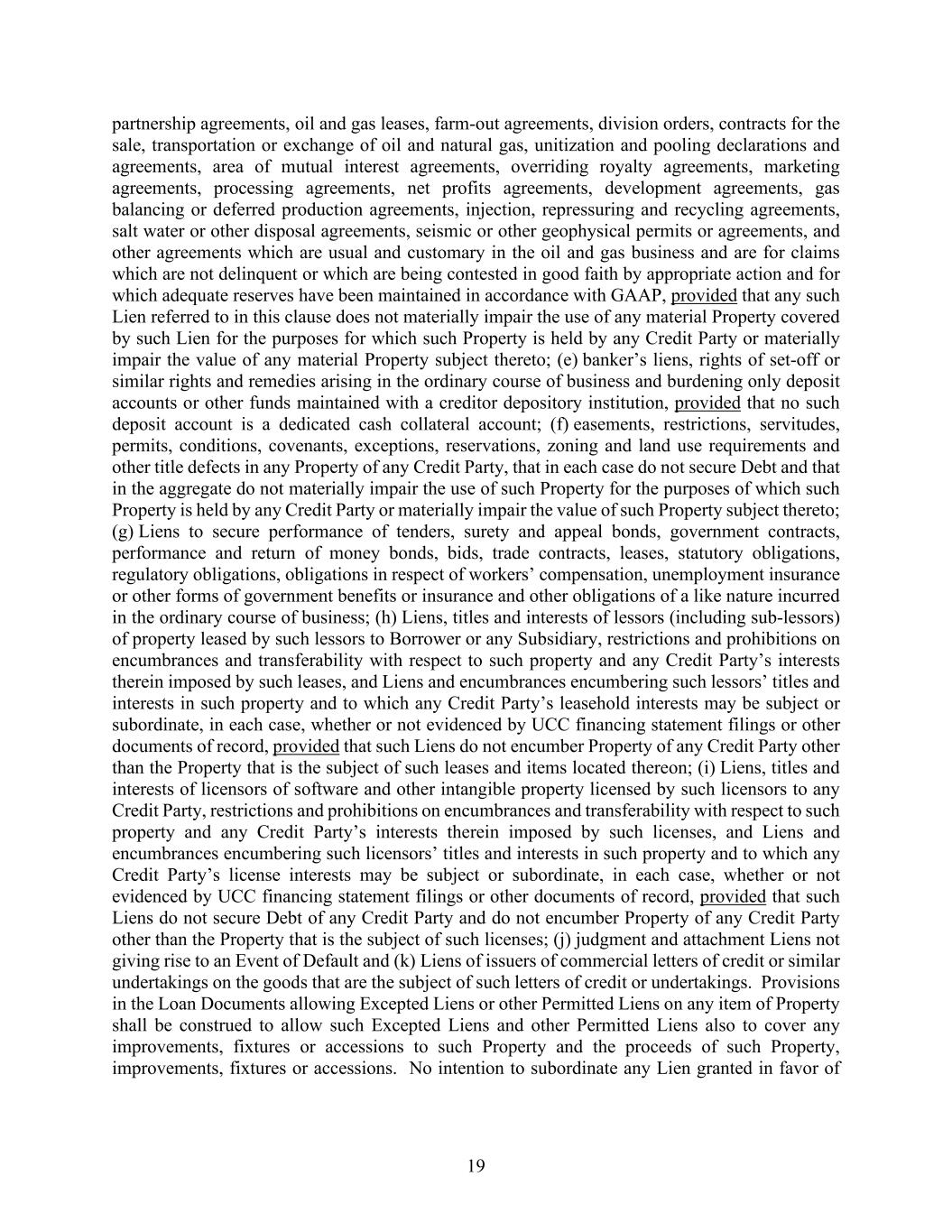 19 partnership agreements, oil and gas leases, farm-out agreements, division orders, contracts for the sale, transportation or exchange of oil and natural gas, unitization and pooling declarations and agreements, area of mutual interest agreements, overriding royalty agreements, marketing agreements, processing agreements, net profits agreements, development agreements, gas balancing or deferred production agreements, injection, repressuring and recycling agreements, salt water or other disposal agreements, seismic or other geophysical permits or agreements, and other agreements which are usual and customary in the oil and gas business and are for claims which are not delinquent or which are being contested in good faith by appropriate action and for which adequate reserves have been maintained in accordance with GAAP, provided that any such Lien referred to in this clause does not materially impair the use of any material Property covered by such Lien for the purposes for which such Property is held by any Credit Party or materially impair the value of any material Property subject thereto; (e) banker’s liens, rights of set-off or similar rights and remedies arising in the ordinary course of business and burdening only deposit accounts or other funds maintained with a creditor depository institution, provided that no such deposit account is a dedicated cash collateral account; (f) easements, restrictions, servitudes, permits, conditions, covenants, exceptions, reservations, zoning and land use requirements and other title defects in any Property of any Credit Party, that in each case do not secure Debt and that in the aggregate do not materially impair the use of such Property for the purposes of which such Property is held by any Credit Party or materially impair the value of such Property subject thereto; (g) Liens to secure performance of tenders, surety and appeal bonds, government contracts, performance and return of money bonds, bids, trade contracts, leases, statutory obligations, regulatory obligations, obligations in respect of workers’ compensation, unemployment insurance or other forms of government benefits or insurance and other obligations of a like nature incurred in the ordinary course of business; (h) Liens, titles and interests of lessors (including sub-lessors) of property leased by such lessors to Borrower or any Subsidiary, restrictions and prohibitions on encumbrances and transferability with respect to such property and any Credit Party’s interests therein imposed by such leases, and Liens and encumbrances encumbering such lessors’ titles and interests in such property and to which any Credit Party’s leasehold interests may be subject or subordinate, in each case, whether or not evidenced by UCC financing statement filings or other documents of record, provided that such Liens do not encumber Property of any Credit Party other than the Property that is the subject of such leases and items located thereon; (i) Liens, titles and interests of licensors of software and other intangible property licensed by such licensors to any Credit Party, restrictions and prohibitions on encumbrances and transferability with respect to such property and any Credit Party’s interests therein imposed by such licenses, and Liens and encumbrances encumbering such licensors’ titles and interests in such property and to which any Credit Party’s license interests may be subject or subordinate, in each case, whether or not evidenced by UCC financing statement filings or other documents of record, provided that such Liens do not secure Debt of any Credit Party and do not encumber Property of any Credit Party other than the Property that is the subject of such licenses; (j) judgment and attachment Liens not giving rise to an Event of Default and (k) Liens of issuers of commercial letters of credit or similar undertakings on the goods that are the subject of such letters of credit or undertakings. Provisions in the Loan Documents allowing Excepted Liens or other Permitted Liens on any item of Property shall be construed to allow such Excepted Liens and other Permitted Liens also to cover any improvements, fixtures or accessions to such Property and the proceeds of such Property, improvements, fixtures or accessions. No intention to subordinate any Lien granted in favor of