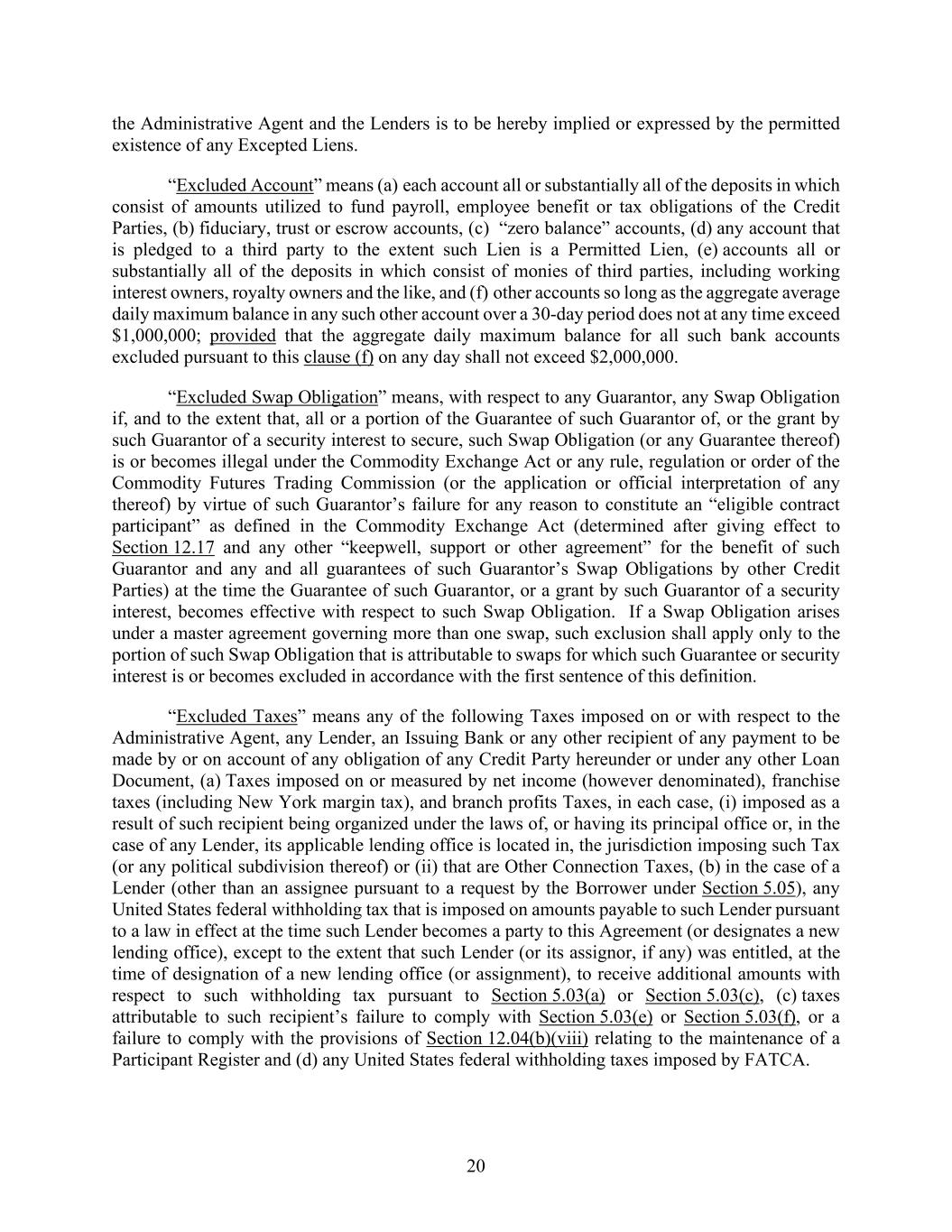 20 the Administrative Agent and the Lenders is to be hereby implied or expressed by the permitted existence of any Excepted Liens. “Excluded Account” means (a) each account all or substantially all of the deposits in which consist of amounts utilized to fund payroll, employee benefit or tax obligations of the Credit Parties, (b) fiduciary, trust or escrow accounts, (c) “zero balance” accounts, (d) any account that is pledged to a third party to the extent such Lien is a Permitted Lien, (e) accounts all or substantially all of the deposits in which consist of monies of third parties, including working interest owners, royalty owners and the like, and (f) other accounts so long as the aggregate average daily maximum balance in any such other account over a 30-day period does not at any time exceed $1,000,000; provided that the aggregate daily maximum balance for all such bank accounts excluded pursuant to this clause (f) on any day shall not exceed $2,000,000. “Excluded Swap Obligation” means, with respect to any Guarantor, any Swap Obligation if, and to the extent that, all or a portion of the Guarantee of such Guarantor of, or the grant by such Guarantor of a security interest to secure, such Swap Obligation (or any Guarantee thereof) is or becomes illegal under the Commodity Exchange Act or any rule, regulation or order of the Commodity Futures Trading Commission (or the application or official interpretation of any thereof) by virtue of such Guarantor’s failure for any reason to constitute an “eligible contract participant” as defined in the Commodity Exchange Act (determined after giving effect to Section 12.17 and any other “keepwell, support or other agreement” for the benefit of such Guarantor and any and all guarantees of such Guarantor’s Swap Obligations by other Credit Parties) at the time the Guarantee of such Guarantor, or a grant by such Guarantor of a security interest, becomes effective with respect to such Swap Obligation. If a Swap Obligation arises under a master agreement governing more than one swap, such exclusion shall apply only to the portion of such Swap Obligation that is attributable to swaps for which such Guarantee or security interest is or becomes excluded in accordance with the first sentence of this definition. “Excluded Taxes” means any of the following Taxes imposed on or with respect to the Administrative Agent, any Lender, an Issuing Bank or any other recipient of any payment to be made by or on account of any obligation of any Credit Party hereunder or under any other Loan Document, (a) Taxes imposed on or measured by net income (however denominated), franchise taxes (including New York margin tax), and branch profits Taxes, in each case, (i) imposed as a result of such recipient being organized under the laws of, or having its principal office or, in the case of any Lender, its applicable lending office is located in, the jurisdiction imposing such Tax (or any political subdivision thereof) or (ii) that are Other Connection Taxes, (b) in the case of a Lender (other than an assignee pursuant to a request by the Borrower under Section 5.05), any United States federal withholding tax that is imposed on amounts payable to such Lender pursuant to a law in effect at the time such Lender becomes a party to this Agreement (or designates a new lending office), except to the extent that such Lender (or its assignor, if any) was entitled, at the time of designation of a new lending office (or assignment), to receive additional amounts with respect to such withholding tax pursuant to Section 5.03(a) or Section 5.03(c), (c) taxes attributable to such recipient’s failure to comply with Section 5.03(e) or Section 5.03(f), or a failure to comply with the provisions of Section 12.04(b)(viii) relating to the maintenance of a Participant Register and (d) any United States federal withholding taxes imposed by FATCA.