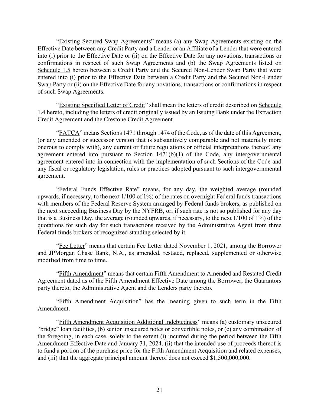 21 “Existing Secured Swap Agreements” means (a) any Swap Agreements existing on the Effective Date between any Credit Party and a Lender or an Affiliate of a Lender that were entered into (i) prior to the Effective Date or (ii) on the Effective Date for any novations, transactions or confirmations in respect of such Swap Agreements and (b) the Swap Agreements listed on Schedule 1.5 hereto between a Credit Party and the Secured Non-Lender Swap Party that were entered into (i) prior to the Effective Date between a Credit Party and the Secured Non-Lender Swap Party or (ii) on the Effective Date for any novations, transactions or confirmations in respect of such Swap Agreements. “Existing Specified Letter of Credit” shall mean the letters of credit described on Schedule 1.4 hereto, including the letters of credit originally issued by an Issuing Bank under the Extraction Credit Agreement and the Crestone Credit Agreement. “FATCA” means Sections 1471 through 1474 of the Code, as of the date of this Agreement, (or any amended or successor version that is substantively comparable and not materially more onerous to comply with), any current or future regulations or official interpretations thereof, any agreement entered into pursuant to Section 1471(b)(1) of the Code, any intergovernmental agreement entered into in connection with the implementation of such Sections of the Code and any fiscal or regulatory legislation, rules or practices adopted pursuant to such intergovernmental agreement. “Federal Funds Effective Rate” means, for any day, the weighted average (rounded upwards, if necessary, to the next 1/100 of 1%) of the rates on overnight Federal funds transactions with members of the Federal Reserve System arranged by Federal funds brokers, as published on the next succeeding Business Day by the NYFRB, or, if such rate is not so published for any day that is a Business Day, the average (rounded upwards, if necessary, to the next 1/100 of 1%) of the quotations for such day for such transactions received by the Administrative Agent from three Federal funds brokers of recognized standing selected by it. “Fee Letter” means that certain Fee Letter dated November 1, 2021, among the Borrower and JPMorgan Chase Bank, N.A., as amended, restated, replaced, supplemented or otherwise modified from time to time. “Fifth Amendment” means that certain Fifth Amendment to Amended and Restated Credit Agreement dated as of the Fifth Amendment Effective Date among the Borrower, the Guarantors party thereto, the Administrative Agent and the Lenders party thereto. “Fifth Amendment Acquisition” has the meaning given to such term in the Fifth Amendment. “Fifth Amendment Acquisition Additional Indebtedness” means (a) customary unsecured “bridge” loan facilities, (b) senior unsecured notes or convertible notes, or (c) any combination of the foregoing, in each case, solely to the extent (i) incurred during the period between the Fifth Amendment Effective Date and January 31, 2024, (ii) that the intended use of proceeds thereof is to fund a portion of the purchase price for the Fifth Amendment Acquisition and related expenses, and (iii) that the aggregate principal amount thereof does not exceed $1,500,000,000.