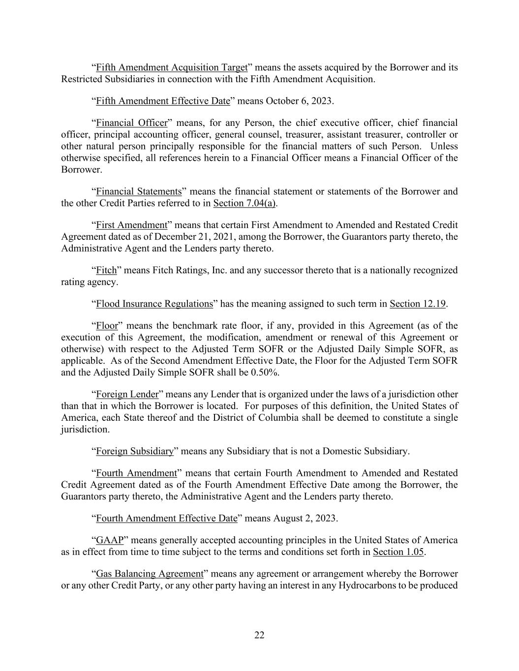 22 “Fifth Amendment Acquisition Target” means the assets acquired by the Borrower and its Restricted Subsidiaries in connection with the Fifth Amendment Acquisition. “Fifth Amendment Effective Date” means October 6, 2023. “Financial Officer” means, for any Person, the chief executive officer, chief financial officer, principal accounting officer, general counsel, treasurer, assistant treasurer, controller or other natural person principally responsible for the financial matters of such Person. Unless otherwise specified, all references herein to a Financial Officer means a Financial Officer of the Borrower. “Financial Statements” means the financial statement or statements of the Borrower and the other Credit Parties referred to in Section 7.04(a). “First Amendment” means that certain First Amendment to Amended and Restated Credit Agreement dated as of December 21, 2021, among the Borrower, the Guarantors party thereto, the Administrative Agent and the Lenders party thereto. “Fitch” means Fitch Ratings, Inc. and any successor thereto that is a nationally recognized rating agency. “Flood Insurance Regulations” has the meaning assigned to such term in Section 12.19. “Floor” means the benchmark rate floor, if any, provided in this Agreement (as of the execution of this Agreement, the modification, amendment or renewal of this Agreement or otherwise) with respect to the Adjusted Term SOFR or the Adjusted Daily Simple SOFR, as applicable. As of the Second Amendment Effective Date, the Floor for the Adjusted Term SOFR and the Adjusted Daily Simple SOFR shall be 0.50%. “Foreign Lender” means any Lender that is organized under the laws of a jurisdiction other than that in which the Borrower is located. For purposes of this definition, the United States of America, each State thereof and the District of Columbia shall be deemed to constitute a single jurisdiction. “Foreign Subsidiary” means any Subsidiary that is not a Domestic Subsidiary. “Fourth Amendment” means that certain Fourth Amendment to Amended and Restated Credit Agreement dated as of the Fourth Amendment Effective Date among the Borrower, the Guarantors party thereto, the Administrative Agent and the Lenders party thereto. “Fourth Amendment Effective Date” means August 2, 2023. “GAAP” means generally accepted accounting principles in the United States of America as in effect from time to time subject to the terms and conditions set forth in Section 1.05. “Gas Balancing Agreement” means any agreement or arrangement whereby the Borrower or any other Credit Party, or any other party having an interest in any Hydrocarbons to be produced