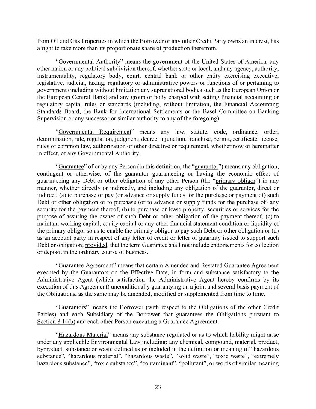 23 from Oil and Gas Properties in which the Borrower or any other Credit Party owns an interest, has a right to take more than its proportionate share of production therefrom. “Governmental Authority” means the government of the United States of America, any other nation or any political subdivision thereof, whether state or local, and any agency, authority, instrumentality, regulatory body, court, central bank or other entity exercising executive, legislative, judicial, taxing, regulatory or administrative powers or functions of or pertaining to government (including without limitation any supranational bodies such as the European Union or the European Central Bank) and any group or body charged with setting financial accounting or regulatory capital rules or standards (including, without limitation, the Financial Accounting Standards Board, the Bank for International Settlements or the Basel Committee on Banking Supervision or any successor or similar authority to any of the foregoing). “Governmental Requirement” means any law, statute, code, ordinance, order, determination, rule, regulation, judgment, decree, injunction, franchise, permit, certificate, license, rules of common law, authorization or other directive or requirement, whether now or hereinafter in effect, of any Governmental Authority. “Guarantee” of or by any Person (in this definition, the “guarantor”) means any obligation, contingent or otherwise, of the guarantor guaranteeing or having the economic effect of guaranteeing any Debt or other obligation of any other Person (the “primary obligor”) in any manner, whether directly or indirectly, and including any obligation of the guarantor, direct or indirect, (a) to purchase or pay (or advance or supply funds for the purchase or payment of) such Debt or other obligation or to purchase (or to advance or supply funds for the purchase of) any security for the payment thereof, (b) to purchase or lease property, securities or services for the purpose of assuring the owner of such Debt or other obligation of the payment thereof, (c) to maintain working capital, equity capital or any other financial statement condition or liquidity of the primary obligor so as to enable the primary obligor to pay such Debt or other obligation or (d) as an account party in respect of any letter of credit or letter of guaranty issued to support such Debt or obligation; provided, that the term Guarantee shall not include endorsements for collection or deposit in the ordinary course of business. “Guarantee Agreement” means that certain Amended and Restated Guarantee Agreement executed by the Guarantors on the Effective Date, in form and substance satisfactory to the Administrative Agent (which satisfaction the Administrative Agent hereby confirms by its execution of this Agreement) unconditionally guarantying on a joint and several basis payment of the Obligations, as the same may be amended, modified or supplemented from time to time. “Guarantors” means the Borrower (with respect to the Obligations of the other Credit Parties) and each Subsidiary of the Borrower that guarantees the Obligations pursuant to Section 8.14(b) and each other Person executing a Guarantee Agreement. “Hazardous Material” means any substance regulated or as to which liability might arise under any applicable Environmental Law including: any chemical, compound, material, product, byproduct, substance or waste defined as or included in the definition or meaning of “hazardous substance”, “hazardous material”, “hazardous waste”, “solid waste”, “toxic waste”, “extremely hazardous substance”, “toxic substance”, “contaminant”, “pollutant”, or words of similar meaning