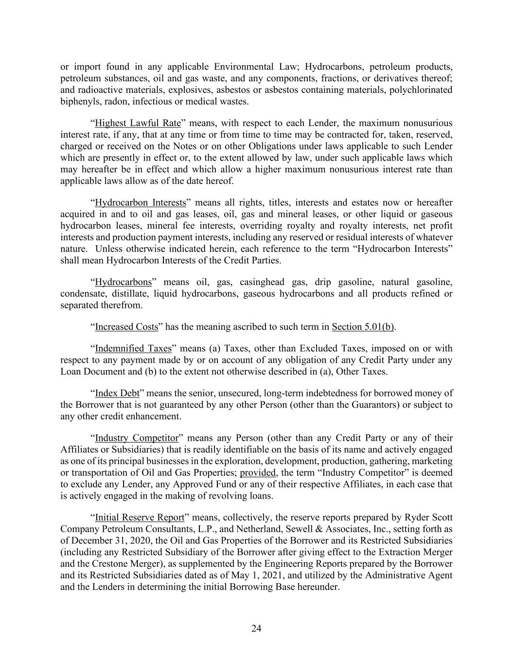 24 or import found in any applicable Environmental Law; Hydrocarbons, petroleum products, petroleum substances, oil and gas waste, and any components, fractions, or derivatives thereof; and radioactive materials, explosives, asbestos or asbestos containing materials, polychlorinated biphenyls, radon, infectious or medical wastes. “Highest Lawful Rate” means, with respect to each Lender, the maximum nonusurious interest rate, if any, that at any time or from time to time may be contracted for, taken, reserved, charged or received on the Notes or on other Obligations under laws applicable to such Lender which are presently in effect or, to the extent allowed by law, under such applicable laws which may hereafter be in effect and which allow a higher maximum nonusurious interest rate than applicable laws allow as of the date hereof. “Hydrocarbon Interests” means all rights, titles, interests and estates now or hereafter acquired in and to oil and gas leases, oil, gas and mineral leases, or other liquid or gaseous hydrocarbon leases, mineral fee interests, overriding royalty and royalty interests, net profit interests and production payment interests, including any reserved or residual interests of whatever nature. Unless otherwise indicated herein, each reference to the term “Hydrocarbon Interests” shall mean Hydrocarbon Interests of the Credit Parties. “Hydrocarbons” means oil, gas, casinghead gas, drip gasoline, natural gasoline, condensate, distillate, liquid hydrocarbons, gaseous hydrocarbons and all products refined or separated therefrom. “Increased Costs” has the meaning ascribed to such term in Section 5.01(b). “Indemnified Taxes” means (a) Taxes, other than Excluded Taxes, imposed on or with respect to any payment made by or on account of any obligation of any Credit Party under any Loan Document and (b) to the extent not otherwise described in (a), Other Taxes. “Index Debt” means the senior, unsecured, long-term indebtedness for borrowed money of the Borrower that is not guaranteed by any other Person (other than the Guarantors) or subject to any other credit enhancement. “Industry Competitor” means any Person (other than any Credit Party or any of their Affiliates or Subsidiaries) that is readily identifiable on the basis of its name and actively engaged as one of its principal businesses in the exploration, development, production, gathering, marketing or transportation of Oil and Gas Properties; provided, the term “Industry Competitor” is deemed to exclude any Lender, any Approved Fund or any of their respective Affiliates, in each case that is actively engaged in the making of revolving loans. “Initial Reserve Report” means, collectively, the reserve reports prepared by Ryder Scott Company Petroleum Consultants, L.P., and Netherland, Sewell & Associates, Inc., setting forth as of December 31, 2020, the Oil and Gas Properties of the Borrower and its Restricted Subsidiaries (including any Restricted Subsidiary of the Borrower after giving effect to the Extraction Merger and the Crestone Merger), as supplemented by the Engineering Reports prepared by the Borrower and its Restricted Subsidiaries dated as of May 1, 2021, and utilized by the Administrative Agent and the Lenders in determining the initial Borrowing Base hereunder.