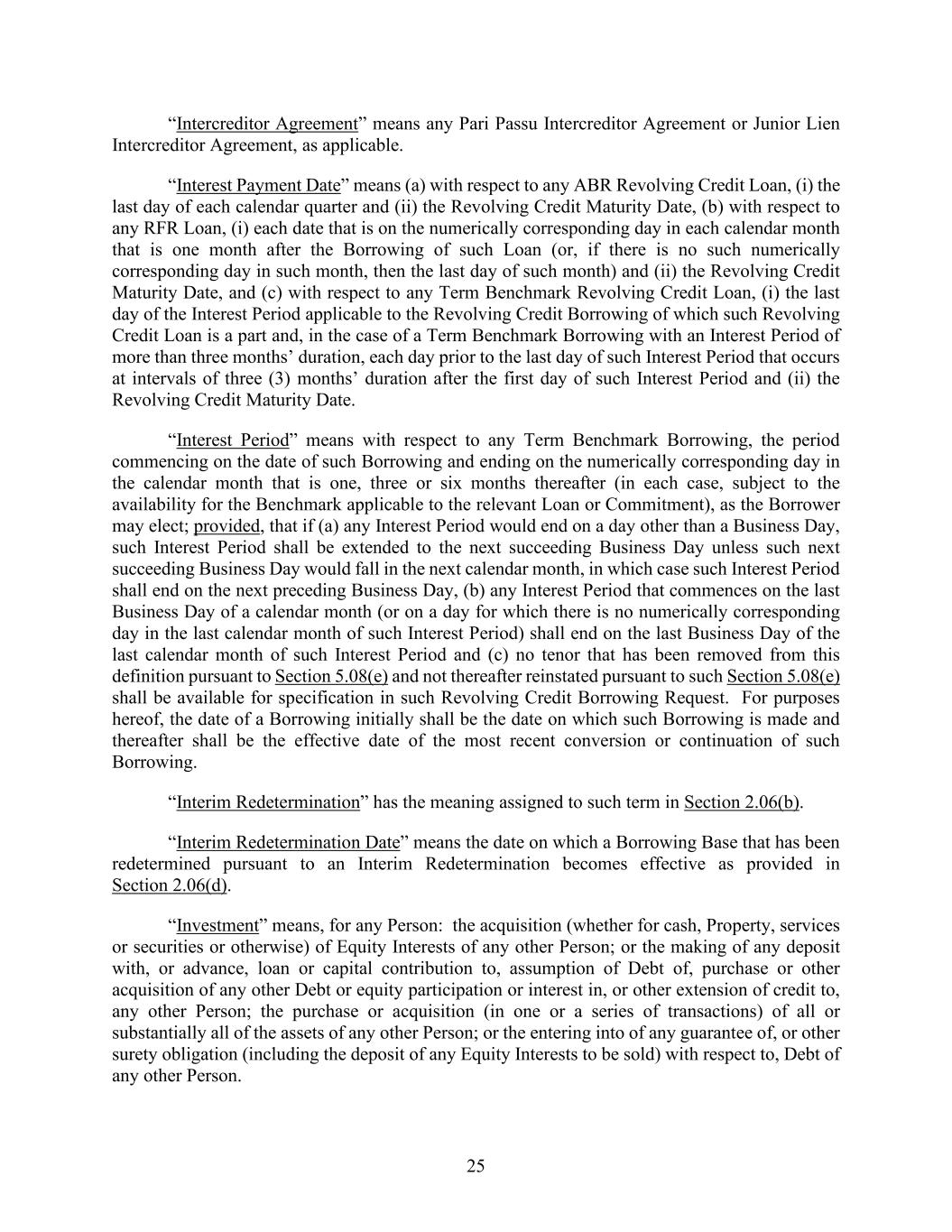 25 “Intercreditor Agreement” means any Pari Passu Intercreditor Agreement or Junior Lien Intercreditor Agreement, as applicable. “Interest Payment Date” means (a) with respect to any ABR Revolving Credit Loan, (i) the last day of each calendar quarter and (ii) the Revolving Credit Maturity Date, (b) with respect to any RFR Loan, (i) each date that is on the numerically corresponding day in each calendar month that is one month after the Borrowing of such Loan (or, if there is no such numerically corresponding day in such month, then the last day of such month) and (ii) the Revolving Credit Maturity Date, and (c) with respect to any Term Benchmark Revolving Credit Loan, (i) the last day of the Interest Period applicable to the Revolving Credit Borrowing of which such Revolving Credit Loan is a part and, in the case of a Term Benchmark Borrowing with an Interest Period of more than three months’ duration, each day prior to the last day of such Interest Period that occurs at intervals of three (3) months’ duration after the first day of such Interest Period and (ii) the Revolving Credit Maturity Date. “Interest Period” means with respect to any Term Benchmark Borrowing, the period commencing on the date of such Borrowing and ending on the numerically corresponding day in the calendar month that is one, three or six months thereafter (in each case, subject to the availability for the Benchmark applicable to the relevant Loan or Commitment), as the Borrower may elect; provided, that if (a) any Interest Period would end on a day other than a Business Day, such Interest Period shall be extended to the next succeeding Business Day unless such next succeeding Business Day would fall in the next calendar month, in which case such Interest Period shall end on the next preceding Business Day, (b) any Interest Period that commences on the last Business Day of a calendar month (or on a day for which there is no numerically corresponding day in the last calendar month of such Interest Period) shall end on the last Business Day of the last calendar month of such Interest Period and (c) no tenor that has been removed from this definition pursuant to Section 5.08(e) and not thereafter reinstated pursuant to such Section 5.08(e) shall be available for specification in such Revolving Credit Borrowing Request. For purposes hereof, the date of a Borrowing initially shall be the date on which such Borrowing is made and thereafter shall be the effective date of the most recent conversion or continuation of such Borrowing. “Interim Redetermination” has the meaning assigned to such term in Section 2.06(b). “Interim Redetermination Date” means the date on which a Borrowing Base that has been redetermined pursuant to an Interim Redetermination becomes effective as provided in Section 2.06(d). “Investment” means, for any Person: the acquisition (whether for cash, Property, services or securities or otherwise) of Equity Interests of any other Person; or the making of any deposit with, or advance, loan or capital contribution to, assumption of Debt of, purchase or other acquisition of any other Debt or equity participation or interest in, or other extension of credit to, any other Person; the purchase or acquisition (in one or a series of transactions) of all or substantially all of the assets of any other Person; or the entering into of any guarantee of, or other surety obligation (including the deposit of any Equity Interests to be sold) with respect to, Debt of any other Person.
