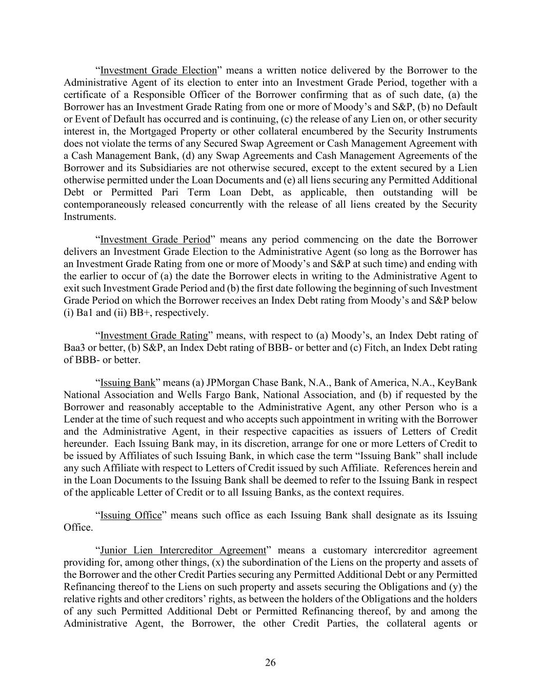 26 “Investment Grade Election” means a written notice delivered by the Borrower to the Administrative Agent of its election to enter into an Investment Grade Period, together with a certificate of a Responsible Officer of the Borrower confirming that as of such date, (a) the Borrower has an Investment Grade Rating from one or more of Moody’s and S&P, (b) no Default or Event of Default has occurred and is continuing, (c) the release of any Lien on, or other security interest in, the Mortgaged Property or other collateral encumbered by the Security Instruments does not violate the terms of any Secured Swap Agreement or Cash Management Agreement with a Cash Management Bank, (d) any Swap Agreements and Cash Management Agreements of the Borrower and its Subsidiaries are not otherwise secured, except to the extent secured by a Lien otherwise permitted under the Loan Documents and (e) all liens securing any Permitted Additional Debt or Permitted Pari Term Loan Debt, as applicable, then outstanding will be contemporaneously released concurrently with the release of all liens created by the Security Instruments. “Investment Grade Period” means any period commencing on the date the Borrower delivers an Investment Grade Election to the Administrative Agent (so long as the Borrower has an Investment Grade Rating from one or more of Moody’s and S&P at such time) and ending with the earlier to occur of (a) the date the Borrower elects in writing to the Administrative Agent to exit such Investment Grade Period and (b) the first date following the beginning of such Investment Grade Period on which the Borrower receives an Index Debt rating from Moody’s and S&P below (i) Ba1 and (ii) BB+, respectively. “Investment Grade Rating” means, with respect to (a) Moody’s, an Index Debt rating of Baa3 or better, (b) S&P, an Index Debt rating of BBB- or better and (c) Fitch, an Index Debt rating of BBB- or better. “Issuing Bank” means (a) JPMorgan Chase Bank, N.A., Bank of America, N.A., KeyBank National Association and Wells Fargo Bank, National Association, and (b) if requested by the Borrower and reasonably acceptable to the Administrative Agent, any other Person who is a Lender at the time of such request and who accepts such appointment in writing with the Borrower and the Administrative Agent, in their respective capacities as issuers of Letters of Credit hereunder. Each Issuing Bank may, in its discretion, arrange for one or more Letters of Credit to be issued by Affiliates of such Issuing Bank, in which case the term “Issuing Bank” shall include any such Affiliate with respect to Letters of Credit issued by such Affiliate. References herein and in the Loan Documents to the Issuing Bank shall be deemed to refer to the Issuing Bank in respect of the applicable Letter of Credit or to all Issuing Banks, as the context requires. “Issuing Office” means such office as each Issuing Bank shall designate as its Issuing Office. “Junior Lien Intercreditor Agreement” means a customary intercreditor agreement providing for, among other things, (x) the subordination of the Liens on the property and assets of the Borrower and the other Credit Parties securing any Permitted Additional Debt or any Permitted Refinancing thereof to the Liens on such property and assets securing the Obligations and (y) the relative rights and other creditors’ rights, as between the holders of the Obligations and the holders of any such Permitted Additional Debt or Permitted Refinancing thereof, by and among the Administrative Agent, the Borrower, the other Credit Parties, the collateral agents or