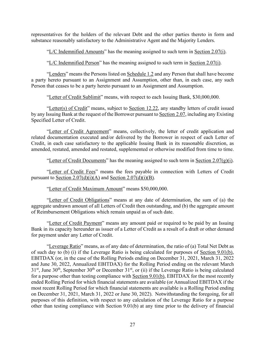 27 representatives for the holders of the relevant Debt and the other parties thereto in form and substance reasonably satisfactory to the Administrative Agent and the Majority Lenders. “L/C Indemnified Amounts” has the meaning assigned to such term in Section 2.07(i). “L/C Indemnified Person” has the meaning assigned to such term in Section 2.07(i). “Lenders” means the Persons listed on Schedule 1.2 and any Person that shall have become a party hereto pursuant to an Assignment and Assumption, other than, in each case, any such Person that ceases to be a party hereto pursuant to an Assignment and Assumption. “Letter of Credit Sublimit” means, with respect to each Issuing Bank, $30,000,000. “Letter(s) of Credit” means, subject to Section 12.22, any standby letters of credit issued by any Issuing Bank at the request of the Borrower pursuant to Section 2.07, including any Existing Specified Letter of Credit. “Letter of Credit Agreement” means, collectively, the letter of credit application and related documentation executed and/or delivered by the Borrower in respect of each Letter of Credit, in each case satisfactory to the applicable Issuing Bank in its reasonable discretion, as amended, restated, amended and restated, supplemented or otherwise modified from time to time. “Letter of Credit Documents” has the meaning assigned to such term in Section 2.07(g)(i). “Letter of Credit Fees” means the fees payable in connection with Letters of Credit pursuant to Section 2.07(d)(i)(A) and Section 2.07(d)(i)(B). “Letter of Credit Maximum Amount” means $50,000,000. “Letter of Credit Obligations” means at any date of determination, the sum of (a) the aggregate undrawn amount of all Letters of Credit then outstanding, and (b) the aggregate amount of Reimbursement Obligations which remain unpaid as of such date. “Letter of Credit Payment” means any amount paid or required to be paid by an Issuing Bank in its capacity hereunder as issuer of a Letter of Credit as a result of a draft or other demand for payment under any Letter of Credit. “Leverage Ratio” means, as of any date of determination, the ratio of (a) Total Net Debt as of such day to (b) (i) if the Leverage Ratio is being calculated for purposes of Section 9.01(b), EBITDAX (or, in the case of the Rolling Periods ending on December 31, 2021, March 31, 2022 and June 30, 2022, Annualized EBITDAX) for the Rolling Period ending on the relevant March 31st, June 30th, September 30th or December 31st, or (ii) if the Leverage Ratio is being calculated for a purpose other than testing compliance with Section 9.01(b), EBITDAX for the most recently ended Rolling Period for which financial statements are available (or Annualized EBITDAX if the most recent Rolling Period for which financial statements are available is a Rolling Period ending on December 31, 2021, March 31, 2022 or June 30, 2022). Notwithstanding the foregoing, for all purposes of this definition, with respect to any calculation of the Leverage Ratio for a purpose other than testing compliance with Section 9.01(b) at any time prior to the delivery of financial