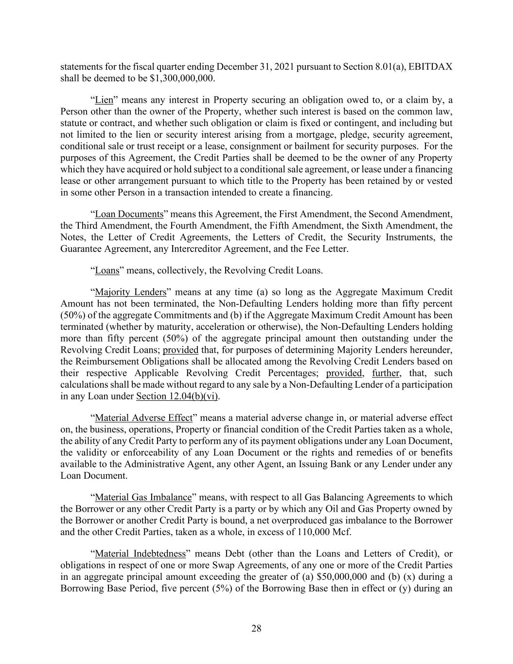 28 statements for the fiscal quarter ending December 31, 2021 pursuant to Section 8.01(a), EBITDAX shall be deemed to be $1,300,000,000. “Lien” means any interest in Property securing an obligation owed to, or a claim by, a Person other than the owner of the Property, whether such interest is based on the common law, statute or contract, and whether such obligation or claim is fixed or contingent, and including but not limited to the lien or security interest arising from a mortgage, pledge, security agreement, conditional sale or trust receipt or a lease, consignment or bailment for security purposes. For the purposes of this Agreement, the Credit Parties shall be deemed to be the owner of any Property which they have acquired or hold subject to a conditional sale agreement, or lease under a financing lease or other arrangement pursuant to which title to the Property has been retained by or vested in some other Person in a transaction intended to create a financing. “Loan Documents” means this Agreement, the First Amendment, the Second Amendment, the Third Amendment, the Fourth Amendment, the Fifth Amendment, the Sixth Amendment, the Notes, the Letter of Credit Agreements, the Letters of Credit, the Security Instruments, the Guarantee Agreement, any Intercreditor Agreement, and the Fee Letter. “Loans” means, collectively, the Revolving Credit Loans. “Majority Lenders” means at any time (a) so long as the Aggregate Maximum Credit Amount has not been terminated, the Non-Defaulting Lenders holding more than fifty percent (50%) of the aggregate Commitments and (b) if the Aggregate Maximum Credit Amount has been terminated (whether by maturity, acceleration or otherwise), the Non-Defaulting Lenders holding more than fifty percent (50%) of the aggregate principal amount then outstanding under the Revolving Credit Loans; provided that, for purposes of determining Majority Lenders hereunder, the Reimbursement Obligations shall be allocated among the Revolving Credit Lenders based on their respective Applicable Revolving Credit Percentages; provided, further, that, such calculations shall be made without regard to any sale by a Non-Defaulting Lender of a participation in any Loan under Section 12.04(b)(vi). “Material Adverse Effect” means a material adverse change in, or material adverse effect on, the business, operations, Property or financial condition of the Credit Parties taken as a whole, the ability of any Credit Party to perform any of its payment obligations under any Loan Document, the validity or enforceability of any Loan Document or the rights and remedies of or benefits available to the Administrative Agent, any other Agent, an Issuing Bank or any Lender under any Loan Document. “Material Gas Imbalance” means, with respect to all Gas Balancing Agreements to which the Borrower or any other Credit Party is a party or by which any Oil and Gas Property owned by the Borrower or another Credit Party is bound, a net overproduced gas imbalance to the Borrower and the other Credit Parties, taken as a whole, in excess of 110,000 Mcf. “Material Indebtedness” means Debt (other than the Loans and Letters of Credit), or obligations in respect of one or more Swap Agreements, of any one or more of the Credit Parties in an aggregate principal amount exceeding the greater of (a) $50,000,000 and (b) (x) during a Borrowing Base Period, five percent (5%) of the Borrowing Base then in effect or (y) during an