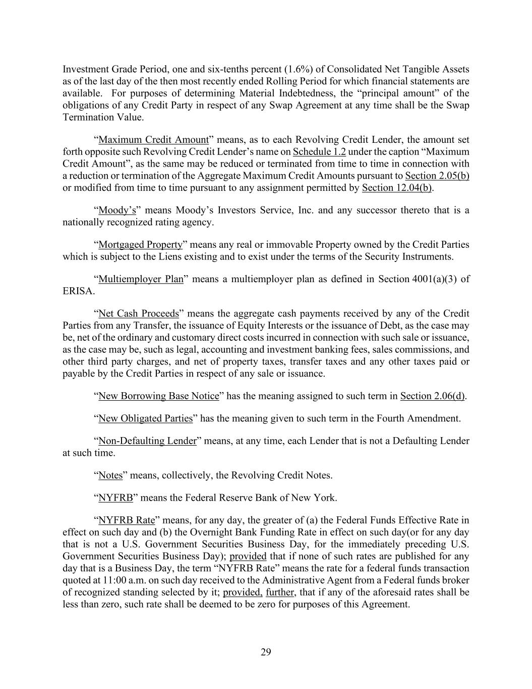 29 Investment Grade Period, one and six-tenths percent (1.6%) of Consolidated Net Tangible Assets as of the last day of the then most recently ended Rolling Period for which financial statements are available. For purposes of determining Material Indebtedness, the “principal amount” of the obligations of any Credit Party in respect of any Swap Agreement at any time shall be the Swap Termination Value. “Maximum Credit Amount” means, as to each Revolving Credit Lender, the amount set forth opposite such Revolving Credit Lender’s name on Schedule 1.2 under the caption “Maximum Credit Amount”, as the same may be reduced or terminated from time to time in connection with a reduction or termination of the Aggregate Maximum Credit Amounts pursuant to Section 2.05(b) or modified from time to time pursuant to any assignment permitted by Section 12.04(b). “Moody’s” means Moody’s Investors Service, Inc. and any successor thereto that is a nationally recognized rating agency. “Mortgaged Property” means any real or immovable Property owned by the Credit Parties which is subject to the Liens existing and to exist under the terms of the Security Instruments. “Multiemployer Plan” means a multiemployer plan as defined in Section 4001(a)(3) of ERISA. “Net Cash Proceeds” means the aggregate cash payments received by any of the Credit Parties from any Transfer, the issuance of Equity Interests or the issuance of Debt, as the case may be, net of the ordinary and customary direct costs incurred in connection with such sale or issuance, as the case may be, such as legal, accounting and investment banking fees, sales commissions, and other third party charges, and net of property taxes, transfer taxes and any other taxes paid or payable by the Credit Parties in respect of any sale or issuance. “New Borrowing Base Notice” has the meaning assigned to such term in Section 2.06(d). “New Obligated Parties” has the meaning given to such term in the Fourth Amendment. “Non-Defaulting Lender” means, at any time, each Lender that is not a Defaulting Lender at such time. “Notes” means, collectively, the Revolving Credit Notes. “NYFRB” means the Federal Reserve Bank of New York. “NYFRB Rate” means, for any day, the greater of (a) the Federal Funds Effective Rate in effect on such day and (b) the Overnight Bank Funding Rate in effect on such day(or for any day that is not a U.S. Government Securities Business Day, for the immediately preceding U.S. Government Securities Business Day); provided that if none of such rates are published for any day that is a Business Day, the term “NYFRB Rate” means the rate for a federal funds transaction quoted at 11:00 a.m. on such day received to the Administrative Agent from a Federal funds broker of recognized standing selected by it; provided, further, that if any of the aforesaid rates shall be less than zero, such rate shall be deemed to be zero for purposes of this Agreement.