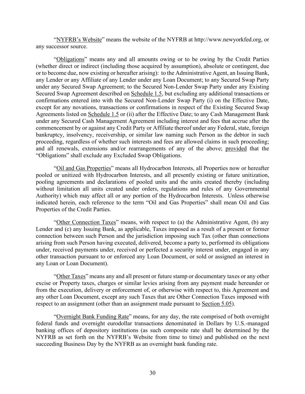30 “NYFRB’s Website” means the website of the NYFRB at http://www.newyorkfed.org, or any successor source. “Obligations” means any and all amounts owing or to be owing by the Credit Parties (whether direct or indirect (including those acquired by assumption), absolute or contingent, due or to become due, now existing or hereafter arising): to the Administrative Agent, an Issuing Bank, any Lender or any Affiliate of any Lender under any Loan Document; to any Secured Swap Party under any Secured Swap Agreement; to the Secured Non-Lender Swap Party under any Existing Secured Swap Agreement described on Schedule 1.5, but excluding any additional transactions or confirmations entered into with the Secured Non-Lender Swap Party (i) on the Effective Date, except for any novations, transactions or confirmations in respect of the Existing Secured Swap Agreements listed on Schedule 1.5 or (ii) after the Effective Date; to any Cash Management Bank under any Secured Cash Management Agreement including interest and fees that accrue after the commencement by or against any Credit Party or Affiliate thereof under any Federal, state, foreign bankruptcy, insolvency, receivership, or similar law naming such Person as the debtor in such proceeding, regardless of whether such interests and fees are allowed claims in such proceeding; and all renewals, extensions and/or rearrangements of any of the above; provided that the “Obligations” shall exclude any Excluded Swap Obligations. “Oil and Gas Properties” means all Hydrocarbon Interests, all Properties now or hereafter pooled or unitized with Hydrocarbon Interests, and all presently existing or future unitization, pooling agreements and declarations of pooled units and the units created thereby (including without limitation all units created under orders, regulations and rules of any Governmental Authority) which may affect all or any portion of the Hydrocarbon Interests. Unless otherwise indicated herein, each reference to the term “Oil and Gas Properties” shall mean Oil and Gas Properties of the Credit Parties. “Other Connection Taxes” means, with respect to (a) the Administrative Agent, (b) any Lender and (c) any Issuing Bank, as applicable, Taxes imposed as a result of a present or former connection between such Person and the jurisdiction imposing such Tax (other than connections arising from such Person having executed, delivered, become a party to, performed its obligations under, received payments under, received or perfected a security interest under, engaged in any other transaction pursuant to or enforced any Loan Document, or sold or assigned an interest in any Loan or Loan Document). “Other Taxes” means any and all present or future stamp or documentary taxes or any other excise or Property taxes, charges or similar levies arising from any payment made hereunder or from the execution, delivery or enforcement of, or otherwise with respect to, this Agreement and any other Loan Document, except any such Taxes that are Other Connection Taxes imposed with respect to an assignment (other than an assignment made pursuant to Section 5.05). “Overnight Bank Funding Rate” means, for any day, the rate comprised of both overnight federal funds and overnight eurodollar transactions denominated in Dollars by U.S.-managed banking offices of depository institutions (as such composite rate shall be determined by the NYFRB as set forth on the NYFRB’s Website from time to time) and published on the next succeeding Business Day by the NYFRB as an overnight bank funding rate.