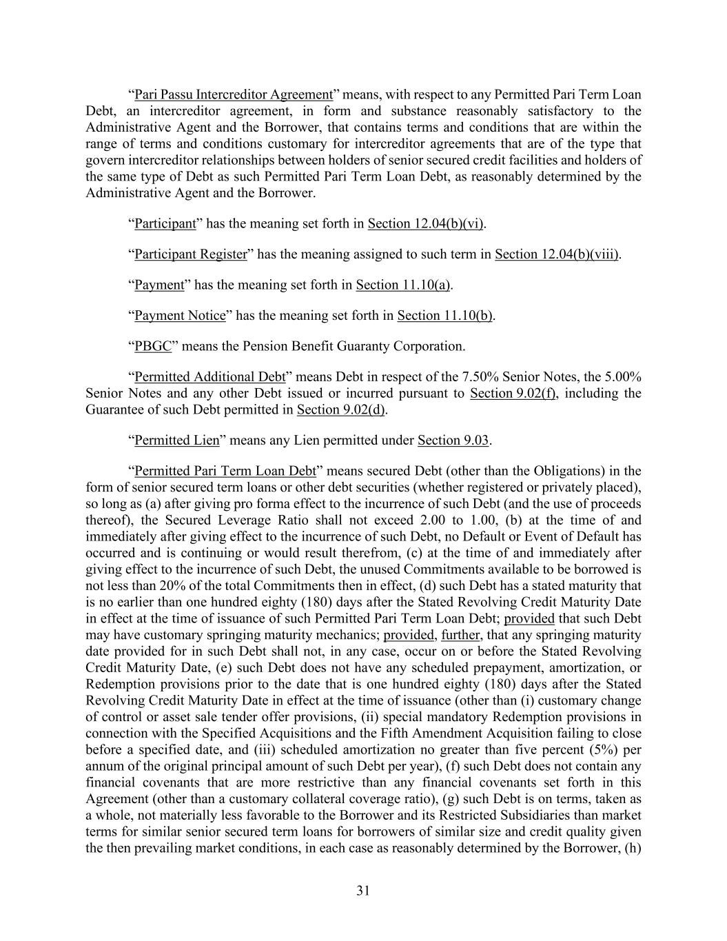 31 “Pari Passu Intercreditor Agreement” means, with respect to any Permitted Pari Term Loan Debt, an intercreditor agreement, in form and substance reasonably satisfactory to the Administrative Agent and the Borrower, that contains terms and conditions that are within the range of terms and conditions customary for intercreditor agreements that are of the type that govern intercreditor relationships between holders of senior secured credit facilities and holders of the same type of Debt as such Permitted Pari Term Loan Debt, as reasonably determined by the Administrative Agent and the Borrower. “Participant” has the meaning set forth in Section 12.04(b)(vi). “Participant Register” has the meaning assigned to such term in Section 12.04(b)(viii). “Payment” has the meaning set forth in Section 11.10(a). “Payment Notice” has the meaning set forth in Section 11.10(b). “PBGC” means the Pension Benefit Guaranty Corporation. “Permitted Additional Debt” means Debt in respect of the 7.50% Senior Notes, the 5.00% Senior Notes and any other Debt issued or incurred pursuant to Section 9.02(f), including the Guarantee of such Debt permitted in Section 9.02(d). “Permitted Lien” means any Lien permitted under Section 9.03. “Permitted Pari Term Loan Debt” means secured Debt (other than the Obligations) in the form of senior secured term loans or other debt securities (whether registered or privately placed), so long as (a) after giving pro forma effect to the incurrence of such Debt (and the use of proceeds thereof), the Secured Leverage Ratio shall not exceed 2.00 to 1.00, (b) at the time of and immediately after giving effect to the incurrence of such Debt, no Default or Event of Default has occurred and is continuing or would result therefrom, (c) at the time of and immediately after giving effect to the incurrence of such Debt, the unused Commitments available to be borrowed is not less than 20% of the total Commitments then in effect, (d) such Debt has a stated maturity that is no earlier than one hundred eighty (180) days after the Stated Revolving Credit Maturity Date in effect at the time of issuance of such Permitted Pari Term Loan Debt; provided that such Debt may have customary springing maturity mechanics; provided, further, that any springing maturity date provided for in such Debt shall not, in any case, occur on or before the Stated Revolving Credit Maturity Date, (e) such Debt does not have any scheduled prepayment, amortization, or Redemption provisions prior to the date that is one hundred eighty (180) days after the Stated Revolving Credit Maturity Date in effect at the time of issuance (other than (i) customary change of control or asset sale tender offer provisions, (ii) special mandatory Redemption provisions in connection with the Specified Acquisitions and the Fifth Amendment Acquisition failing to close before a specified date, and (iii) scheduled amortization no greater than five percent (5%) per annum of the original principal amount of such Debt per year), (f) such Debt does not contain any financial covenants that are more restrictive than any financial covenants set forth in this Agreement (other than a customary collateral coverage ratio), (g) such Debt is on terms, taken as a whole, not materially less favorable to the Borrower and its Restricted Subsidiaries than market terms for similar senior secured term loans for borrowers of similar size and credit quality given the then prevailing market conditions, in each case as reasonably determined by the Borrower, (h)