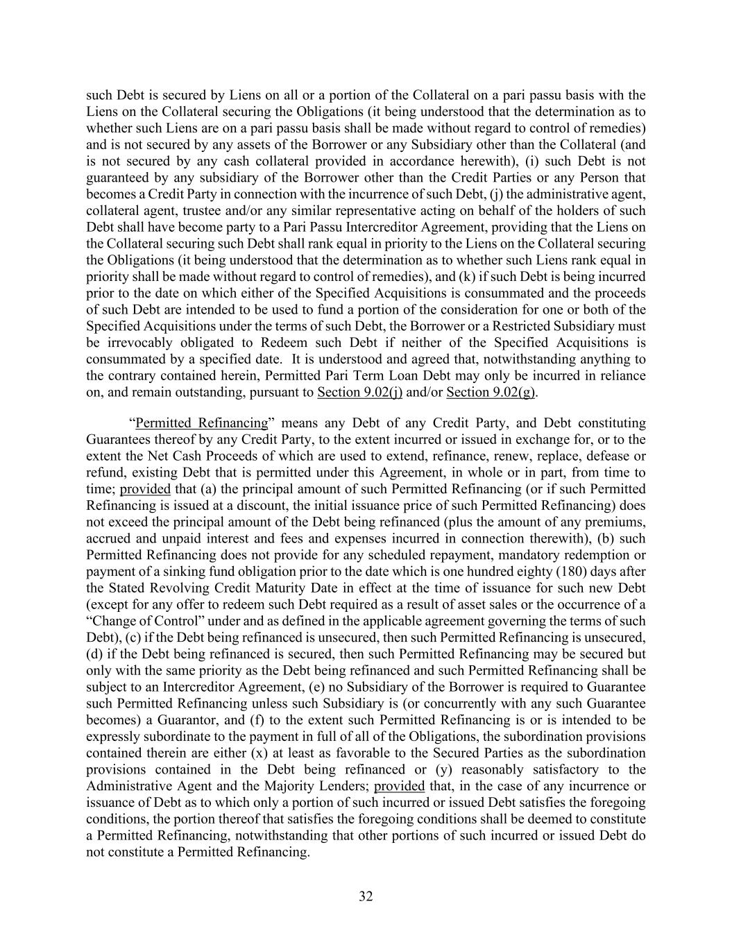 32 such Debt is secured by Liens on all or a portion of the Collateral on a pari passu basis with the Liens on the Collateral securing the Obligations (it being understood that the determination as to whether such Liens are on a pari passu basis shall be made without regard to control of remedies) and is not secured by any assets of the Borrower or any Subsidiary other than the Collateral (and is not secured by any cash collateral provided in accordance herewith), (i) such Debt is not guaranteed by any subsidiary of the Borrower other than the Credit Parties or any Person that becomes a Credit Party in connection with the incurrence of such Debt, (j) the administrative agent, collateral agent, trustee and/or any similar representative acting on behalf of the holders of such Debt shall have become party to a Pari Passu Intercreditor Agreement, providing that the Liens on the Collateral securing such Debt shall rank equal in priority to the Liens on the Collateral securing the Obligations (it being understood that the determination as to whether such Liens rank equal in priority shall be made without regard to control of remedies), and (k) if such Debt is being incurred prior to the date on which either of the Specified Acquisitions is consummated and the proceeds of such Debt are intended to be used to fund a portion of the consideration for one or both of the Specified Acquisitions under the terms of such Debt, the Borrower or a Restricted Subsidiary must be irrevocably obligated to Redeem such Debt if neither of the Specified Acquisitions is consummated by a specified date. It is understood and agreed that, notwithstanding anything to the contrary contained herein, Permitted Pari Term Loan Debt may only be incurred in reliance on, and remain outstanding, pursuant to Section 9.02(j) and/or Section 9.02(g). “Permitted Refinancing” means any Debt of any Credit Party, and Debt constituting Guarantees thereof by any Credit Party, to the extent incurred or issued in exchange for, or to the extent the Net Cash Proceeds of which are used to extend, refinance, renew, replace, defease or refund, existing Debt that is permitted under this Agreement, in whole or in part, from time to time; provided that (a) the principal amount of such Permitted Refinancing (or if such Permitted Refinancing is issued at a discount, the initial issuance price of such Permitted Refinancing) does not exceed the principal amount of the Debt being refinanced (plus the amount of any premiums, accrued and unpaid interest and fees and expenses incurred in connection therewith), (b) such Permitted Refinancing does not provide for any scheduled repayment, mandatory redemption or payment of a sinking fund obligation prior to the date which is one hundred eighty (180) days after the Stated Revolving Credit Maturity Date in effect at the time of issuance for such new Debt (except for any offer to redeem such Debt required as a result of asset sales or the occurrence of a “Change of Control” under and as defined in the applicable agreement governing the terms of such Debt), (c) if the Debt being refinanced is unsecured, then such Permitted Refinancing is unsecured, (d) if the Debt being refinanced is secured, then such Permitted Refinancing may be secured but only with the same priority as the Debt being refinanced and such Permitted Refinancing shall be subject to an Intercreditor Agreement, (e) no Subsidiary of the Borrower is required to Guarantee such Permitted Refinancing unless such Subsidiary is (or concurrently with any such Guarantee becomes) a Guarantor, and (f) to the extent such Permitted Refinancing is or is intended to be expressly subordinate to the payment in full of all of the Obligations, the subordination provisions contained therein are either (x) at least as favorable to the Secured Parties as the subordination provisions contained in the Debt being refinanced or (y) reasonably satisfactory to the Administrative Agent and the Majority Lenders; provided that, in the case of any incurrence or issuance of Debt as to which only a portion of such incurred or issued Debt satisfies the foregoing conditions, the portion thereof that satisfies the foregoing conditions shall be deemed to constitute a Permitted Refinancing, notwithstanding that other portions of such incurred or issued Debt do not constitute a Permitted Refinancing.