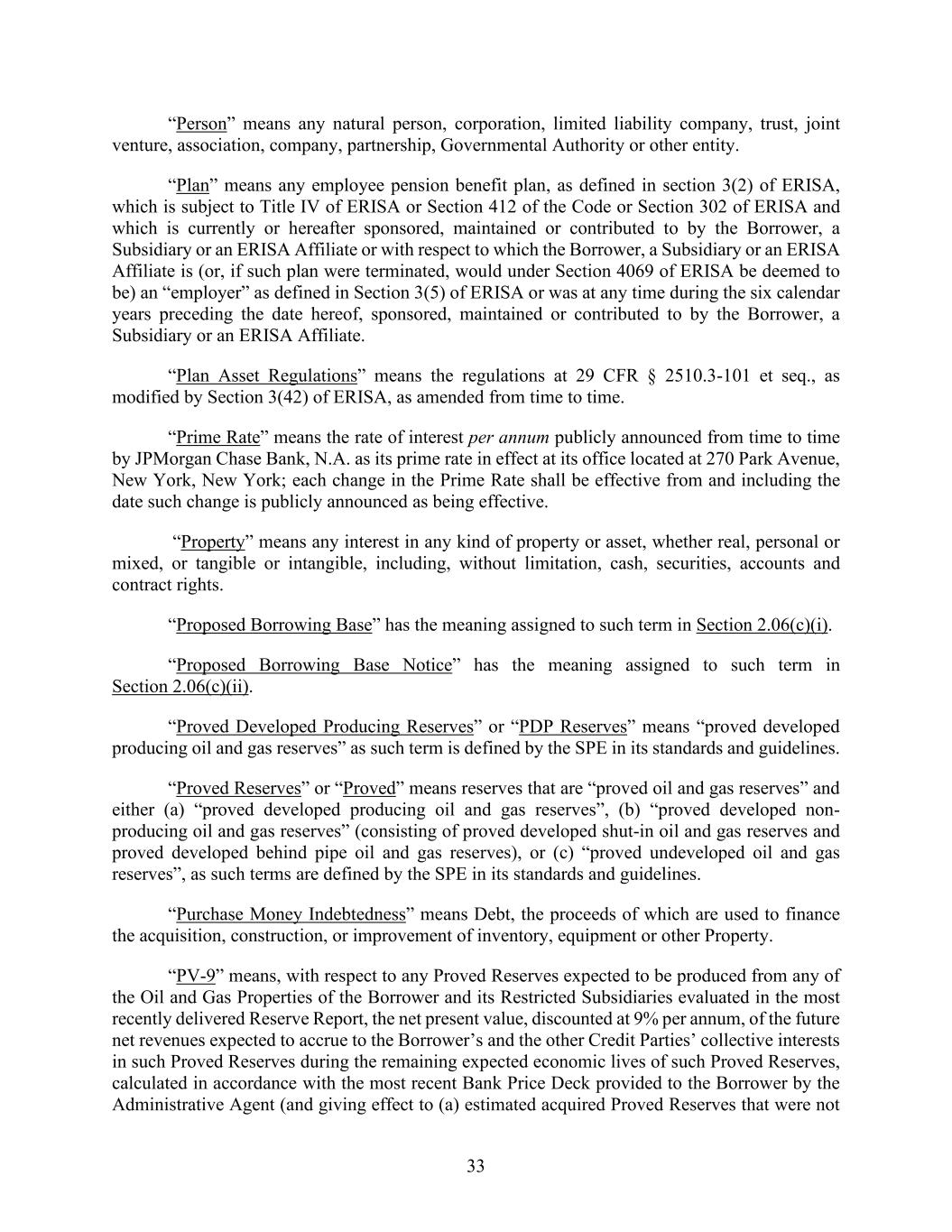 33 “Person” means any natural person, corporation, limited liability company, trust, joint venture, association, company, partnership, Governmental Authority or other entity. “Plan” means any employee pension benefit plan, as defined in section 3(2) of ERISA, which is subject to Title IV of ERISA or Section 412 of the Code or Section 302 of ERISA and which is currently or hereafter sponsored, maintained or contributed to by the Borrower, a Subsidiary or an ERISA Affiliate or with respect to which the Borrower, a Subsidiary or an ERISA Affiliate is (or, if such plan were terminated, would under Section 4069 of ERISA be deemed to be) an “employer” as defined in Section 3(5) of ERISA or was at any time during the six calendar years preceding the date hereof, sponsored, maintained or contributed to by the Borrower, a Subsidiary or an ERISA Affiliate. “Plan Asset Regulations” means the regulations at 29 CFR § 2510.3-101 et seq., as modified by Section 3(42) of ERISA, as amended from time to time. “Prime Rate” means the rate of interest per annum publicly announced from time to time by JPMorgan Chase Bank, N.A. as its prime rate in effect at its office located at 270 Park Avenue, New York, New York; each change in the Prime Rate shall be effective from and including the date such change is publicly announced as being effective. “Property” means any interest in any kind of property or asset, whether real, personal or mixed, or tangible or intangible, including, without limitation, cash, securities, accounts and contract rights. “Proposed Borrowing Base” has the meaning assigned to such term in Section 2.06(c)(i). “Proposed Borrowing Base Notice” has the meaning assigned to such term in Section 2.06(c)(ii). “Proved Developed Producing Reserves” or “PDP Reserves” means “proved developed producing oil and gas reserves” as such term is defined by the SPE in its standards and guidelines. “Proved Reserves” or “Proved” means reserves that are “proved oil and gas reserves” and either (a) “proved developed producing oil and gas reserves”, (b) “proved developed non- producing oil and gas reserves” (consisting of proved developed shut-in oil and gas reserves and proved developed behind pipe oil and gas reserves), or (c) “proved undeveloped oil and gas reserves”, as such terms are defined by the SPE in its standards and guidelines. “Purchase Money Indebtedness” means Debt, the proceeds of which are used to finance the acquisition, construction, or improvement of inventory, equipment or other Property. “PV-9” means, with respect to any Proved Reserves expected to be produced from any of the Oil and Gas Properties of the Borrower and its Restricted Subsidiaries evaluated in the most recently delivered Reserve Report, the net present value, discounted at 9% per annum, of the future net revenues expected to accrue to the Borrower’s and the other Credit Parties’ collective interests in such Proved Reserves during the remaining expected economic lives of such Proved Reserves, calculated in accordance with the most recent Bank Price Deck provided to the Borrower by the Administrative Agent (and giving effect to (a) estimated acquired Proved Reserves that were not