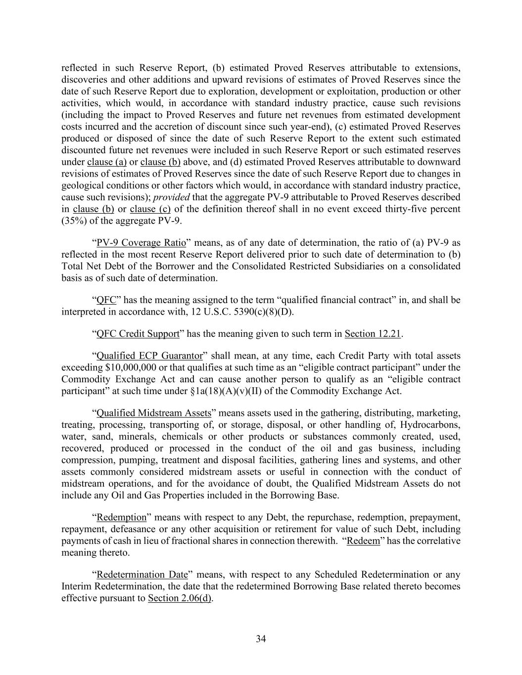 34 reflected in such Reserve Report, (b) estimated Proved Reserves attributable to extensions, discoveries and other additions and upward revisions of estimates of Proved Reserves since the date of such Reserve Report due to exploration, development or exploitation, production or other activities, which would, in accordance with standard industry practice, cause such revisions (including the impact to Proved Reserves and future net revenues from estimated development costs incurred and the accretion of discount since such year-end), (c) estimated Proved Reserves produced or disposed of since the date of such Reserve Report to the extent such estimated discounted future net revenues were included in such Reserve Report or such estimated reserves under clause (a) or clause (b) above, and (d) estimated Proved Reserves attributable to downward revisions of estimates of Proved Reserves since the date of such Reserve Report due to changes in geological conditions or other factors which would, in accordance with standard industry practice, cause such revisions); provided that the aggregate PV-9 attributable to Proved Reserves described in clause (b) or clause (c) of the definition thereof shall in no event exceed thirty-five percent (35%) of the aggregate PV-9. “PV-9 Coverage Ratio” means, as of any date of determination, the ratio of (a) PV-9 as reflected in the most recent Reserve Report delivered prior to such date of determination to (b) Total Net Debt of the Borrower and the Consolidated Restricted Subsidiaries on a consolidated basis as of such date of determination. “QFC” has the meaning assigned to the term “qualified financial contract” in, and shall be interpreted in accordance with, 12 U.S.C. 5390(c)(8)(D). “QFC Credit Support” has the meaning given to such term in Section 12.21. “Qualified ECP Guarantor” shall mean, at any time, each Credit Party with total assets exceeding $10,000,000 or that qualifies at such time as an “eligible contract participant” under the Commodity Exchange Act and can cause another person to qualify as an “eligible contract participant” at such time under §1a(18)(A)(v)(II) of the Commodity Exchange Act. “Qualified Midstream Assets” means assets used in the gathering, distributing, marketing, treating, processing, transporting of, or storage, disposal, or other handling of, Hydrocarbons, water, sand, minerals, chemicals or other products or substances commonly created, used, recovered, produced or processed in the conduct of the oil and gas business, including compression, pumping, treatment and disposal facilities, gathering lines and systems, and other assets commonly considered midstream assets or useful in connection with the conduct of midstream operations, and for the avoidance of doubt, the Qualified Midstream Assets do not include any Oil and Gas Properties included in the Borrowing Base. “Redemption” means with respect to any Debt, the repurchase, redemption, prepayment, repayment, defeasance or any other acquisition or retirement for value of such Debt, including payments of cash in lieu of fractional shares in connection therewith. “Redeem” has the correlative meaning thereto. “Redetermination Date” means, with respect to any Scheduled Redetermination or any Interim Redetermination, the date that the redetermined Borrowing Base related thereto becomes effective pursuant to Section 2.06(d).