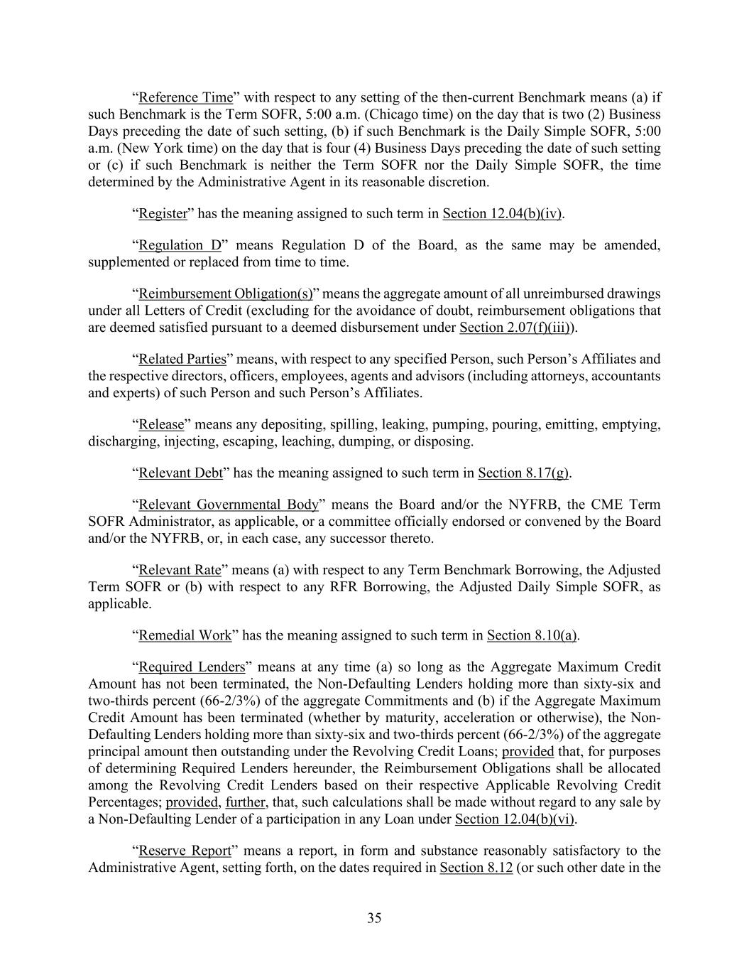 35 “Reference Time” with respect to any setting of the then-current Benchmark means (a) if such Benchmark is the Term SOFR, 5:00 a.m. (Chicago time) on the day that is two (2) Business Days preceding the date of such setting, (b) if such Benchmark is the Daily Simple SOFR, 5:00 a.m. (New York time) on the day that is four (4) Business Days preceding the date of such setting or (c) if such Benchmark is neither the Term SOFR nor the Daily Simple SOFR, the time determined by the Administrative Agent in its reasonable discretion. “Register” has the meaning assigned to such term in Section 12.04(b)(iv). “Regulation D” means Regulation D of the Board, as the same may be amended, supplemented or replaced from time to time. “Reimbursement Obligation(s)” means the aggregate amount of all unreimbursed drawings under all Letters of Credit (excluding for the avoidance of doubt, reimbursement obligations that are deemed satisfied pursuant to a deemed disbursement under Section 2.07(f)(iii)). “Related Parties” means, with respect to any specified Person, such Person’s Affiliates and the respective directors, officers, employees, agents and advisors (including attorneys, accountants and experts) of such Person and such Person’s Affiliates. “Release” means any depositing, spilling, leaking, pumping, pouring, emitting, emptying, discharging, injecting, escaping, leaching, dumping, or disposing. “Relevant Debt” has the meaning assigned to such term in Section 8.17(g). “Relevant Governmental Body” means the Board and/or the NYFRB, the CME Term SOFR Administrator, as applicable, or a committee officially endorsed or convened by the Board and/or the NYFRB, or, in each case, any successor thereto. “Relevant Rate” means (a) with respect to any Term Benchmark Borrowing, the Adjusted Term SOFR or (b) with respect to any RFR Borrowing, the Adjusted Daily Simple SOFR, as applicable. “Remedial Work” has the meaning assigned to such term in Section 8.10(a). “Required Lenders” means at any time (a) so long as the Aggregate Maximum Credit Amount has not been terminated, the Non-Defaulting Lenders holding more than sixty-six and two-thirds percent (66-2/3%) of the aggregate Commitments and (b) if the Aggregate Maximum Credit Amount has been terminated (whether by maturity, acceleration or otherwise), the Non- Defaulting Lenders holding more than sixty-six and two-thirds percent (66-2/3%) of the aggregate principal amount then outstanding under the Revolving Credit Loans; provided that, for purposes of determining Required Lenders hereunder, the Reimbursement Obligations shall be allocated among the Revolving Credit Lenders based on their respective Applicable Revolving Credit Percentages; provided, further, that, such calculations shall be made without regard to any sale by a Non-Defaulting Lender of a participation in any Loan under Section 12.04(b)(vi). “Reserve Report” means a report, in form and substance reasonably satisfactory to the Administrative Agent, setting forth, on the dates required in Section 8.12 (or such other date in the