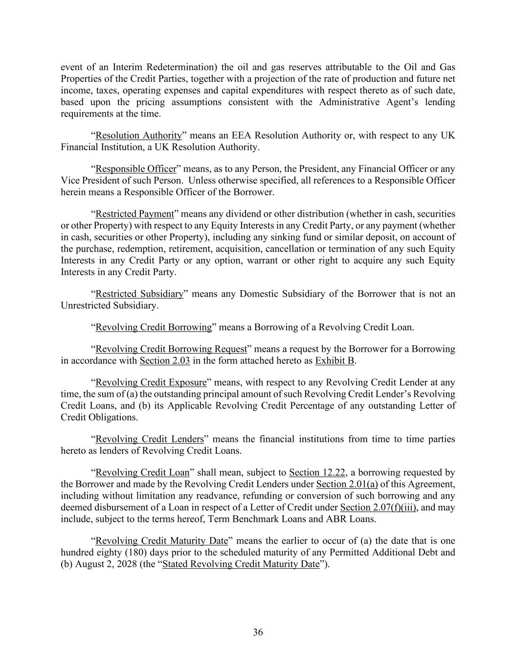 36 event of an Interim Redetermination) the oil and gas reserves attributable to the Oil and Gas Properties of the Credit Parties, together with a projection of the rate of production and future net income, taxes, operating expenses and capital expenditures with respect thereto as of such date, based upon the pricing assumptions consistent with the Administrative Agent’s lending requirements at the time. “Resolution Authority” means an EEA Resolution Authority or, with respect to any UK Financial Institution, a UK Resolution Authority. “Responsible Officer” means, as to any Person, the President, any Financial Officer or any Vice President of such Person. Unless otherwise specified, all references to a Responsible Officer herein means a Responsible Officer of the Borrower. “Restricted Payment” means any dividend or other distribution (whether in cash, securities or other Property) with respect to any Equity Interests in any Credit Party, or any payment (whether in cash, securities or other Property), including any sinking fund or similar deposit, on account of the purchase, redemption, retirement, acquisition, cancellation or termination of any such Equity Interests in any Credit Party or any option, warrant or other right to acquire any such Equity Interests in any Credit Party. “Restricted Subsidiary” means any Domestic Subsidiary of the Borrower that is not an Unrestricted Subsidiary. “Revolving Credit Borrowing” means a Borrowing of a Revolving Credit Loan. “Revolving Credit Borrowing Request” means a request by the Borrower for a Borrowing in accordance with Section 2.03 in the form attached hereto as Exhibit B. “Revolving Credit Exposure” means, with respect to any Revolving Credit Lender at any time, the sum of (a) the outstanding principal amount of such Revolving Credit Lender’s Revolving Credit Loans, and (b) its Applicable Revolving Credit Percentage of any outstanding Letter of Credit Obligations. “Revolving Credit Lenders” means the financial institutions from time to time parties hereto as lenders of Revolving Credit Loans. “Revolving Credit Loan” shall mean, subject to Section 12.22, a borrowing requested by the Borrower and made by the Revolving Credit Lenders under Section 2.01(a) of this Agreement, including without limitation any readvance, refunding or conversion of such borrowing and any deemed disbursement of a Loan in respect of a Letter of Credit under Section 2.07(f)(iii), and may include, subject to the terms hereof, Term Benchmark Loans and ABR Loans. “Revolving Credit Maturity Date” means the earlier to occur of (a) the date that is one hundred eighty (180) days prior to the scheduled maturity of any Permitted Additional Debt and (b) August 2, 2028 (the “Stated Revolving Credit Maturity Date”).