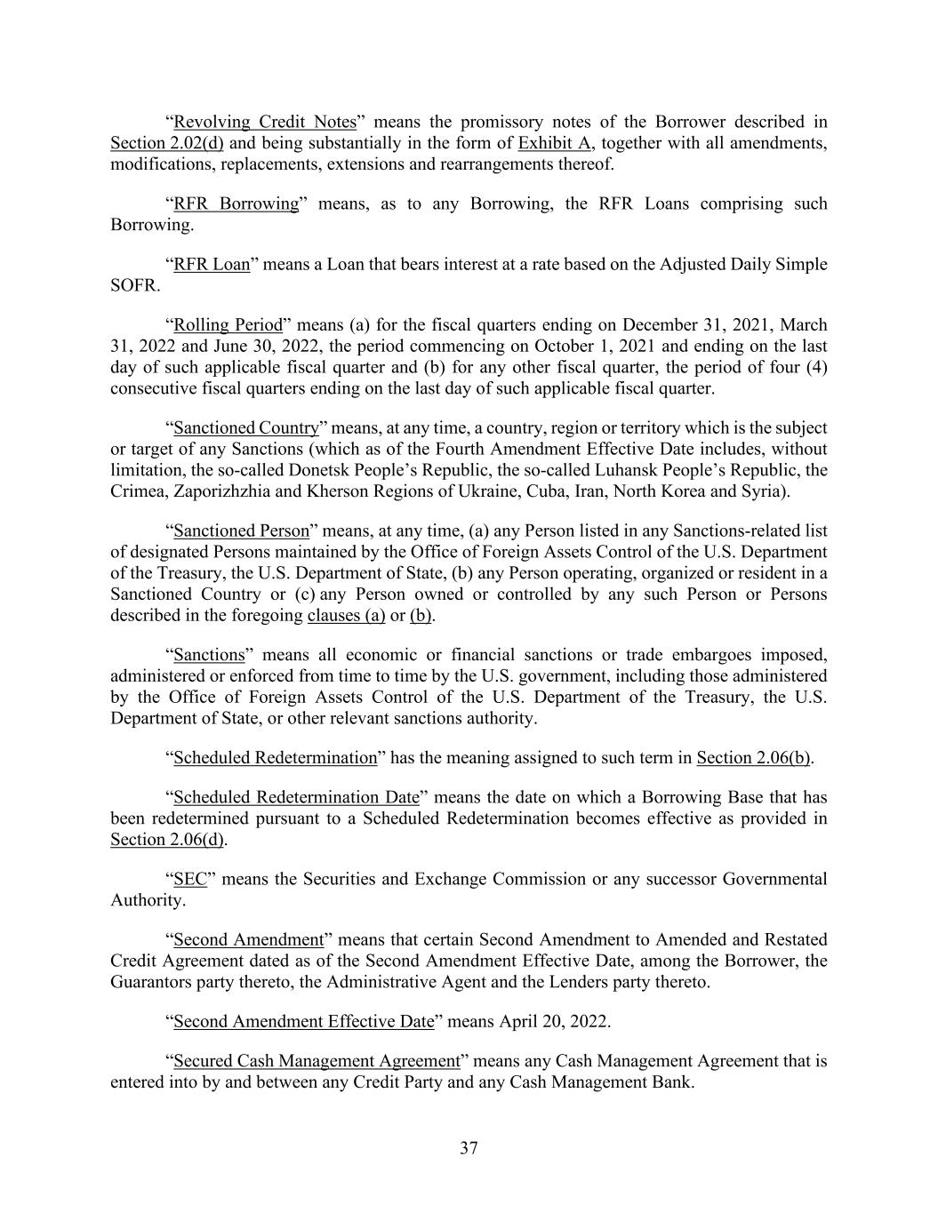 37 “Revolving Credit Notes” means the promissory notes of the Borrower described in Section 2.02(d) and being substantially in the form of Exhibit A, together with all amendments, modifications, replacements, extensions and rearrangements thereof. “RFR Borrowing” means, as to any Borrowing, the RFR Loans comprising such Borrowing. “RFR Loan” means a Loan that bears interest at a rate based on the Adjusted Daily Simple SOFR. “Rolling Period” means (a) for the fiscal quarters ending on December 31, 2021, March 31, 2022 and June 30, 2022, the period commencing on October 1, 2021 and ending on the last day of such applicable fiscal quarter and (b) for any other fiscal quarter, the period of four (4) consecutive fiscal quarters ending on the last day of such applicable fiscal quarter. “Sanctioned Country” means, at any time, a country, region or territory which is the subject or target of any Sanctions (which as of the Fourth Amendment Effective Date includes, without limitation, the so-called Donetsk People’s Republic, the so-called Luhansk People’s Republic, the Crimea, Zaporizhzhia and Kherson Regions of Ukraine, Cuba, Iran, North Korea and Syria). “Sanctioned Person” means, at any time, (a) any Person listed in any Sanctions-related list of designated Persons maintained by the Office of Foreign Assets Control of the U.S. Department of the Treasury, the U.S. Department of State, (b) any Person operating, organized or resident in a Sanctioned Country or (c) any Person owned or controlled by any such Person or Persons described in the foregoing clauses (a) or (b). “Sanctions” means all economic or financial sanctions or trade embargoes imposed, administered or enforced from time to time by the U.S. government, including those administered by the Office of Foreign Assets Control of the U.S. Department of the Treasury, the U.S. Department of State, or other relevant sanctions authority. “Scheduled Redetermination” has the meaning assigned to such term in Section 2.06(b). “Scheduled Redetermination Date” means the date on which a Borrowing Base that has been redetermined pursuant to a Scheduled Redetermination becomes effective as provided in Section 2.06(d). “SEC” means the Securities and Exchange Commission or any successor Governmental Authority. “Second Amendment” means that certain Second Amendment to Amended and Restated Credit Agreement dated as of the Second Amendment Effective Date, among the Borrower, the Guarantors party thereto, the Administrative Agent and the Lenders party thereto. “Second Amendment Effective Date” means April 20, 2022. “Secured Cash Management Agreement” means any Cash Management Agreement that is entered into by and between any Credit Party and any Cash Management Bank.