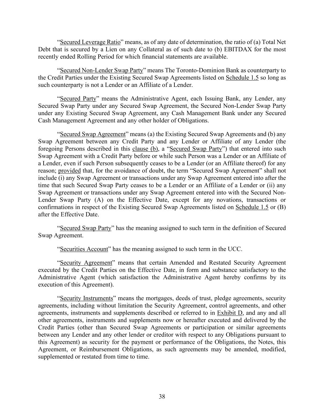 38 “Secured Leverage Ratio” means, as of any date of determination, the ratio of (a) Total Net Debt that is secured by a Lien on any Collateral as of such date to (b) EBITDAX for the most recently ended Rolling Period for which financial statements are available. “Secured Non-Lender Swap Party” means The Toronto-Dominion Bank as counterparty to the Credit Parties under the Existing Secured Swap Agreements listed on Schedule 1.5 so long as such counterparty is not a Lender or an Affiliate of a Lender. “Secured Party” means the Administrative Agent, each Issuing Bank, any Lender, any Secured Swap Party under any Secured Swap Agreement, the Secured Non-Lender Swap Party under any Existing Secured Swap Agreement, any Cash Management Bank under any Secured Cash Management Agreement and any other holder of Obligations. “Secured Swap Agreement” means (a) the Existing Secured Swap Agreements and (b) any Swap Agreement between any Credit Party and any Lender or Affiliate of any Lender (the foregoing Persons described in this clause (b), a “Secured Swap Party”) that entered into such Swap Agreement with a Credit Party before or while such Person was a Lender or an Affiliate of a Lender, even if such Person subsequently ceases to be a Lender (or an Affiliate thereof) for any reason; provided that, for the avoidance of doubt, the term “Secured Swap Agreement” shall not include (i) any Swap Agreement or transactions under any Swap Agreement entered into after the time that such Secured Swap Party ceases to be a Lender or an Affiliate of a Lender or (ii) any Swap Agreement or transactions under any Swap Agreement entered into with the Secured Non- Lender Swap Party (A) on the Effective Date, except for any novations, transactions or confirmations in respect of the Existing Secured Swap Agreements listed on Schedule 1.5 or (B) after the Effective Date. “Secured Swap Party” has the meaning assigned to such term in the definition of Secured Swap Agreement. “Securities Account” has the meaning assigned to such term in the UCC. “Security Agreement” means that certain Amended and Restated Security Agreement executed by the Credit Parties on the Effective Date, in form and substance satisfactory to the Administrative Agent (which satisfaction the Administrative Agent hereby confirms by its execution of this Agreement). “Security Instruments” means the mortgages, deeds of trust, pledge agreements, security agreements, including without limitation the Security Agreement, control agreements, and other agreements, instruments and supplements described or referred to in Exhibit D, and any and all other agreements, instruments and supplements now or hereafter executed and delivered by the Credit Parties (other than Secured Swap Agreements or participation or similar agreements between any Lender and any other lender or creditor with respect to any Obligations pursuant to this Agreement) as security for the payment or performance of the Obligations, the Notes, this Agreement, or Reimbursement Obligations, as such agreements may be amended, modified, supplemented or restated from time to time.
