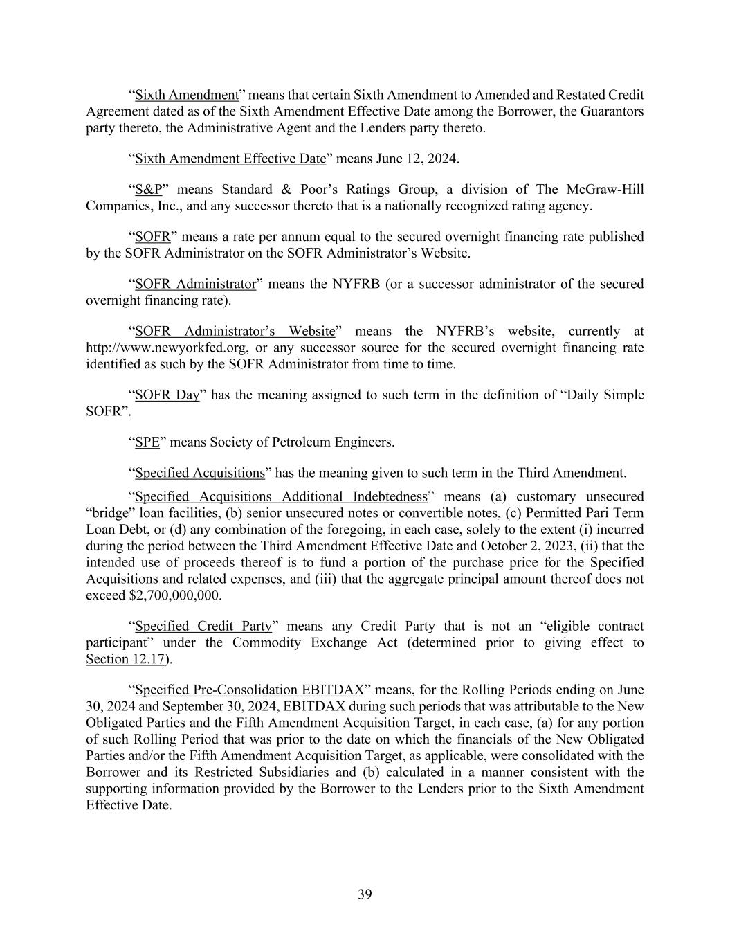 39 “Sixth Amendment” means that certain Sixth Amendment to Amended and Restated Credit Agreement dated as of the Sixth Amendment Effective Date among the Borrower, the Guarantors party thereto, the Administrative Agent and the Lenders party thereto. “Sixth Amendment Effective Date” means June 12, 2024. “S&P” means Standard & Poor’s Ratings Group, a division of The McGraw-Hill Companies, Inc., and any successor thereto that is a nationally recognized rating agency. “SOFR” means a rate per annum equal to the secured overnight financing rate published by the SOFR Administrator on the SOFR Administrator’s Website. “SOFR Administrator” means the NYFRB (or a successor administrator of the secured overnight financing rate). “SOFR Administrator’s Website” means the NYFRB’s website, currently at http://www.newyorkfed.org, or any successor source for the secured overnight financing rate identified as such by the SOFR Administrator from time to time. “SOFR Day” has the meaning assigned to such term in the definition of “Daily Simple SOFR”. “SPE” means Society of Petroleum Engineers. “Specified Acquisitions” has the meaning given to such term in the Third Amendment. “Specified Acquisitions Additional Indebtedness” means (a) customary unsecured “bridge” loan facilities, (b) senior unsecured notes or convertible notes, (c) Permitted Pari Term Loan Debt, or (d) any combination of the foregoing, in each case, solely to the extent (i) incurred during the period between the Third Amendment Effective Date and October 2, 2023, (ii) that the intended use of proceeds thereof is to fund a portion of the purchase price for the Specified Acquisitions and related expenses, and (iii) that the aggregate principal amount thereof does not exceed $2,700,000,000. “Specified Credit Party” means any Credit Party that is not an “eligible contract participant” under the Commodity Exchange Act (determined prior to giving effect to Section 12.17). “Specified Pre-Consolidation EBITDAX” means, for the Rolling Periods ending on June 30, 2024 and September 30, 2024, EBITDAX during such periods that was attributable to the New Obligated Parties and the Fifth Amendment Acquisition Target, in each case, (a) for any portion of such Rolling Period that was prior to the date on which the financials of the New Obligated Parties and/or the Fifth Amendment Acquisition Target, as applicable, were consolidated with the Borrower and its Restricted Subsidiaries and (b) calculated in a manner consistent with the supporting information provided by the Borrower to the Lenders prior to the Sixth Amendment Effective Date.