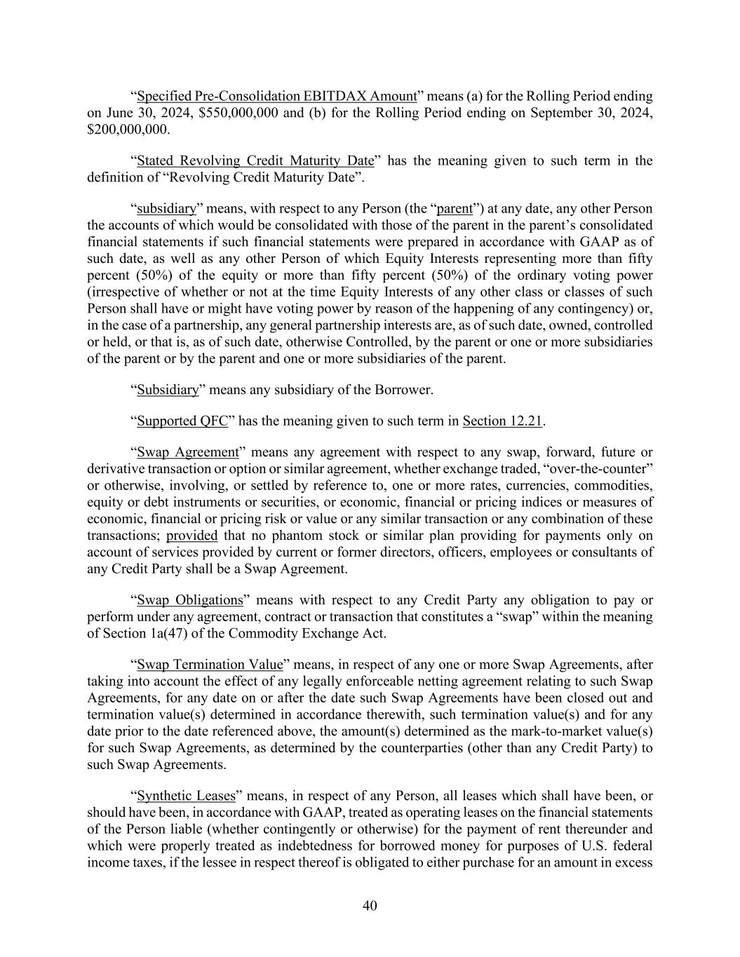40 “Specified Pre-Consolidation EBITDAX Amount” means (a) for the Rolling Period ending on June 30, 2024, $550,000,000 and (b) for the Rolling Period ending on September 30, 2024, $200,000,000. “Stated Revolving Credit Maturity Date” has the meaning given to such term in the definition of “Revolving Credit Maturity Date”. “subsidiary” means, with respect to any Person (the “parent”) at any date, any other Person the accounts of which would be consolidated with those of the parent in the parent’s consolidated financial statements if such financial statements were prepared in accordance with GAAP as of such date, as well as any other Person of which Equity Interests representing more than fifty percent (50%) of the equity or more than fifty percent (50%) of the ordinary voting power (irrespective of whether or not at the time Equity Interests of any other class or classes of such Person shall have or might have voting power by reason of the happening of any contingency) or, in the case of a partnership, any general partnership interests are, as of such date, owned, controlled or held, or that is, as of such date, otherwise Controlled, by the parent or one or more subsidiaries of the parent or by the parent and one or more subsidiaries of the parent. “Subsidiary” means any subsidiary of the Borrower. “Supported QFC” has the meaning given to such term in Section 12.21. “Swap Agreement” means any agreement with respect to any swap, forward, future or derivative transaction or option or similar agreement, whether exchange traded, “over-the-counter” or otherwise, involving, or settled by reference to, one or more rates, currencies, commodities, equity or debt instruments or securities, or economic, financial or pricing indices or measures of economic, financial or pricing risk or value or any similar transaction or any combination of these transactions; provided that no phantom stock or similar plan providing for payments only on account of services provided by current or former directors, officers, employees or consultants of any Credit Party shall be a Swap Agreement. “Swap Obligations” means with respect to any Credit Party any obligation to pay or perform under any agreement, contract or transaction that constitutes a “swap” within the meaning of Section 1a(47) of the Commodity Exchange Act. “Swap Termination Value” means, in respect of any one or more Swap Agreements, after taking into account the effect of any legally enforceable netting agreement relating to such Swap Agreements, for any date on or after the date such Swap Agreements have been closed out and termination value(s) determined in accordance therewith, such termination value(s) and for any date prior to the date referenced above, the amount(s) determined as the mark-to-market value(s) for such Swap Agreements, as determined by the counterparties (other than any Credit Party) to such Swap Agreements. “Synthetic Leases” means, in respect of any Person, all leases which shall have been, or should have been, in accordance with GAAP, treated as operating leases on the financial statements of the Person liable (whether contingently or otherwise) for the payment of rent thereunder and which were properly treated as indebtedness for borrowed money for purposes of U.S. federal income taxes, if the lessee in respect thereof is obligated to either purchase for an amount in excess