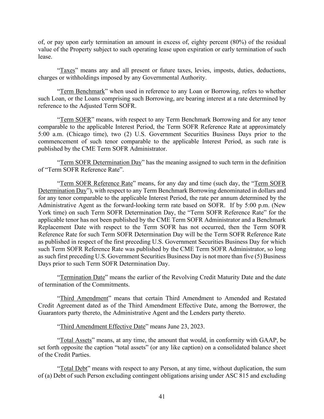 41 of, or pay upon early termination an amount in excess of, eighty percent (80%) of the residual value of the Property subject to such operating lease upon expiration or early termination of such lease. “Taxes” means any and all present or future taxes, levies, imposts, duties, deductions, charges or withholdings imposed by any Governmental Authority. “Term Benchmark” when used in reference to any Loan or Borrowing, refers to whether such Loan, or the Loans comprising such Borrowing, are bearing interest at a rate determined by reference to the Adjusted Term SOFR. “Term SOFR” means, with respect to any Term Benchmark Borrowing and for any tenor comparable to the applicable Interest Period, the Term SOFR Reference Rate at approximately 5:00 a.m. (Chicago time), two (2) U.S. Government Securities Business Days prior to the commencement of such tenor comparable to the applicable Interest Period, as such rate is published by the CME Term SOFR Administrator. “Term SOFR Determination Day” has the meaning assigned to such term in the definition of “Term SOFR Reference Rate”. “Term SOFR Reference Rate” means, for any day and time (such day, the “Term SOFR Determination Day”), with respect to any Term Benchmark Borrowing denominated in dollars and for any tenor comparable to the applicable Interest Period, the rate per annum determined by the Administrative Agent as the forward-looking term rate based on SOFR. If by 5:00 p.m. (New York time) on such Term SOFR Determination Day, the “Term SOFR Reference Rate” for the applicable tenor has not been published by the CME Term SOFR Administrator and a Benchmark Replacement Date with respect to the Term SOFR has not occurred, then the Term SOFR Reference Rate for such Term SOFR Determination Day will be the Term SOFR Reference Rate as published in respect of the first preceding U.S. Government Securities Business Day for which such Term SOFR Reference Rate was published by the CME Term SOFR Administrator, so long as such first preceding U.S. Government Securities Business Day is not more than five (5) Business Days prior to such Term SOFR Determination Day. “Termination Date” means the earlier of the Revolving Credit Maturity Date and the date of termination of the Commitments. “Third Amendment” means that certain Third Amendment to Amended and Restated Credit Agreement dated as of the Third Amendment Effective Date, among the Borrower, the Guarantors party thereto, the Administrative Agent and the Lenders party thereto. “Third Amendment Effective Date” means June 23, 2023. “Total Assets” means, at any time, the amount that would, in conformity with GAAP, be set forth opposite the caption “total assets” (or any like caption) on a consolidated balance sheet of the Credit Parties. “Total Debt” means with respect to any Person, at any time, without duplication, the sum of (a) Debt of such Person excluding contingent obligations arising under ASC 815 and excluding