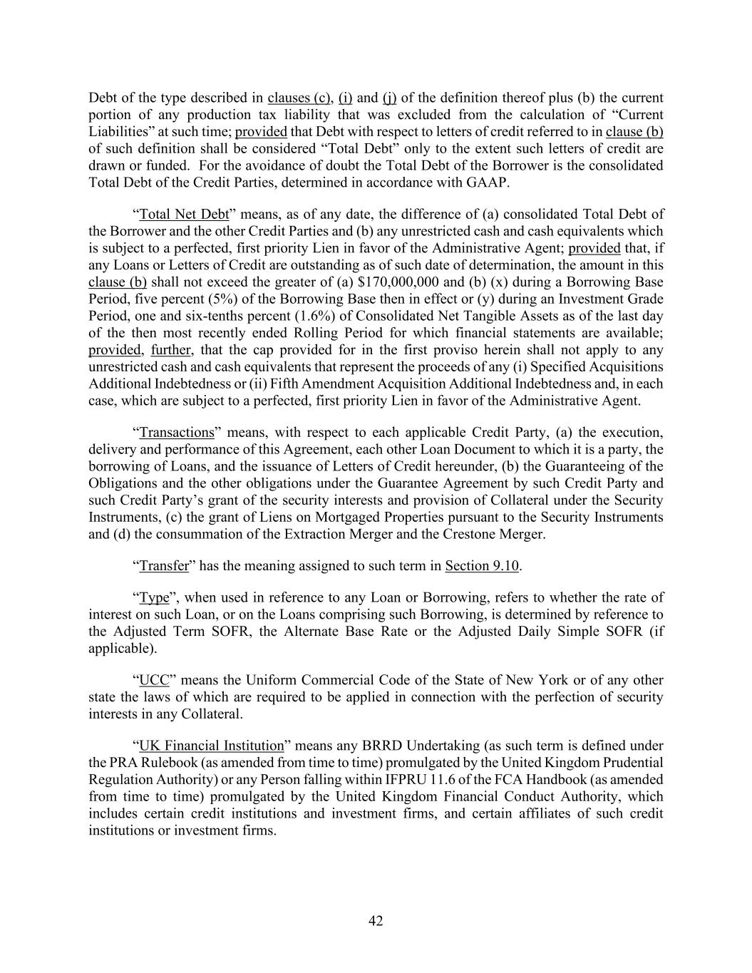 42 Debt of the type described in clauses (c), (i) and (j) of the definition thereof plus (b) the current portion of any production tax liability that was excluded from the calculation of “Current Liabilities” at such time; provided that Debt with respect to letters of credit referred to in clause (b) of such definition shall be considered “Total Debt” only to the extent such letters of credit are drawn or funded. For the avoidance of doubt the Total Debt of the Borrower is the consolidated Total Debt of the Credit Parties, determined in accordance with GAAP. “Total Net Debt” means, as of any date, the difference of (a) consolidated Total Debt of the Borrower and the other Credit Parties and (b) any unrestricted cash and cash equivalents which is subject to a perfected, first priority Lien in favor of the Administrative Agent; provided that, if any Loans or Letters of Credit are outstanding as of such date of determination, the amount in this clause (b) shall not exceed the greater of (a) $170,000,000 and (b) (x) during a Borrowing Base Period, five percent (5%) of the Borrowing Base then in effect or (y) during an Investment Grade Period, one and six-tenths percent (1.6%) of Consolidated Net Tangible Assets as of the last day of the then most recently ended Rolling Period for which financial statements are available; provided, further, that the cap provided for in the first proviso herein shall not apply to any unrestricted cash and cash equivalents that represent the proceeds of any (i) Specified Acquisitions Additional Indebtedness or (ii) Fifth Amendment Acquisition Additional Indebtedness and, in each case, which are subject to a perfected, first priority Lien in favor of the Administrative Agent. “Transactions” means, with respect to each applicable Credit Party, (a) the execution, delivery and performance of this Agreement, each other Loan Document to which it is a party, the borrowing of Loans, and the issuance of Letters of Credit hereunder, (b) the Guaranteeing of the Obligations and the other obligations under the Guarantee Agreement by such Credit Party and such Credit Party’s grant of the security interests and provision of Collateral under the Security Instruments, (c) the grant of Liens on Mortgaged Properties pursuant to the Security Instruments and (d) the consummation of the Extraction Merger and the Crestone Merger. “Transfer” has the meaning assigned to such term in Section 9.10. “Type”, when used in reference to any Loan or Borrowing, refers to whether the rate of interest on such Loan, or on the Loans comprising such Borrowing, is determined by reference to the Adjusted Term SOFR, the Alternate Base Rate or the Adjusted Daily Simple SOFR (if applicable). “UCC” means the Uniform Commercial Code of the State of New York or of any other state the laws of which are required to be applied in connection with the perfection of security interests in any Collateral. “UK Financial Institution” means any BRRD Undertaking (as such term is defined under the PRA Rulebook (as amended from time to time) promulgated by the United Kingdom Prudential Regulation Authority) or any Person falling within IFPRU 11.6 of the FCA Handbook (as amended from time to time) promulgated by the United Kingdom Financial Conduct Authority, which includes certain credit institutions and investment firms, and certain affiliates of such credit institutions or investment firms.