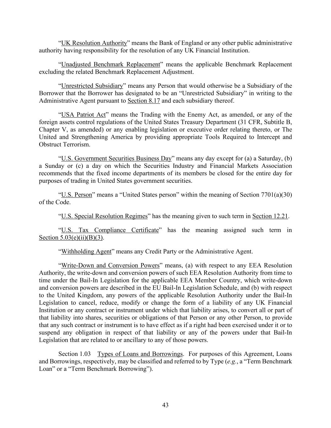 43 “UK Resolution Authority” means the Bank of England or any other public administrative authority having responsibility for the resolution of any UK Financial Institution. “Unadjusted Benchmark Replacement” means the applicable Benchmark Replacement excluding the related Benchmark Replacement Adjustment. “Unrestricted Subsidiary” means any Person that would otherwise be a Subsidiary of the Borrower that the Borrower has designated to be an “Unrestricted Subsidiary” in writing to the Administrative Agent pursuant to Section 8.17 and each subsidiary thereof. “USA Patriot Act” means the Trading with the Enemy Act, as amended, or any of the foreign assets control regulations of the United States Treasury Department (31 CFR, Subtitle B, Chapter V, as amended) or any enabling legislation or executive order relating thereto, or The United and Strengthening America by providing appropriate Tools Required to Intercept and Obstruct Terrorism. “U.S. Government Securities Business Day” means any day except for (a) a Saturday, (b) a Sunday or (c) a day on which the Securities Industry and Financial Markets Association recommends that the fixed income departments of its members be closed for the entire day for purposes of trading in United States government securities. “U.S. Person” means a “United States person” within the meaning of Section 7701(a)(30) of the Code. “U.S. Special Resolution Regimes” has the meaning given to such term in Section 12.21. “U.S. Tax Compliance Certificate” has the meaning assigned such term in Section 5.03(e)(ii)(B)(3). “Withholding Agent” means any Credit Party or the Administrative Agent. “Write-Down and Conversion Powers” means, (a) with respect to any EEA Resolution Authority, the write-down and conversion powers of such EEA Resolution Authority from time to time under the Bail-In Legislation for the applicable EEA Member Country, which write-down and conversion powers are described in the EU Bail-In Legislation Schedule, and (b) with respect to the United Kingdom, any powers of the applicable Resolution Authority under the Bail-In Legislation to cancel, reduce, modify or change the form of a liability of any UK Financial Institution or any contract or instrument under which that liability arises, to convert all or part of that liability into shares, securities or obligations of that Person or any other Person, to provide that any such contract or instrument is to have effect as if a right had been exercised under it or to suspend any obligation in respect of that liability or any of the powers under that Bail-In Legislation that are related to or ancillary to any of those powers. Section 1.03 Types of Loans and Borrowings. For purposes of this Agreement, Loans and Borrowings, respectively, may be classified and referred to by Type (e.g., a “Term Benchmark Loan” or a “Term Benchmark Borrowing”).