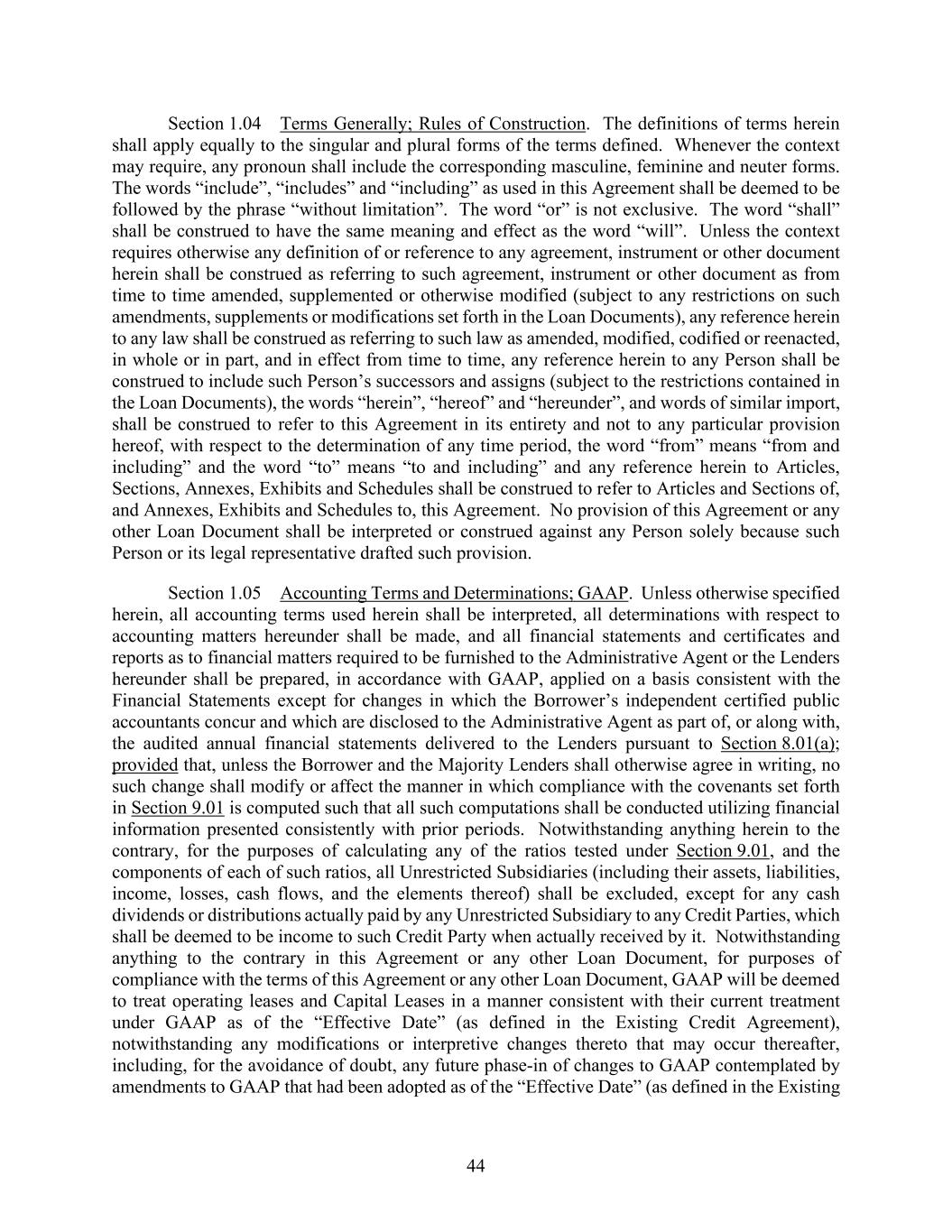 44 Section 1.04 Terms Generally; Rules of Construction. The definitions of terms herein shall apply equally to the singular and plural forms of the terms defined. Whenever the context may require, any pronoun shall include the corresponding masculine, feminine and neuter forms. The words “include”, “includes” and “including” as used in this Agreement shall be deemed to be followed by the phrase “without limitation”. The word “or” is not exclusive. The word “shall” shall be construed to have the same meaning and effect as the word “will”. Unless the context requires otherwise any definition of or reference to any agreement, instrument or other document herein shall be construed as referring to such agreement, instrument or other document as from time to time amended, supplemented or otherwise modified (subject to any restrictions on such amendments, supplements or modifications set forth in the Loan Documents), any reference herein to any law shall be construed as referring to such law as amended, modified, codified or reenacted, in whole or in part, and in effect from time to time, any reference herein to any Person shall be construed to include such Person’s successors and assigns (subject to the restrictions contained in the Loan Documents), the words “herein”, “hereof” and “hereunder”, and words of similar import, shall be construed to refer to this Agreement in its entirety and not to any particular provision hereof, with respect to the determination of any time period, the word “from” means “from and including” and the word “to” means “to and including” and any reference herein to Articles, Sections, Annexes, Exhibits and Schedules shall be construed to refer to Articles and Sections of, and Annexes, Exhibits and Schedules to, this Agreement. No provision of this Agreement or any other Loan Document shall be interpreted or construed against any Person solely because such Person or its legal representative drafted such provision. Section 1.05 Accounting Terms and Determinations; GAAP. Unless otherwise specified herein, all accounting terms used herein shall be interpreted, all determinations with respect to accounting matters hereunder shall be made, and all financial statements and certificates and reports as to financial matters required to be furnished to the Administrative Agent or the Lenders hereunder shall be prepared, in accordance with GAAP, applied on a basis consistent with the Financial Statements except for changes in which the Borrower’s independent certified public accountants concur and which are disclosed to the Administrative Agent as part of, or along with, the audited annual financial statements delivered to the Lenders pursuant to Section 8.01(a); provided that, unless the Borrower and the Majority Lenders shall otherwise agree in writing, no such change shall modify or affect the manner in which compliance with the covenants set forth in Section 9.01 is computed such that all such computations shall be conducted utilizing financial information presented consistently with prior periods. Notwithstanding anything herein to the contrary, for the purposes of calculating any of the ratios tested under Section 9.01, and the components of each of such ratios, all Unrestricted Subsidiaries (including their assets, liabilities, income, losses, cash flows, and the elements thereof) shall be excluded, except for any cash dividends or distributions actually paid by any Unrestricted Subsidiary to any Credit Parties, which shall be deemed to be income to such Credit Party when actually received by it. Notwithstanding anything to the contrary in this Agreement or any other Loan Document, for purposes of compliance with the terms of this Agreement or any other Loan Document, GAAP will be deemed to treat operating leases and Capital Leases in a manner consistent with their current treatment under GAAP as of the “Effective Date” (as defined in the Existing Credit Agreement), notwithstanding any modifications or interpretive changes thereto that may occur thereafter, including, for the avoidance of doubt, any future phase-in of changes to GAAP contemplated by amendments to GAAP that had been adopted as of the “Effective Date” (as defined in the Existing