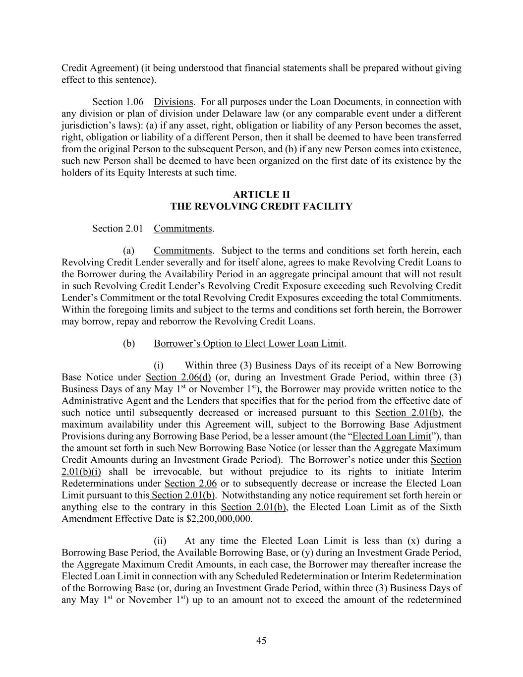 45 Credit Agreement) (it being understood that financial statements shall be prepared without giving effect to this sentence). Section 1.06 Divisions. For all purposes under the Loan Documents, in connection with any division or plan of division under Delaware law (or any comparable event under a different jurisdiction’s laws): (a) if any asset, right, obligation or liability of any Person becomes the asset, right, obligation or liability of a different Person, then it shall be deemed to have been transferred from the original Person to the subsequent Person, and (b) if any new Person comes into existence, such new Person shall be deemed to have been organized on the first date of its existence by the holders of its Equity Interests at such time. ARTICLE II THE REVOLVING CREDIT FACILITY Section 2.01 Commitments. (a) Commitments. Subject to the terms and conditions set forth herein, each Revolving Credit Lender severally and for itself alone, agrees to make Revolving Credit Loans to the Borrower during the Availability Period in an aggregate principal amount that will not result in such Revolving Credit Lender’s Revolving Credit Exposure exceeding such Revolving Credit Lender’s Commitment or the total Revolving Credit Exposures exceeding the total Commitments. Within the foregoing limits and subject to the terms and conditions set forth herein, the Borrower may borrow, repay and reborrow the Revolving Credit Loans. (b) Borrower’s Option to Elect Lower Loan Limit. (i) Within three (3) Business Days of its receipt of a New Borrowing Base Notice under Section 2.06(d) (or, during an Investment Grade Period, within three (3) Business Days of any May 1st or November 1st), the Borrower may provide written notice to the Administrative Agent and the Lenders that specifies that for the period from the effective date of such notice until subsequently decreased or increased pursuant to this Section 2.01(b), the maximum availability under this Agreement will, subject to the Borrowing Base Adjustment Provisions during any Borrowing Base Period, be a lesser amount (the “Elected Loan Limit”), than the amount set forth in such New Borrowing Base Notice (or lesser than the Aggregate Maximum Credit Amounts during an Investment Grade Period). The Borrower’s notice under this Section 2.01(b)(i) shall be irrevocable, but without prejudice to its rights to initiate Interim Redeterminations under Section 2.06 or to subsequently decrease or increase the Elected Loan Limit pursuant to this Section 2.01(b). Notwithstanding any notice requirement set forth herein or anything else to the contrary in this Section 2.01(b), the Elected Loan Limit as of the Sixth Amendment Effective Date is $2,200,000,000. (ii) At any time the Elected Loan Limit is less than (x) during a Borrowing Base Period, the Available Borrowing Base, or (y) during an Investment Grade Period, the Aggregate Maximum Credit Amounts, in each case, the Borrower may thereafter increase the Elected Loan Limit in connection with any Scheduled Redetermination or Interim Redetermination of the Borrowing Base (or, during an Investment Grade Period, within three (3) Business Days of any May 1st or November 1st) up to an amount not to exceed the amount of the redetermined