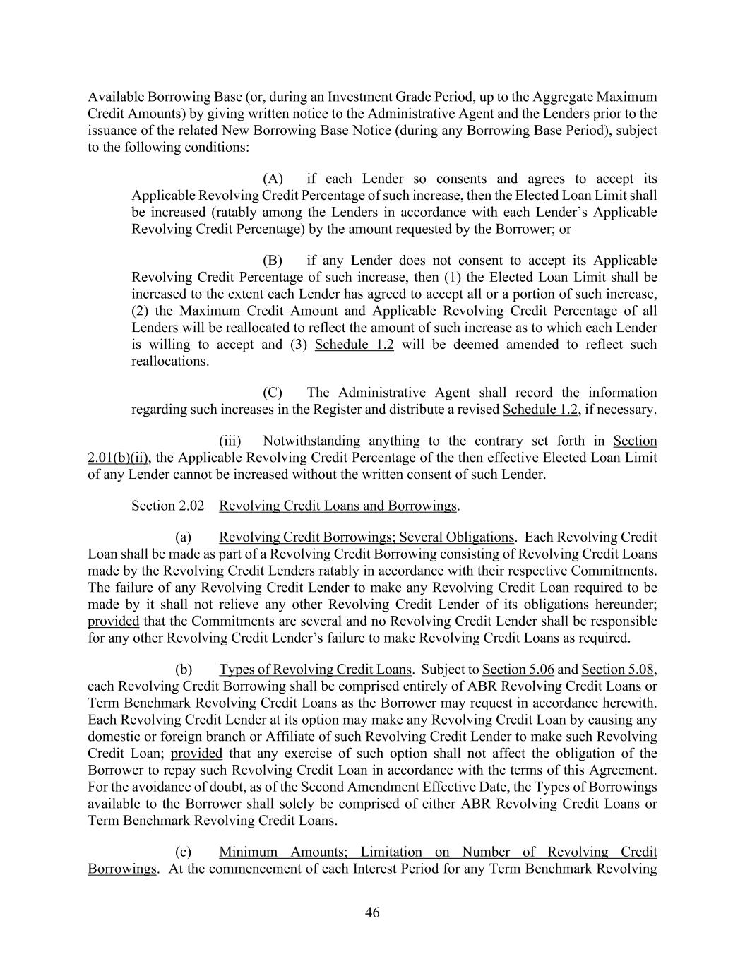 46 Available Borrowing Base (or, during an Investment Grade Period, up to the Aggregate Maximum Credit Amounts) by giving written notice to the Administrative Agent and the Lenders prior to the issuance of the related New Borrowing Base Notice (during any Borrowing Base Period), subject to the following conditions: (A) if each Lender so consents and agrees to accept its Applicable Revolving Credit Percentage of such increase, then the Elected Loan Limit shall be increased (ratably among the Lenders in accordance with each Lender’s Applicable Revolving Credit Percentage) by the amount requested by the Borrower; or (B) if any Lender does not consent to accept its Applicable Revolving Credit Percentage of such increase, then (1) the Elected Loan Limit shall be increased to the extent each Lender has agreed to accept all or a portion of such increase, (2) the Maximum Credit Amount and Applicable Revolving Credit Percentage of all Lenders will be reallocated to reflect the amount of such increase as to which each Lender is willing to accept and (3) Schedule 1.2 will be deemed amended to reflect such reallocations. (C) The Administrative Agent shall record the information regarding such increases in the Register and distribute a revised Schedule 1.2, if necessary. (iii) Notwithstanding anything to the contrary set forth in Section 2.01(b)(ii), the Applicable Revolving Credit Percentage of the then effective Elected Loan Limit of any Lender cannot be increased without the written consent of such Lender. Section 2.02 Revolving Credit Loans and Borrowings. (a) Revolving Credit Borrowings; Several Obligations. Each Revolving Credit Loan shall be made as part of a Revolving Credit Borrowing consisting of Revolving Credit Loans made by the Revolving Credit Lenders ratably in accordance with their respective Commitments. The failure of any Revolving Credit Lender to make any Revolving Credit Loan required to be made by it shall not relieve any other Revolving Credit Lender of its obligations hereunder; provided that the Commitments are several and no Revolving Credit Lender shall be responsible for any other Revolving Credit Lender’s failure to make Revolving Credit Loans as required. (b) Types of Revolving Credit Loans. Subject to Section 5.06 and Section 5.08, each Revolving Credit Borrowing shall be comprised entirely of ABR Revolving Credit Loans or Term Benchmark Revolving Credit Loans as the Borrower may request in accordance herewith. Each Revolving Credit Lender at its option may make any Revolving Credit Loan by causing any domestic or foreign branch or Affiliate of such Revolving Credit Lender to make such Revolving Credit Loan; provided that any exercise of such option shall not affect the obligation of the Borrower to repay such Revolving Credit Loan in accordance with the terms of this Agreement. For the avoidance of doubt, as of the Second Amendment Effective Date, the Types of Borrowings available to the Borrower shall solely be comprised of either ABR Revolving Credit Loans or Term Benchmark Revolving Credit Loans. (c) Minimum Amounts; Limitation on Number of Revolving Credit Borrowings. At the commencement of each Interest Period for any Term Benchmark Revolving