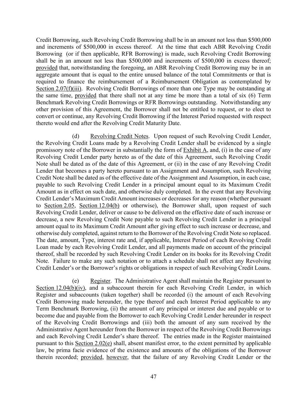 47 Credit Borrowing, such Revolving Credit Borrowing shall be in an amount not less than $500,000 and increments of $500,000 in excess thereof. At the time that each ABR Revolving Credit Borrowing (or if then applicable, RFR Borrowing) is made, such Revolving Credit Borrowing shall be in an amount not less than $500,000 and increments of $500,000 in excess thereof; provided that, notwithstanding the foregoing, an ABR Revolving Credit Borrowing may be in an aggregate amount that is equal to the entire unused balance of the total Commitments or that is required to finance the reimbursement of a Reimbursement Obligation as contemplated by Section 2.07(f)(iii). Revolving Credit Borrowings of more than one Type may be outstanding at the same time, provided that there shall not at any time be more than a total of six (6) Term Benchmark Revolving Credit Borrowings or RFR Borrowings outstanding. Notwithstanding any other provision of this Agreement, the Borrower shall not be entitled to request, or to elect to convert or continue, any Revolving Credit Borrowing if the Interest Period requested with respect thereto would end after the Revolving Credit Maturity Date. (d) Revolving Credit Notes. Upon request of such Revolving Credit Lender, the Revolving Credit Loans made by a Revolving Credit Lender shall be evidenced by a single promissory note of the Borrower in substantially the form of Exhibit A, and, (i) in the case of any Revolving Credit Lender party hereto as of the date of this Agreement, such Revolving Credit Note shall be dated as of the date of this Agreement, or (ii) in the case of any Revolving Credit Lender that becomes a party hereto pursuant to an Assignment and Assumption, such Revolving Credit Note shall be dated as of the effective date of the Assignment and Assumption, in each case, payable to such Revolving Credit Lender in a principal amount equal to its Maximum Credit Amount as in effect on such date, and otherwise duly completed. In the event that any Revolving Credit Lender’s Maximum Credit Amount increases or decreases for any reason (whether pursuant to Section 2.05, Section 12.04(b) or otherwise), the Borrower shall, upon request of such Revolving Credit Lender, deliver or cause to be delivered on the effective date of such increase or decrease, a new Revolving Credit Note payable to such Revolving Credit Lender in a principal amount equal to its Maximum Credit Amount after giving effect to such increase or decrease, and otherwise duly completed, against return to the Borrower of the Revolving Credit Note so replaced. The date, amount, Type, interest rate and, if applicable, Interest Period of each Revolving Credit Loan made by each Revolving Credit Lender, and all payments made on account of the principal thereof, shall be recorded by such Revolving Credit Lender on its books for its Revolving Credit Note. Failure to make any such notation or to attach a schedule shall not affect any Revolving Credit Lender’s or the Borrower’s rights or obligations in respect of such Revolving Credit Loans. (e) Register. The Administrative Agent shall maintain the Register pursuant to Section 12.04(b)(iv), and a subaccount therein for each Revolving Credit Lender, in which Register and subaccounts (taken together) shall be recorded (i) the amount of each Revolving Credit Borrowing made hereunder, the type thereof and each Interest Period applicable to any Term Benchmark Borrowing, (ii) the amount of any principal or interest due and payable or to become due and payable from the Borrower to each Revolving Credit Lender hereunder in respect of the Revolving Credit Borrowings and (iii) both the amount of any sum received by the Administrative Agent hereunder from the Borrower in respect of the Revolving Credit Borrowings and each Revolving Credit Lender’s share thereof. The entries made in the Register maintained pursuant to this Section 2.02(e) shall, absent manifest error, to the extent permitted by applicable law, be prima facie evidence of the existence and amounts of the obligations of the Borrower therein recorded; provided, however, that the failure of any Revolving Credit Lender or the
