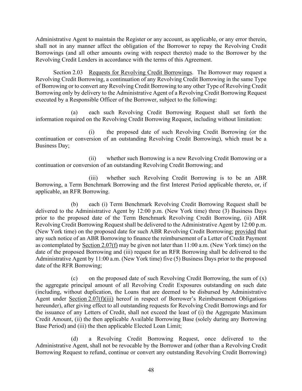 48 Administrative Agent to maintain the Register or any account, as applicable, or any error therein, shall not in any manner affect the obligation of the Borrower to repay the Revolving Credit Borrowings (and all other amounts owing with respect thereto) made to the Borrower by the Revolving Credit Lenders in accordance with the terms of this Agreement. Section 2.03 Requests for Revolving Credit Borrowings. The Borrower may request a Revolving Credit Borrowing, a continuation of any Revolving Credit Borrowing in the same Type of Borrowing or to convert any Revolving Credit Borrowing to any other Type of Revolving Credit Borrowing only by delivery to the Administrative Agent of a Revolving Credit Borrowing Request executed by a Responsible Officer of the Borrower, subject to the following: (a) each such Revolving Credit Borrowing Request shall set forth the information required on the Revolving Credit Borrowing Request, including without limitation: (i) the proposed date of such Revolving Credit Borrowing (or the continuation or conversion of an outstanding Revolving Credit Borrowing), which must be a Business Day; (ii) whether such Borrowing is a new Revolving Credit Borrowing or a continuation or conversion of an outstanding Revolving Credit Borrowing; and (iii) whether such Revolving Credit Borrowing is to be an ABR Borrowing, a Term Benchmark Borrowing and the first Interest Period applicable thereto, or, if applicable, an RFR Borrowing. (b) each (i) Term Benchmark Revolving Credit Borrowing Request shall be delivered to the Administrative Agent by 12:00 p.m. (New York time) three (3) Business Days prior to the proposed date of the Term Benchmark Revolving Credit Borrowing, (ii) ABR Revolving Credit Borrowing Request shall be delivered to the Administrative Agent by 12:00 p.m. (New York time) on the proposed date for such ABR Revolving Credit Borrowing; provided that any such notice of an ABR Borrowing to finance the reimbursement of a Letter of Credit Payment as contemplated by Section 2.07(f) may be given not later than 11:00 a.m. (New York time) on the date of the proposed Borrowing and (iii) request for an RFR Borrowing shall be delivered to the Administrative Agent by 11:00 a.m. (New York time) five (5) Business Days prior to the proposed date of the RFR Borrowing; (c) on the proposed date of such Revolving Credit Borrowing, the sum of (x) the aggregate principal amount of all Revolving Credit Exposures outstanding on such date (including, without duplication, the Loans that are deemed to be disbursed by Administrative Agent under Section 2.07(f)(iii) hereof in respect of Borrower’s Reimbursement Obligations hereunder), after giving effect to all outstanding requests for Revolving Credit Borrowings and for the issuance of any Letters of Credit, shall not exceed the least of (i) the Aggregate Maximum Credit Amount, (ii) the then applicable Available Borrowing Base (solely during any Borrowing Base Period) and (iii) the then applicable Elected Loan Limit; (d) a Revolving Credit Borrowing Request, once delivered to the Administrative Agent, shall not be revocable by the Borrower and (other than a Revolving Credit Borrowing Request to refund, continue or convert any outstanding Revolving Credit Borrowing)