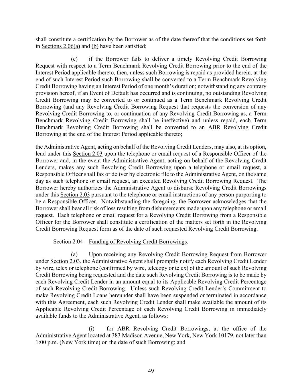 49 shall constitute a certification by the Borrower as of the date thereof that the conditions set forth in Sections 2.06(a) and (b) have been satisfied; (e) if the Borrower fails to deliver a timely Revolving Credit Borrowing Request with respect to a Term Benchmark Revolving Credit Borrowing prior to the end of the Interest Period applicable thereto, then, unless such Borrowing is repaid as provided herein, at the end of such Interest Period such Borrowing shall be converted to a Term Benchmark Revolving Credit Borrowing having an Interest Period of one month’s duration; notwithstanding any contrary provision hereof, if an Event of Default has occurred and is continuing, no outstanding Revolving Credit Borrowing may be converted to or continued as a Term Benchmark Revolving Credit Borrowing (and any Revolving Credit Borrowing Request that requests the conversion of any Revolving Credit Borrowing to, or continuation of any Revolving Credit Borrowing as, a Term Benchmark Revolving Credit Borrowing shall be ineffective) and unless repaid, each Term Benchmark Revolving Credit Borrowing shall be converted to an ABR Revolving Credit Borrowing at the end of the Interest Period applicable thereto; the Administrative Agent, acting on behalf of the Revolving Credit Lenders, may also, at its option, lend under this Section 2.03 upon the telephone or email request of a Responsible Officer of the Borrower and, in the event the Administrative Agent, acting on behalf of the Revolving Credit Lenders, makes any such Revolving Credit Borrowing upon a telephone or email request, a Responsible Officer shall fax or deliver by electronic file to the Administrative Agent, on the same day as such telephone or email request, an executed Revolving Credit Borrowing Request. The Borrower hereby authorizes the Administrative Agent to disburse Revolving Credit Borrowings under this Section 2.03 pursuant to the telephone or email instructions of any person purporting to be a Responsible Officer. Notwithstanding the foregoing, the Borrower acknowledges that the Borrower shall bear all risk of loss resulting from disbursements made upon any telephone or email request. Each telephone or email request for a Revolving Credit Borrowing from a Responsible Officer for the Borrower shall constitute a certification of the matters set forth in the Revolving Credit Borrowing Request form as of the date of such requested Revolving Credit Borrowing. Section 2.04 Funding of Revolving Credit Borrowings. (a) Upon receiving any Revolving Credit Borrowing Request from Borrower under Section 2.03, the Administrative Agent shall promptly notify each Revolving Credit Lender by wire, telex or telephone (confirmed by wire, telecopy or telex) of the amount of such Revolving Credit Borrowing being requested and the date such Revolving Credit Borrowing is to be made by each Revolving Credit Lender in an amount equal to its Applicable Revolving Credit Percentage of such Revolving Credit Borrowing. Unless such Revolving Credit Lender’s Commitment to make Revolving Credit Loans hereunder shall have been suspended or terminated in accordance with this Agreement, each such Revolving Credit Lender shall make available the amount of its Applicable Revolving Credit Percentage of each Revolving Credit Borrowing in immediately available funds to the Administrative Agent, as follows: (i) for ABR Revolving Credit Borrowings, at the office of the Administrative Agent located at 383 Madison Avenue, New York, New York 10179, not later than 1:00 p.m. (New York time) on the date of such Borrowing; and