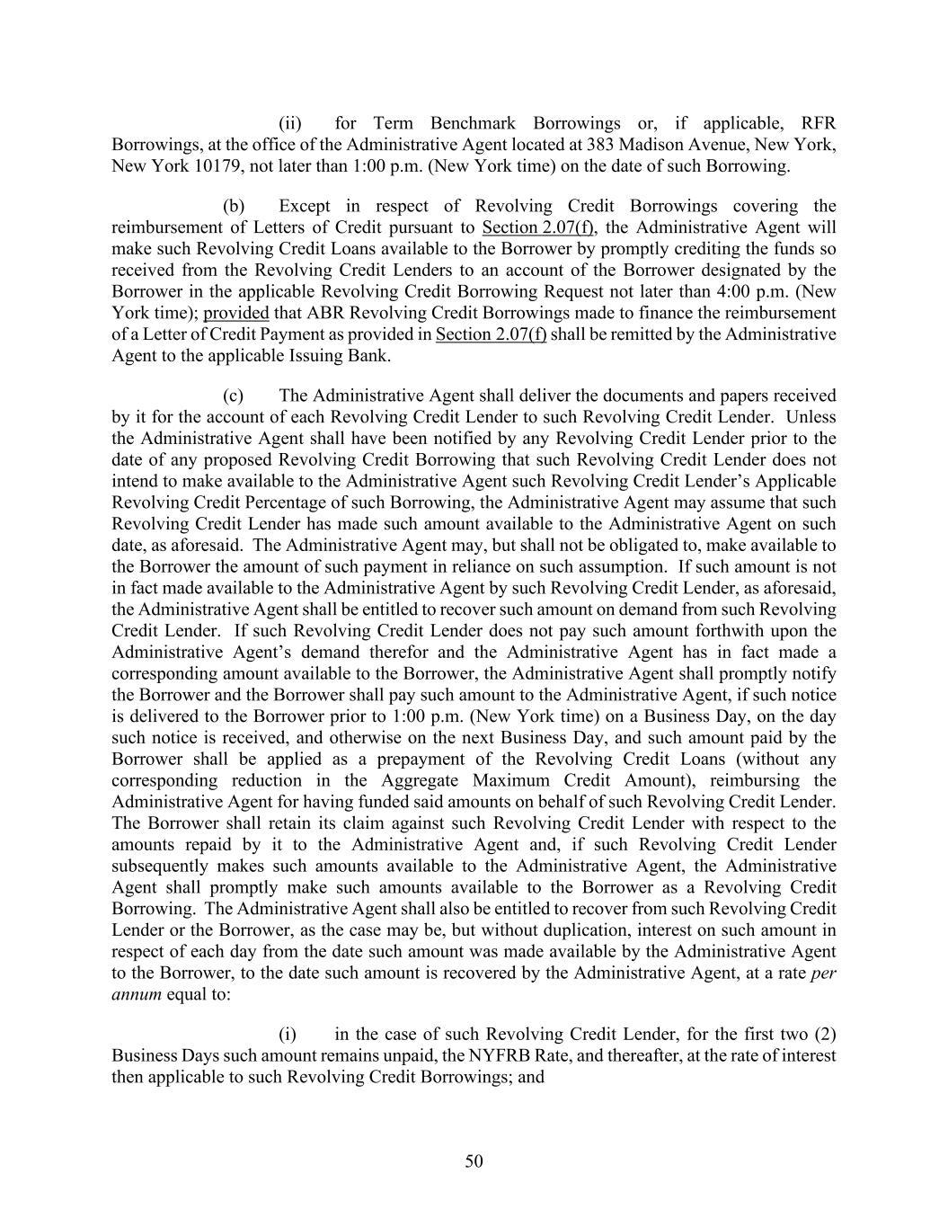 50 (ii) for Term Benchmark Borrowings or, if applicable, RFR Borrowings, at the office of the Administrative Agent located at 383 Madison Avenue, New York, New York 10179, not later than 1:00 p.m. (New York time) on the date of such Borrowing. (b) Except in respect of Revolving Credit Borrowings covering the reimbursement of Letters of Credit pursuant to Section 2.07(f), the Administrative Agent will make such Revolving Credit Loans available to the Borrower by promptly crediting the funds so received from the Revolving Credit Lenders to an account of the Borrower designated by the Borrower in the applicable Revolving Credit Borrowing Request not later than 4:00 p.m. (New York time); provided that ABR Revolving Credit Borrowings made to finance the reimbursement of a Letter of Credit Payment as provided in Section 2.07(f) shall be remitted by the Administrative Agent to the applicable Issuing Bank. (c) The Administrative Agent shall deliver the documents and papers received by it for the account of each Revolving Credit Lender to such Revolving Credit Lender. Unless the Administrative Agent shall have been notified by any Revolving Credit Lender prior to the date of any proposed Revolving Credit Borrowing that such Revolving Credit Lender does not intend to make available to the Administrative Agent such Revolving Credit Lender’s Applicable Revolving Credit Percentage of such Borrowing, the Administrative Agent may assume that such Revolving Credit Lender has made such amount available to the Administrative Agent on such date, as aforesaid. The Administrative Agent may, but shall not be obligated to, make available to the Borrower the amount of such payment in reliance on such assumption. If such amount is not in fact made available to the Administrative Agent by such Revolving Credit Lender, as aforesaid, the Administrative Agent shall be entitled to recover such amount on demand from such Revolving Credit Lender. If such Revolving Credit Lender does not pay such amount forthwith upon the Administrative Agent’s demand therefor and the Administrative Agent has in fact made a corresponding amount available to the Borrower, the Administrative Agent shall promptly notify the Borrower and the Borrower shall pay such amount to the Administrative Agent, if such notice is delivered to the Borrower prior to 1:00 p.m. (New York time) on a Business Day, on the day such notice is received, and otherwise on the next Business Day, and such amount paid by the Borrower shall be applied as a prepayment of the Revolving Credit Loans (without any corresponding reduction in the Aggregate Maximum Credit Amount), reimbursing the Administrative Agent for having funded said amounts on behalf of such Revolving Credit Lender. The Borrower shall retain its claim against such Revolving Credit Lender with respect to the amounts repaid by it to the Administrative Agent and, if such Revolving Credit Lender subsequently makes such amounts available to the Administrative Agent, the Administrative Agent shall promptly make such amounts available to the Borrower as a Revolving Credit Borrowing. The Administrative Agent shall also be entitled to recover from such Revolving Credit Lender or the Borrower, as the case may be, but without duplication, interest on such amount in respect of each day from the date such amount was made available by the Administrative Agent to the Borrower, to the date such amount is recovered by the Administrative Agent, at a rate per annum equal to: (i) in the case of such Revolving Credit Lender, for the first two (2) Business Days such amount remains unpaid, the NYFRB Rate, and thereafter, at the rate of interest then applicable to such Revolving Credit Borrowings; and