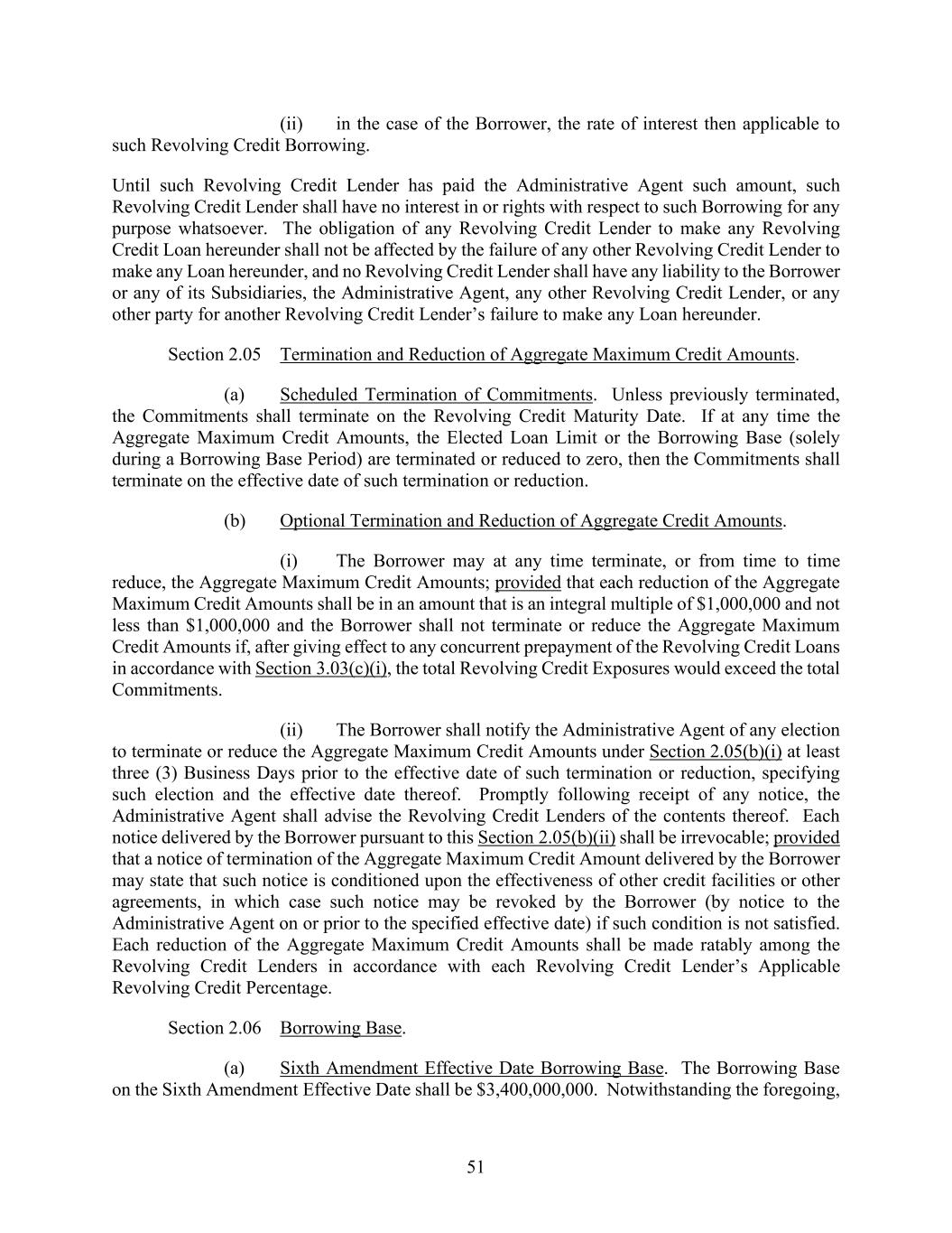51 (ii) in the case of the Borrower, the rate of interest then applicable to such Revolving Credit Borrowing. Until such Revolving Credit Lender has paid the Administrative Agent such amount, such Revolving Credit Lender shall have no interest in or rights with respect to such Borrowing for any purpose whatsoever. The obligation of any Revolving Credit Lender to make any Revolving Credit Loan hereunder shall not be affected by the failure of any other Revolving Credit Lender to make any Loan hereunder, and no Revolving Credit Lender shall have any liability to the Borrower or any of its Subsidiaries, the Administrative Agent, any other Revolving Credit Lender, or any other party for another Revolving Credit Lender’s failure to make any Loan hereunder. Section 2.05 Termination and Reduction of Aggregate Maximum Credit Amounts. (a) Scheduled Termination of Commitments. Unless previously terminated, the Commitments shall terminate on the Revolving Credit Maturity Date. If at any time the Aggregate Maximum Credit Amounts, the Elected Loan Limit or the Borrowing Base (solely during a Borrowing Base Period) are terminated or reduced to zero, then the Commitments shall terminate on the effective date of such termination or reduction. (b) Optional Termination and Reduction of Aggregate Credit Amounts. (i) The Borrower may at any time terminate, or from time to time reduce, the Aggregate Maximum Credit Amounts; provided that each reduction of the Aggregate Maximum Credit Amounts shall be in an amount that is an integral multiple of $1,000,000 and not less than $1,000,000 and the Borrower shall not terminate or reduce the Aggregate Maximum Credit Amounts if, after giving effect to any concurrent prepayment of the Revolving Credit Loans in accordance with Section 3.03(c)(i), the total Revolving Credit Exposures would exceed the total Commitments. (ii) The Borrower shall notify the Administrative Agent of any election to terminate or reduce the Aggregate Maximum Credit Amounts under Section 2.05(b)(i) at least three (3) Business Days prior to the effective date of such termination or reduction, specifying such election and the effective date thereof. Promptly following receipt of any notice, the Administrative Agent shall advise the Revolving Credit Lenders of the contents thereof. Each notice delivered by the Borrower pursuant to this Section 2.05(b)(ii) shall be irrevocable; provided that a notice of termination of the Aggregate Maximum Credit Amount delivered by the Borrower may state that such notice is conditioned upon the effectiveness of other credit facilities or other agreements, in which case such notice may be revoked by the Borrower (by notice to the Administrative Agent on or prior to the specified effective date) if such condition is not satisfied. Each reduction of the Aggregate Maximum Credit Amounts shall be made ratably among the Revolving Credit Lenders in accordance with each Revolving Credit Lender’s Applicable Revolving Credit Percentage. Section 2.06 Borrowing Base. (a) Sixth Amendment Effective Date Borrowing Base. The Borrowing Base on the Sixth Amendment Effective Date shall be $3,400,000,000. Notwithstanding the foregoing,