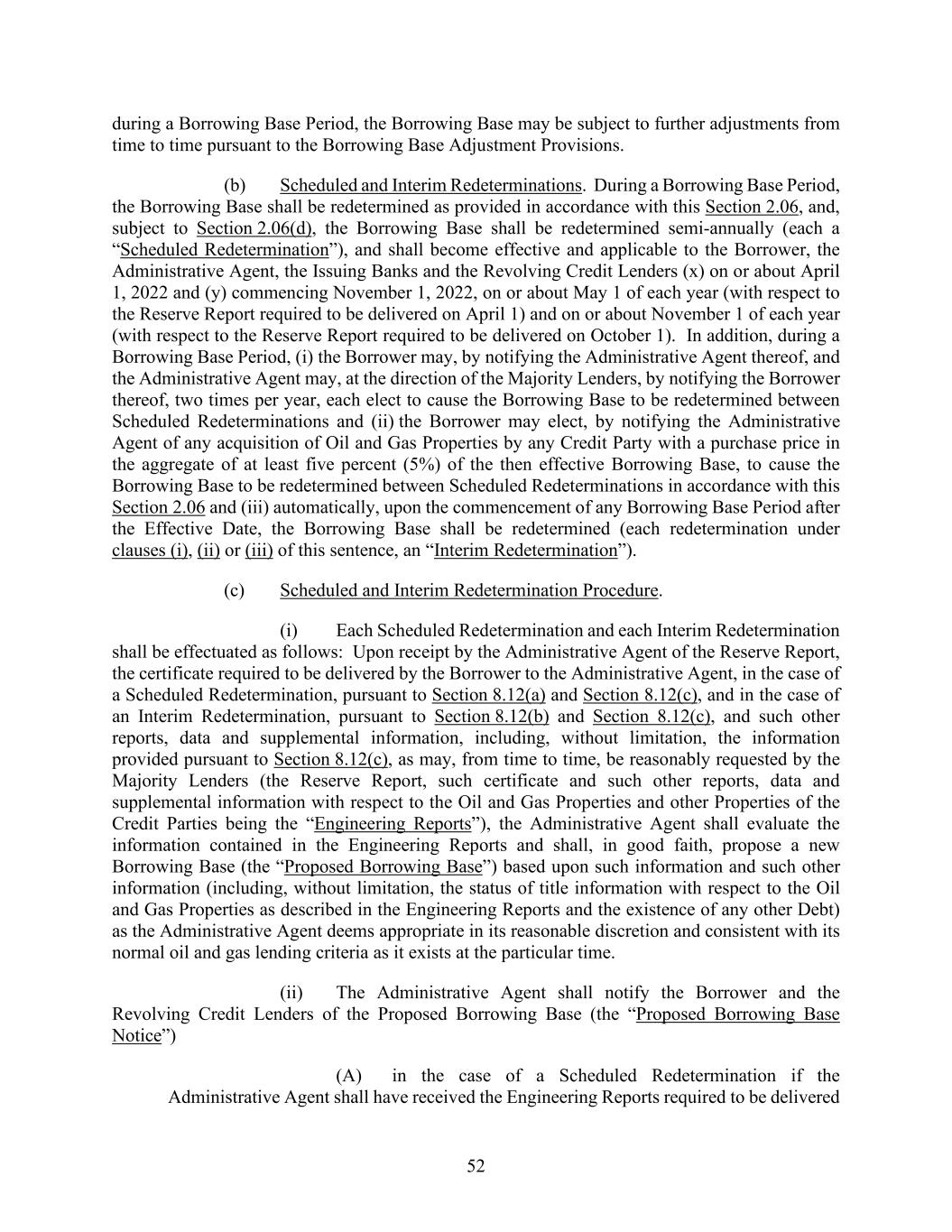 52 during a Borrowing Base Period, the Borrowing Base may be subject to further adjustments from time to time pursuant to the Borrowing Base Adjustment Provisions. (b) Scheduled and Interim Redeterminations. During a Borrowing Base Period, the Borrowing Base shall be redetermined as provided in accordance with this Section 2.06, and, subject to Section 2.06(d), the Borrowing Base shall be redetermined semi-annually (each a “Scheduled Redetermination”), and shall become effective and applicable to the Borrower, the Administrative Agent, the Issuing Banks and the Revolving Credit Lenders (x) on or about April 1, 2022 and (y) commencing November 1, 2022, on or about May 1 of each year (with respect to the Reserve Report required to be delivered on April 1) and on or about November 1 of each year (with respect to the Reserve Report required to be delivered on October 1). In addition, during a Borrowing Base Period, (i) the Borrower may, by notifying the Administrative Agent thereof, and the Administrative Agent may, at the direction of the Majority Lenders, by notifying the Borrower thereof, two times per year, each elect to cause the Borrowing Base to be redetermined between Scheduled Redeterminations and (ii) the Borrower may elect, by notifying the Administrative Agent of any acquisition of Oil and Gas Properties by any Credit Party with a purchase price in the aggregate of at least five percent (5%) of the then effective Borrowing Base, to cause the Borrowing Base to be redetermined between Scheduled Redeterminations in accordance with this Section 2.06 and (iii) automatically, upon the commencement of any Borrowing Base Period after the Effective Date, the Borrowing Base shall be redetermined (each redetermination under clauses (i), (ii) or (iii) of this sentence, an “Interim Redetermination”). (c) Scheduled and Interim Redetermination Procedure. (i) Each Scheduled Redetermination and each Interim Redetermination shall be effectuated as follows: Upon receipt by the Administrative Agent of the Reserve Report, the certificate required to be delivered by the Borrower to the Administrative Agent, in the case of a Scheduled Redetermination, pursuant to Section 8.12(a) and Section 8.12(c), and in the case of an Interim Redetermination, pursuant to Section 8.12(b) and Section 8.12(c), and such other reports, data and supplemental information, including, without limitation, the information provided pursuant to Section 8.12(c), as may, from time to time, be reasonably requested by the Majority Lenders (the Reserve Report, such certificate and such other reports, data and supplemental information with respect to the Oil and Gas Properties and other Properties of the Credit Parties being the “Engineering Reports”), the Administrative Agent shall evaluate the information contained in the Engineering Reports and shall, in good faith, propose a new Borrowing Base (the “Proposed Borrowing Base”) based upon such information and such other information (including, without limitation, the status of title information with respect to the Oil and Gas Properties as described in the Engineering Reports and the existence of any other Debt) as the Administrative Agent deems appropriate in its reasonable discretion and consistent with its normal oil and gas lending criteria as it exists at the particular time. (ii) The Administrative Agent shall notify the Borrower and the Revolving Credit Lenders of the Proposed Borrowing Base (the “Proposed Borrowing Base Notice”) (A) in the case of a Scheduled Redetermination if the Administrative Agent shall have received the Engineering Reports required to be delivered