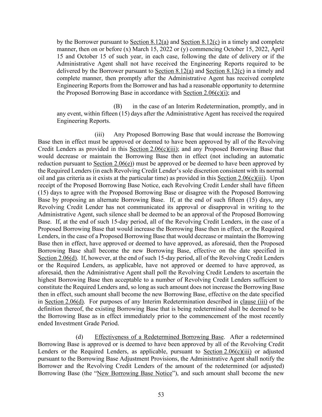 53 by the Borrower pursuant to Section 8.12(a) and Section 8.12(c) in a timely and complete manner, then on or before (x) March 15, 2022 or (y) commencing October 15, 2022, April 15 and October 15 of such year, in each case, following the date of delivery or if the Administrative Agent shall not have received the Engineering Reports required to be delivered by the Borrower pursuant to Section 8.12(a) and Section 8.12(c) in a timely and complete manner, then promptly after the Administrative Agent has received complete Engineering Reports from the Borrower and has had a reasonable opportunity to determine the Proposed Borrowing Base in accordance with Section 2.06(c)(i); and (B) in the case of an Interim Redetermination, promptly, and in any event, within fifteen (15) days after the Administrative Agent has received the required Engineering Reports. (iii) Any Proposed Borrowing Base that would increase the Borrowing Base then in effect must be approved or deemed to have been approved by all of the Revolving Credit Lenders as provided in this Section 2.06(c)(iii); and any Proposed Borrowing Base that would decrease or maintain the Borrowing Base then in effect (not including an automatic reduction pursuant to Section 2.06(e)) must be approved or be deemed to have been approved by the Required Lenders (in each Revolving Credit Lender’s sole discretion consistent with its normal oil and gas criteria as it exists at the particular time) as provided in this Section 2.06(c)(iii). Upon receipt of the Proposed Borrowing Base Notice, each Revolving Credit Lender shall have fifteen (15) days to agree with the Proposed Borrowing Base or disagree with the Proposed Borrowing Base by proposing an alternate Borrowing Base. If, at the end of such fifteen (15) days, any Revolving Credit Lender has not communicated its approval or disapproval in writing to the Administrative Agent, such silence shall be deemed to be an approval of the Proposed Borrowing Base. If, at the end of such 15-day period, all of the Revolving Credit Lenders, in the case of a Proposed Borrowing Base that would increase the Borrowing Base then in effect, or the Required Lenders, in the case of a Proposed Borrowing Base that would decrease or maintain the Borrowing Base then in effect, have approved or deemed to have approved, as aforesaid, then the Proposed Borrowing Base shall become the new Borrowing Base, effective on the date specified in Section 2.06(d). If, however, at the end of such 15-day period, all of the Revolving Credit Lenders or the Required Lenders, as applicable, have not approved or deemed to have approved, as aforesaid, then the Administrative Agent shall poll the Revolving Credit Lenders to ascertain the highest Borrowing Base then acceptable to a number of Revolving Credit Lenders sufficient to constitute the Required Lenders and, so long as such amount does not increase the Borrowing Base then in effect, such amount shall become the new Borrowing Base, effective on the date specified in Section 2.06(d). For purposes of any Interim Redetermination described in clause (iii) of the definition thereof, the existing Borrowing Base that is being redetermined shall be deemed to be the Borrowing Base as in effect immediately prior to the commencement of the most recently ended Investment Grade Period. (d) Effectiveness of a Redetermined Borrowing Base. After a redetermined Borrowing Base is approved or is deemed to have been approved by all of the Revolving Credit Lenders or the Required Lenders, as applicable, pursuant to Section 2.06(c)(iii) or adjusted pursuant to the Borrowing Base Adjustment Provisions, the Administrative Agent shall notify the Borrower and the Revolving Credit Lenders of the amount of the redetermined (or adjusted) Borrowing Base (the “New Borrowing Base Notice”), and such amount shall become the new