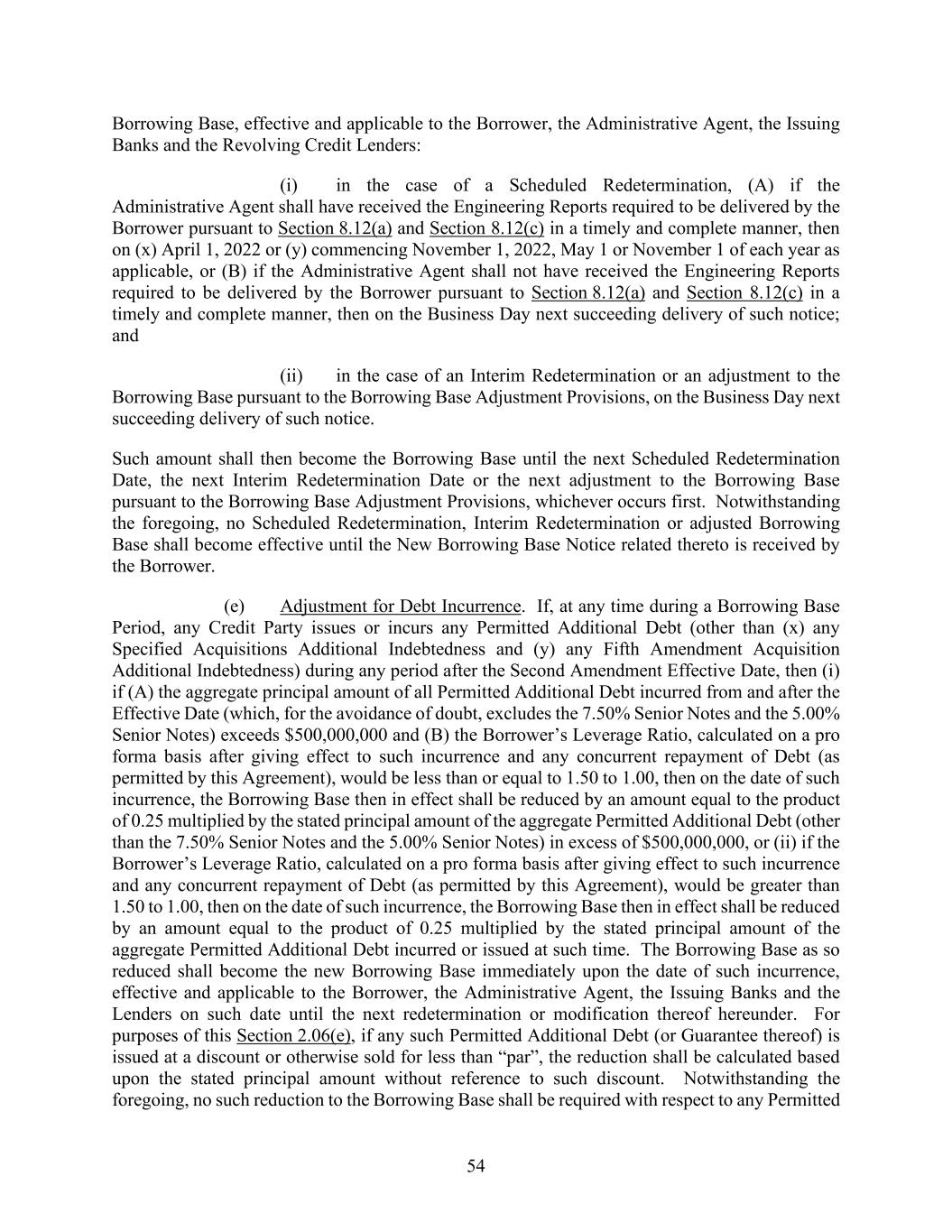 54 Borrowing Base, effective and applicable to the Borrower, the Administrative Agent, the Issuing Banks and the Revolving Credit Lenders: (i) in the case of a Scheduled Redetermination, (A) if the Administrative Agent shall have received the Engineering Reports required to be delivered by the Borrower pursuant to Section 8.12(a) and Section 8.12(c) in a timely and complete manner, then on (x) April 1, 2022 or (y) commencing November 1, 2022, May 1 or November 1 of each year as applicable, or (B) if the Administrative Agent shall not have received the Engineering Reports required to be delivered by the Borrower pursuant to Section 8.12(a) and Section 8.12(c) in a timely and complete manner, then on the Business Day next succeeding delivery of such notice; and (ii) in the case of an Interim Redetermination or an adjustment to the Borrowing Base pursuant to the Borrowing Base Adjustment Provisions, on the Business Day next succeeding delivery of such notice. Such amount shall then become the Borrowing Base until the next Scheduled Redetermination Date, the next Interim Redetermination Date or the next adjustment to the Borrowing Base pursuant to the Borrowing Base Adjustment Provisions, whichever occurs first. Notwithstanding the foregoing, no Scheduled Redetermination, Interim Redetermination or adjusted Borrowing Base shall become effective until the New Borrowing Base Notice related thereto is received by the Borrower. (e) Adjustment for Debt Incurrence. If, at any time during a Borrowing Base Period, any Credit Party issues or incurs any Permitted Additional Debt (other than (x) any Specified Acquisitions Additional Indebtedness and (y) any Fifth Amendment Acquisition Additional Indebtedness) during any period after the Second Amendment Effective Date, then (i) if (A) the aggregate principal amount of all Permitted Additional Debt incurred from and after the Effective Date (which, for the avoidance of doubt, excludes the 7.50% Senior Notes and the 5.00% Senior Notes) exceeds $500,000,000 and (B) the Borrower’s Leverage Ratio, calculated on a pro forma basis after giving effect to such incurrence and any concurrent repayment of Debt (as permitted by this Agreement), would be less than or equal to 1.50 to 1.00, then on the date of such incurrence, the Borrowing Base then in effect shall be reduced by an amount equal to the product of 0.25 multiplied by the stated principal amount of the aggregate Permitted Additional Debt (other than the 7.50% Senior Notes and the 5.00% Senior Notes) in excess of $500,000,000, or (ii) if the Borrower’s Leverage Ratio, calculated on a pro forma basis after giving effect to such incurrence and any concurrent repayment of Debt (as permitted by this Agreement), would be greater than 1.50 to 1.00, then on the date of such incurrence, the Borrowing Base then in effect shall be reduced by an amount equal to the product of 0.25 multiplied by the stated principal amount of the aggregate Permitted Additional Debt incurred or issued at such time. The Borrowing Base as so reduced shall become the new Borrowing Base immediately upon the date of such incurrence, effective and applicable to the Borrower, the Administrative Agent, the Issuing Banks and the Lenders on such date until the next redetermination or modification thereof hereunder. For purposes of this Section 2.06(e), if any such Permitted Additional Debt (or Guarantee thereof) is issued at a discount or otherwise sold for less than “par”, the reduction shall be calculated based upon the stated principal amount without reference to such discount. Notwithstanding the foregoing, no such reduction to the Borrowing Base shall be required with respect to any Permitted