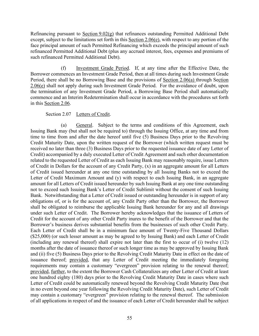 55 Refinancing pursuant to Section 9.02(g) that refinances outstanding Permitted Additional Debt except, subject to the limitations set forth in this Section 2.06(e), with respect to any portion of the face principal amount of such Permitted Refinancing which exceeds the principal amount of such refinanced Permitted Additional Debt (plus any accrued interest, fees, expenses and premiums of such refinanced Permitted Additional Debt). (f) Investment Grade Period. If, at any time after the Effective Date, the Borrower commences an Investment Grade Period, then at all times during such Investment Grade Period, there shall be no Borrowing Base and the provisions of Section 2.06(a) through Section 2.06(e) shall not apply during such Investment Grade Period. For the avoidance of doubt, upon the termination of any Investment Grade Period, a Borrowing Base Period shall automatically commence and an Interim Redetermination shall occur in accordance with the procedures set forth in this Section 2.06. Section 2.07 Letters of Credit. (a) General. Subject to the terms and conditions of this Agreement, each Issuing Bank may (but shall not be required to) through the Issuing Office, at any time and from time to time from and after the date hereof until five (5) Business Days prior to the Revolving Credit Maturity Date, upon the written request of the Borrower (which written request must be received no later than three (3) Business Days prior to the requested issuance date of any Letter of Credit) accompanied by a duly executed Letter of Credit Agreement and such other documentation related to the requested Letter of Credit as each Issuing Bank may reasonably require, issue Letters of Credit in Dollars for the account of any Credit Party, (x) in an aggregate amount for all Letters of Credit issued hereunder at any one time outstanding by all Issuing Banks not to exceed the Letter of Credit Maximum Amount and (y) with respect to each Issuing Bank, in an aggregate amount for all Letters of Credit issued hereunder by such Issuing Bank at any one time outstanding not to exceed such Issuing Bank’s Letter of Credit Sublimit without the consent of such Issuing Bank. Notwithstanding that a Letter of Credit issued or outstanding hereunder is in support of any obligations of, or is for the account of, any Credit Party other than the Borrower, the Borrower shall be obligated to reimburse the applicable Issuing Bank hereunder for any and all drawings under such Letter of Credit. The Borrower hereby acknowledges that the issuance of Letters of Credit for the account of any other Credit Party inures to the benefit of the Borrower and that the Borrower’s business derives substantial benefits from the businesses of such other Credit Party. Each Letter of Credit shall be in a minimum face amount of Twenty-Five Thousand Dollars ($25,000) (or such lesser amount as may be agreed to by Issuing Bank) and each Letter of Credit (including any renewal thereof) shall expire not later than the first to occur of (i) twelve (12) months after the date of issuance thereof or such longer time as may be approved by Issuing Bank and (ii) five (5) Business Days prior to the Revolving Credit Maturity Date in effect on the date of issuance thereof; provided, that any Letter of Credit meeting the immediately foregoing requirements may contain a customary “evergreen” provision relating to the renewal thereof; provided, further, to the extent the Borrower Cash Collateralizes any other Letter of Credit at least one hundred eighty (180) days prior to the Revolving Credit Maturity Date in cases where such Letter of Credit could be automatically renewed beyond the Revolving Credit Maturity Date (but in no event beyond one year following the Revolving Credit Maturity Date), such Letter of Credit may contain a customary “evergreen” provision relating to the renewal thereof. The submission of all applications in respect of and the issuance of each Letter of Credit hereunder shall be subject