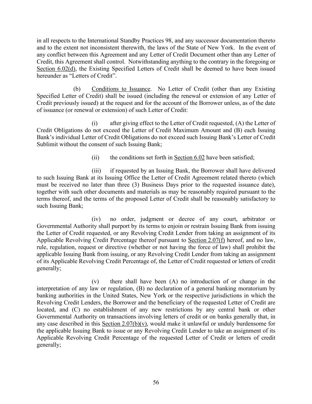 56 in all respects to the International Standby Practices 98, and any successor documentation thereto and to the extent not inconsistent therewith, the laws of the State of New York. In the event of any conflict between this Agreement and any Letter of Credit Document other than any Letter of Credit, this Agreement shall control. Notwithstanding anything to the contrary in the foregoing or Section 6.02(d), the Existing Specified Letters of Credit shall be deemed to have been issued hereunder as “Letters of Credit”. (b) Conditions to Issuance. No Letter of Credit (other than any Existing Specified Letter of Credit) shall be issued (including the renewal or extension of any Letter of Credit previously issued) at the request and for the account of the Borrower unless, as of the date of issuance (or renewal or extension) of such Letter of Credit: (i) after giving effect to the Letter of Credit requested, (A) the Letter of Credit Obligations do not exceed the Letter of Credit Maximum Amount and (B) each Issuing Bank’s individual Letter of Credit Obligations do not exceed such Issuing Bank’s Letter of Credit Sublimit without the consent of such Issuing Bank; (ii) the conditions set forth in Section 6.02 have been satisfied; (iii) if requested by an Issuing Bank, the Borrower shall have delivered to such Issuing Bank at its Issuing Office the Letter of Credit Agreement related thereto (which must be received no later than three (3) Business Days prior to the requested issuance date), together with such other documents and materials as may be reasonably required pursuant to the terms thereof, and the terms of the proposed Letter of Credit shall be reasonably satisfactory to such Issuing Bank; (iv) no order, judgment or decree of any court, arbitrator or Governmental Authority shall purport by its terms to enjoin or restrain Issuing Bank from issuing the Letter of Credit requested, or any Revolving Credit Lender from taking an assignment of its Applicable Revolving Credit Percentage thereof pursuant to Section 2.07(f) hereof, and no law, rule, regulation, request or directive (whether or not having the force of law) shall prohibit the applicable Issuing Bank from issuing, or any Revolving Credit Lender from taking an assignment of its Applicable Revolving Credit Percentage of, the Letter of Credit requested or letters of credit generally; (v) there shall have been (A) no introduction of or change in the interpretation of any law or regulation, (B) no declaration of a general banking moratorium by banking authorities in the United States, New York or the respective jurisdictions in which the Revolving Credit Lenders, the Borrower and the beneficiary of the requested Letter of Credit are located, and (C) no establishment of any new restrictions by any central bank or other Governmental Authority on transactions involving letters of credit or on banks generally that, in any case described in this Section 2.07(b)(v), would make it unlawful or unduly burdensome for the applicable Issuing Bank to issue or any Revolving Credit Lender to take an assignment of its Applicable Revolving Credit Percentage of the requested Letter of Credit or letters of credit generally;
