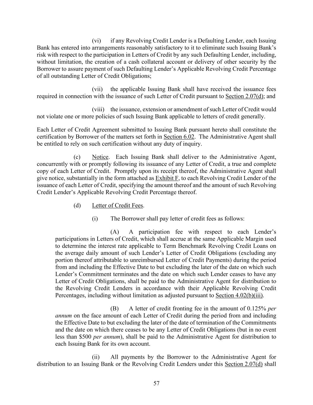 57 (vi) if any Revolving Credit Lender is a Defaulting Lender, each Issuing Bank has entered into arrangements reasonably satisfactory to it to eliminate such Issuing Bank’s risk with respect to the participation in Letters of Credit by any such Defaulting Lender, including, without limitation, the creation of a cash collateral account or delivery of other security by the Borrower to assure payment of such Defaulting Lender’s Applicable Revolving Credit Percentage of all outstanding Letter of Credit Obligations; (vii) the applicable Issuing Bank shall have received the issuance fees required in connection with the issuance of such Letter of Credit pursuant to Section 2.07(d); and (viii) the issuance, extension or amendment of such Letter of Credit would not violate one or more policies of such Issuing Bank applicable to letters of credit generally. Each Letter of Credit Agreement submitted to Issuing Bank pursuant hereto shall constitute the certification by Borrower of the matters set forth in Section 6.02. The Administrative Agent shall be entitled to rely on such certification without any duty of inquiry. (c) Notice. Each Issuing Bank shall deliver to the Administrative Agent, concurrently with or promptly following its issuance of any Letter of Credit, a true and complete copy of each Letter of Credit. Promptly upon its receipt thereof, the Administrative Agent shall give notice, substantially in the form attached as Exhibit F, to each Revolving Credit Lender of the issuance of each Letter of Credit, specifying the amount thereof and the amount of such Revolving Credit Lender’s Applicable Revolving Credit Percentage thereof. (d) Letter of Credit Fees. (i) The Borrower shall pay letter of credit fees as follows: (A) A participation fee with respect to each Lender’s participations in Letters of Credit, which shall accrue at the same Applicable Margin used to determine the interest rate applicable to Term Benchmark Revolving Credit Loans on the average daily amount of such Lender’s Letter of Credit Obligations (excluding any portion thereof attributable to unreimbursed Letter of Credit Payments) during the period from and including the Effective Date to but excluding the later of the date on which such Lender’s Commitment terminates and the date on which such Lender ceases to have any Letter of Credit Obligations, shall be paid to the Administrative Agent for distribution to the Revolving Credit Lenders in accordance with their Applicable Revolving Credit Percentages, including without limitation as adjusted pursuant to Section 4.02(b)(iii). (B) A letter of credit fronting fee in the amount of 0.125% per annum on the face amount of each Letter of Credit during the period from and including the Effective Date to but excluding the later of the date of termination of the Commitments and the date on which there ceases to be any Letter of Credit Obligations (but in no event less than $500 per annum), shall be paid to the Administrative Agent for distribution to each Issuing Bank for its own account. (ii) All payments by the Borrower to the Administrative Agent for distribution to an Issuing Bank or the Revolving Credit Lenders under this Section 2.07(d) shall