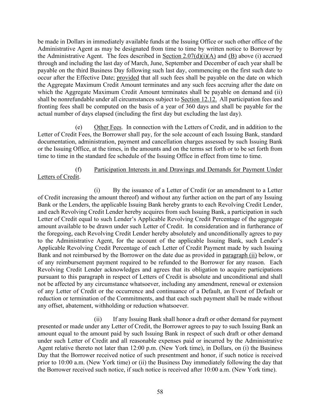 58 be made in Dollars in immediately available funds at the Issuing Office or such other office of the Administrative Agent as may be designated from time to time by written notice to Borrower by the Administrative Agent. The fees described in Section 2.07(d)(i)(A) and (B) above (i) accrued through and including the last day of March, June, September and December of each year shall be payable on the third Business Day following such last day, commencing on the first such date to occur after the Effective Date; provided that all such fees shall be payable on the date on which the Aggregate Maximum Credit Amount terminates and any such fees accruing after the date on which the Aggregate Maximum Credit Amount terminates shall be payable on demand and (ii) shall be nonrefundable under all circumstances subject to Section 12.12. All participation fees and fronting fees shall be computed on the basis of a year of 360 days and shall be payable for the actual number of days elapsed (including the first day but excluding the last day). (e) Other Fees. In connection with the Letters of Credit, and in addition to the Letter of Credit Fees, the Borrower shall pay, for the sole account of each Issuing Bank, standard documentation, administration, payment and cancellation charges assessed by such Issuing Bank or the Issuing Office, at the times, in the amounts and on the terms set forth or to be set forth from time to time in the standard fee schedule of the Issuing Office in effect from time to time. (f) Participation Interests in and Drawings and Demands for Payment Under Letters of Credit. (i) By the issuance of a Letter of Credit (or an amendment to a Letter of Credit increasing the amount thereof) and without any further action on the part of any Issuing Bank or the Lenders, the applicable Issuing Bank hereby grants to each Revolving Credit Lender, and each Revolving Credit Lender hereby acquires from such Issuing Bank, a participation in such Letter of Credit equal to such Lender’s Applicable Revolving Credit Percentage of the aggregate amount available to be drawn under such Letter of Credit. In consideration and in furtherance of the foregoing, each Revolving Credit Lender hereby absolutely and unconditionally agrees to pay to the Administrative Agent, for the account of the applicable Issuing Bank, such Lender’s Applicable Revolving Credit Percentage of each Letter of Credit Payment made by such Issuing Bank and not reimbursed by the Borrower on the date due as provided in paragraph (ii) below, or of any reimbursement payment required to be refunded to the Borrower for any reason. Each Revolving Credit Lender acknowledges and agrees that its obligation to acquire participations pursuant to this paragraph in respect of Letters of Credit is absolute and unconditional and shall not be affected by any circumstance whatsoever, including any amendment, renewal or extension of any Letter of Credit or the occurrence and continuance of a Default, an Event of Default or reduction or termination of the Commitments, and that each such payment shall be made without any offset, abatement, withholding or reduction whatsoever. (ii) If any Issuing Bank shall honor a draft or other demand for payment presented or made under any Letter of Credit, the Borrower agrees to pay to such Issuing Bank an amount equal to the amount paid by such Issuing Bank in respect of such draft or other demand under such Letter of Credit and all reasonable expenses paid or incurred by the Administrative Agent relative thereto not later than 12:00 p.m. (New York time), in Dollars, on (i) the Business Day that the Borrower received notice of such presentment and honor, if such notice is received prior to 10:00 a.m. (New York time) or (ii) the Business Day immediately following the day that the Borrower received such notice, if such notice is received after 10:00 a.m. (New York time).