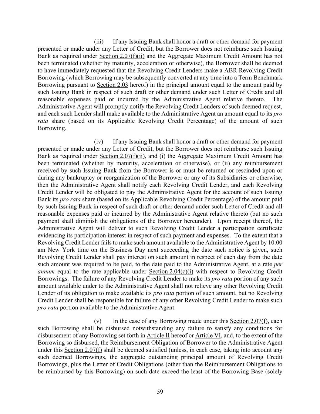 59 (iii) If any Issuing Bank shall honor a draft or other demand for payment presented or made under any Letter of Credit, but the Borrower does not reimburse such Issuing Bank as required under Section 2.07(f)(ii) and the Aggregate Maximum Credit Amount has not been terminated (whether by maturity, acceleration or otherwise), the Borrower shall be deemed to have immediately requested that the Revolving Credit Lenders make a ABR Revolving Credit Borrowing (which Borrowing may be subsequently converted at any time into a Term Benchmark Borrowing pursuant to Section 2.03 hereof) in the principal amount equal to the amount paid by such Issuing Bank in respect of such draft or other demand under such Letter of Credit and all reasonable expenses paid or incurred by the Administrative Agent relative thereto. The Administrative Agent will promptly notify the Revolving Credit Lenders of such deemed request, and each such Lender shall make available to the Administrative Agent an amount equal to its pro rata share (based on its Applicable Revolving Credit Percentage) of the amount of such Borrowing. (iv) If any Issuing Bank shall honor a draft or other demand for payment presented or made under any Letter of Credit, but the Borrower does not reimburse such Issuing Bank as required under Section 2.07(f)(ii), and (i) the Aggregate Maximum Credit Amount has been terminated (whether by maturity, acceleration or otherwise), or (ii) any reimbursement received by such Issuing Bank from the Borrower is or must be returned or rescinded upon or during any bankruptcy or reorganization of the Borrower or any of its Subsidiaries or otherwise, then the Administrative Agent shall notify each Revolving Credit Lender, and each Revolving Credit Lender will be obligated to pay the Administrative Agent for the account of such Issuing Bank its pro rata share (based on its Applicable Revolving Credit Percentage) of the amount paid by such Issuing Bank in respect of such draft or other demand under such Letter of Credit and all reasonable expenses paid or incurred by the Administrative Agent relative thereto (but no such payment shall diminish the obligations of the Borrower hereunder). Upon receipt thereof, the Administrative Agent will deliver to such Revolving Credit Lender a participation certificate evidencing its participation interest in respect of such payment and expenses. To the extent that a Revolving Credit Lender fails to make such amount available to the Administrative Agent by 10:00 am New York time on the Business Day next succeeding the date such notice is given, such Revolving Credit Lender shall pay interest on such amount in respect of each day from the date such amount was required to be paid, to the date paid to the Administrative Agent, at a rate per annum equal to the rate applicable under Section 2.04(c)(i) with respect to Revolving Credit Borrowings. The failure of any Revolving Credit Lender to make its pro rata portion of any such amount available under to the Administrative Agent shall not relieve any other Revolving Credit Lender of its obligation to make available its pro rata portion of such amount, but no Revolving Credit Lender shall be responsible for failure of any other Revolving Credit Lender to make such pro rata portion available to the Administrative Agent. (v) In the case of any Borrowing made under this Section 2.07(f), each such Borrowing shall be disbursed notwithstanding any failure to satisfy any conditions for disbursement of any Borrowing set forth in Article II hereof or Article VI, and, to the extent of the Borrowing so disbursed, the Reimbursement Obligation of Borrower to the Administrative Agent under this Section 2.07(f) shall be deemed satisfied (unless, in each case, taking into account any such deemed Borrowings, the aggregate outstanding principal amount of Revolving Credit Borrowings, plus the Letter of Credit Obligations (other than the Reimbursement Obligations to be reimbursed by this Borrowing) on such date exceed the least of the Borrowing Base (solely