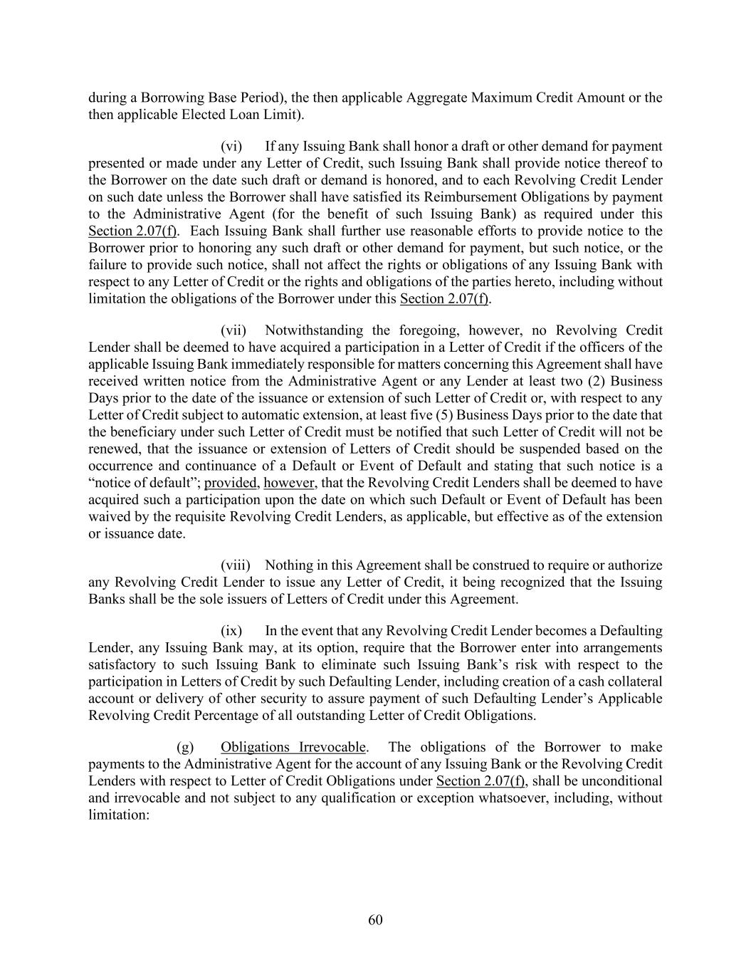 60 during a Borrowing Base Period), the then applicable Aggregate Maximum Credit Amount or the then applicable Elected Loan Limit). (vi) If any Issuing Bank shall honor a draft or other demand for payment presented or made under any Letter of Credit, such Issuing Bank shall provide notice thereof to the Borrower on the date such draft or demand is honored, and to each Revolving Credit Lender on such date unless the Borrower shall have satisfied its Reimbursement Obligations by payment to the Administrative Agent (for the benefit of such Issuing Bank) as required under this Section 2.07(f). Each Issuing Bank shall further use reasonable efforts to provide notice to the Borrower prior to honoring any such draft or other demand for payment, but such notice, or the failure to provide such notice, shall not affect the rights or obligations of any Issuing Bank with respect to any Letter of Credit or the rights and obligations of the parties hereto, including without limitation the obligations of the Borrower under this Section 2.07(f). (vii) Notwithstanding the foregoing, however, no Revolving Credit Lender shall be deemed to have acquired a participation in a Letter of Credit if the officers of the applicable Issuing Bank immediately responsible for matters concerning this Agreement shall have received written notice from the Administrative Agent or any Lender at least two (2) Business Days prior to the date of the issuance or extension of such Letter of Credit or, with respect to any Letter of Credit subject to automatic extension, at least five (5) Business Days prior to the date that the beneficiary under such Letter of Credit must be notified that such Letter of Credit will not be renewed, that the issuance or extension of Letters of Credit should be suspended based on the occurrence and continuance of a Default or Event of Default and stating that such notice is a “notice of default”; provided, however, that the Revolving Credit Lenders shall be deemed to have acquired such a participation upon the date on which such Default or Event of Default has been waived by the requisite Revolving Credit Lenders, as applicable, but effective as of the extension or issuance date. (viii) Nothing in this Agreement shall be construed to require or authorize any Revolving Credit Lender to issue any Letter of Credit, it being recognized that the Issuing Banks shall be the sole issuers of Letters of Credit under this Agreement. (ix) In the event that any Revolving Credit Lender becomes a Defaulting Lender, any Issuing Bank may, at its option, require that the Borrower enter into arrangements satisfactory to such Issuing Bank to eliminate such Issuing Bank’s risk with respect to the participation in Letters of Credit by such Defaulting Lender, including creation of a cash collateral account or delivery of other security to assure payment of such Defaulting Lender’s Applicable Revolving Credit Percentage of all outstanding Letter of Credit Obligations. (g) Obligations Irrevocable. The obligations of the Borrower to make payments to the Administrative Agent for the account of any Issuing Bank or the Revolving Credit Lenders with respect to Letter of Credit Obligations under Section 2.07(f), shall be unconditional and irrevocable and not subject to any qualification or exception whatsoever, including, without limitation: