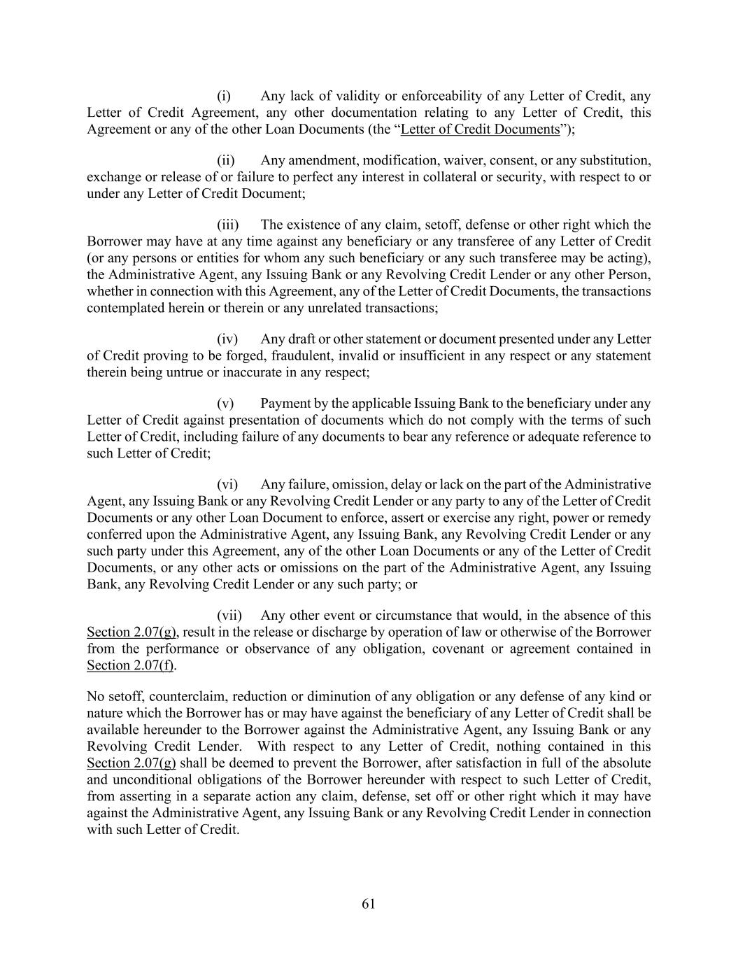 61 (i) Any lack of validity or enforceability of any Letter of Credit, any Letter of Credit Agreement, any other documentation relating to any Letter of Credit, this Agreement or any of the other Loan Documents (the “Letter of Credit Documents”); (ii) Any amendment, modification, waiver, consent, or any substitution, exchange or release of or failure to perfect any interest in collateral or security, with respect to or under any Letter of Credit Document; (iii) The existence of any claim, setoff, defense or other right which the Borrower may have at any time against any beneficiary or any transferee of any Letter of Credit (or any persons or entities for whom any such beneficiary or any such transferee may be acting), the Administrative Agent, any Issuing Bank or any Revolving Credit Lender or any other Person, whether in connection with this Agreement, any of the Letter of Credit Documents, the transactions contemplated herein or therein or any unrelated transactions; (iv) Any draft or other statement or document presented under any Letter of Credit proving to be forged, fraudulent, invalid or insufficient in any respect or any statement therein being untrue or inaccurate in any respect; (v) Payment by the applicable Issuing Bank to the beneficiary under any Letter of Credit against presentation of documents which do not comply with the terms of such Letter of Credit, including failure of any documents to bear any reference or adequate reference to such Letter of Credit; (vi) Any failure, omission, delay or lack on the part of the Administrative Agent, any Issuing Bank or any Revolving Credit Lender or any party to any of the Letter of Credit Documents or any other Loan Document to enforce, assert or exercise any right, power or remedy conferred upon the Administrative Agent, any Issuing Bank, any Revolving Credit Lender or any such party under this Agreement, any of the other Loan Documents or any of the Letter of Credit Documents, or any other acts or omissions on the part of the Administrative Agent, any Issuing Bank, any Revolving Credit Lender or any such party; or (vii) Any other event or circumstance that would, in the absence of this Section 2.07(g), result in the release or discharge by operation of law or otherwise of the Borrower from the performance or observance of any obligation, covenant or agreement contained in Section 2.07(f). No setoff, counterclaim, reduction or diminution of any obligation or any defense of any kind or nature which the Borrower has or may have against the beneficiary of any Letter of Credit shall be available hereunder to the Borrower against the Administrative Agent, any Issuing Bank or any Revolving Credit Lender. With respect to any Letter of Credit, nothing contained in this Section 2.07(g) shall be deemed to prevent the Borrower, after satisfaction in full of the absolute and unconditional obligations of the Borrower hereunder with respect to such Letter of Credit, from asserting in a separate action any claim, defense, set off or other right which it may have against the Administrative Agent, any Issuing Bank or any Revolving Credit Lender in connection with such Letter of Credit.