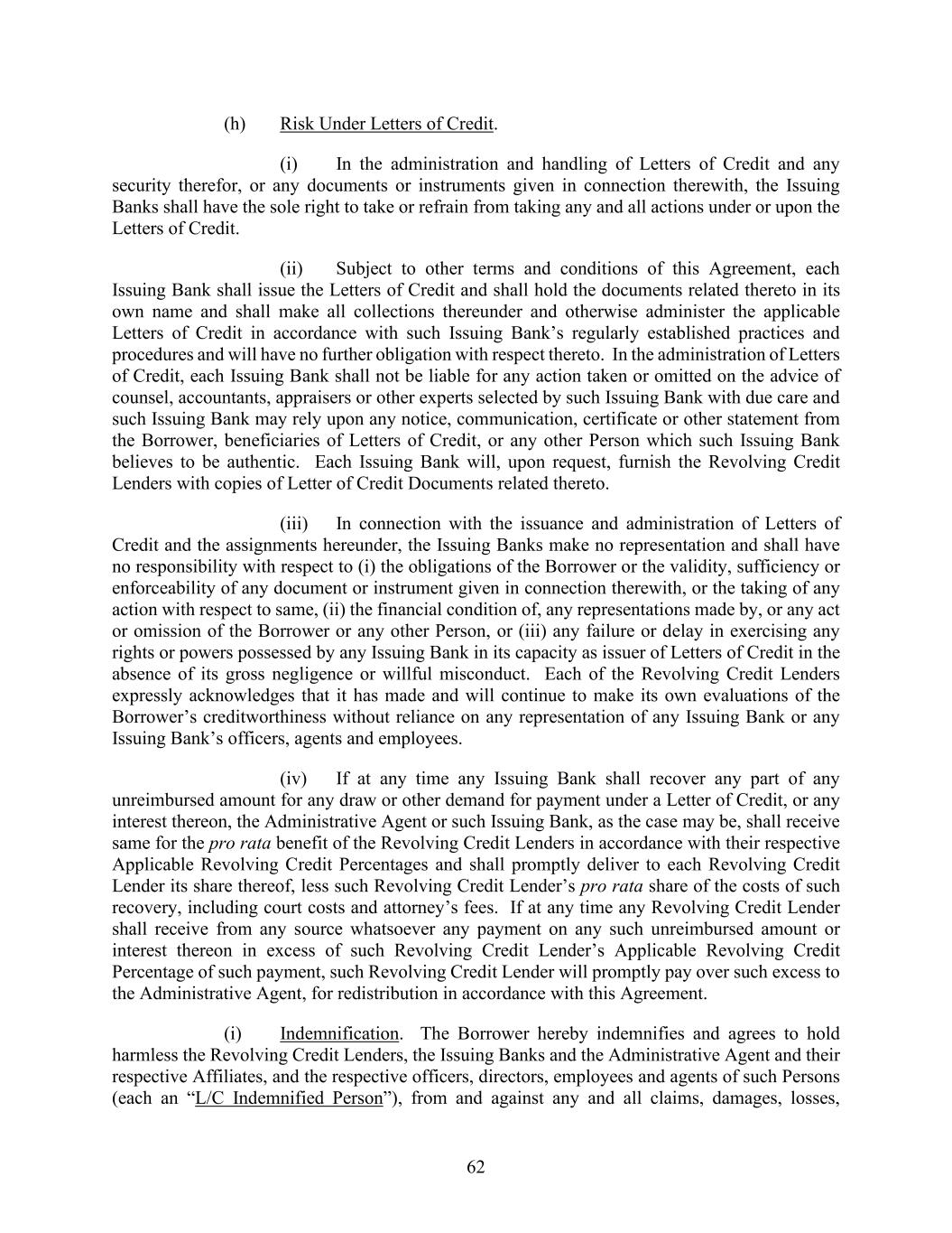 62 (h) Risk Under Letters of Credit. (i) In the administration and handling of Letters of Credit and any security therefor, or any documents or instruments given in connection therewith, the Issuing Banks shall have the sole right to take or refrain from taking any and all actions under or upon the Letters of Credit. (ii) Subject to other terms and conditions of this Agreement, each Issuing Bank shall issue the Letters of Credit and shall hold the documents related thereto in its own name and shall make all collections thereunder and otherwise administer the applicable Letters of Credit in accordance with such Issuing Bank’s regularly established practices and procedures and will have no further obligation with respect thereto. In the administration of Letters of Credit, each Issuing Bank shall not be liable for any action taken or omitted on the advice of counsel, accountants, appraisers or other experts selected by such Issuing Bank with due care and such Issuing Bank may rely upon any notice, communication, certificate or other statement from the Borrower, beneficiaries of Letters of Credit, or any other Person which such Issuing Bank believes to be authentic. Each Issuing Bank will, upon request, furnish the Revolving Credit Lenders with copies of Letter of Credit Documents related thereto. (iii) In connection with the issuance and administration of Letters of Credit and the assignments hereunder, the Issuing Banks make no representation and shall have no responsibility with respect to (i) the obligations of the Borrower or the validity, sufficiency or enforceability of any document or instrument given in connection therewith, or the taking of any action with respect to same, (ii) the financial condition of, any representations made by, or any act or omission of the Borrower or any other Person, or (iii) any failure or delay in exercising any rights or powers possessed by any Issuing Bank in its capacity as issuer of Letters of Credit in the absence of its gross negligence or willful misconduct. Each of the Revolving Credit Lenders expressly acknowledges that it has made and will continue to make its own evaluations of the Borrower’s creditworthiness without reliance on any representation of any Issuing Bank or any Issuing Bank’s officers, agents and employees. (iv) If at any time any Issuing Bank shall recover any part of any unreimbursed amount for any draw or other demand for payment under a Letter of Credit, or any interest thereon, the Administrative Agent or such Issuing Bank, as the case may be, shall receive same for the pro rata benefit of the Revolving Credit Lenders in accordance with their respective Applicable Revolving Credit Percentages and shall promptly deliver to each Revolving Credit Lender its share thereof, less such Revolving Credit Lender’s pro rata share of the costs of such recovery, including court costs and attorney’s fees. If at any time any Revolving Credit Lender shall receive from any source whatsoever any payment on any such unreimbursed amount or interest thereon in excess of such Revolving Credit Lender’s Applicable Revolving Credit Percentage of such payment, such Revolving Credit Lender will promptly pay over such excess to the Administrative Agent, for redistribution in accordance with this Agreement. (i) Indemnification. The Borrower hereby indemnifies and agrees to hold harmless the Revolving Credit Lenders, the Issuing Banks and the Administrative Agent and their respective Affiliates, and the respective officers, directors, employees and agents of such Persons (each an “L/C Indemnified Person”), from and against any and all claims, damages, losses,