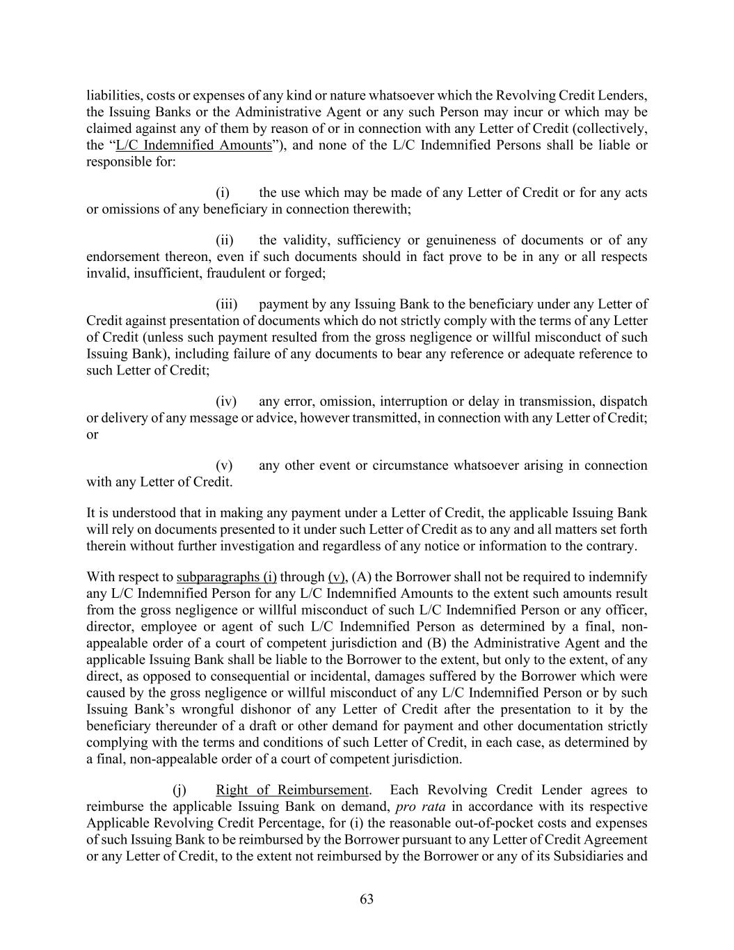 63 liabilities, costs or expenses of any kind or nature whatsoever which the Revolving Credit Lenders, the Issuing Banks or the Administrative Agent or any such Person may incur or which may be claimed against any of them by reason of or in connection with any Letter of Credit (collectively, the “L/C Indemnified Amounts”), and none of the L/C Indemnified Persons shall be liable or responsible for: (i) the use which may be made of any Letter of Credit or for any acts or omissions of any beneficiary in connection therewith; (ii) the validity, sufficiency or genuineness of documents or of any endorsement thereon, even if such documents should in fact prove to be in any or all respects invalid, insufficient, fraudulent or forged; (iii) payment by any Issuing Bank to the beneficiary under any Letter of Credit against presentation of documents which do not strictly comply with the terms of any Letter of Credit (unless such payment resulted from the gross negligence or willful misconduct of such Issuing Bank), including failure of any documents to bear any reference or adequate reference to such Letter of Credit; (iv) any error, omission, interruption or delay in transmission, dispatch or delivery of any message or advice, however transmitted, in connection with any Letter of Credit; or (v) any other event or circumstance whatsoever arising in connection with any Letter of Credit. It is understood that in making any payment under a Letter of Credit, the applicable Issuing Bank will rely on documents presented to it under such Letter of Credit as to any and all matters set forth therein without further investigation and regardless of any notice or information to the contrary. With respect to subparagraphs (i) through (v), (A) the Borrower shall not be required to indemnify any L/C Indemnified Person for any L/C Indemnified Amounts to the extent such amounts result from the gross negligence or willful misconduct of such L/C Indemnified Person or any officer, director, employee or agent of such L/C Indemnified Person as determined by a final, non- appealable order of a court of competent jurisdiction and (B) the Administrative Agent and the applicable Issuing Bank shall be liable to the Borrower to the extent, but only to the extent, of any direct, as opposed to consequential or incidental, damages suffered by the Borrower which were caused by the gross negligence or willful misconduct of any L/C Indemnified Person or by such Issuing Bank’s wrongful dishonor of any Letter of Credit after the presentation to it by the beneficiary thereunder of a draft or other demand for payment and other documentation strictly complying with the terms and conditions of such Letter of Credit, in each case, as determined by a final, non-appealable order of a court of competent jurisdiction. (j) Right of Reimbursement. Each Revolving Credit Lender agrees to reimburse the applicable Issuing Bank on demand, pro rata in accordance with its respective Applicable Revolving Credit Percentage, for (i) the reasonable out-of-pocket costs and expenses of such Issuing Bank to be reimbursed by the Borrower pursuant to any Letter of Credit Agreement or any Letter of Credit, to the extent not reimbursed by the Borrower or any of its Subsidiaries and