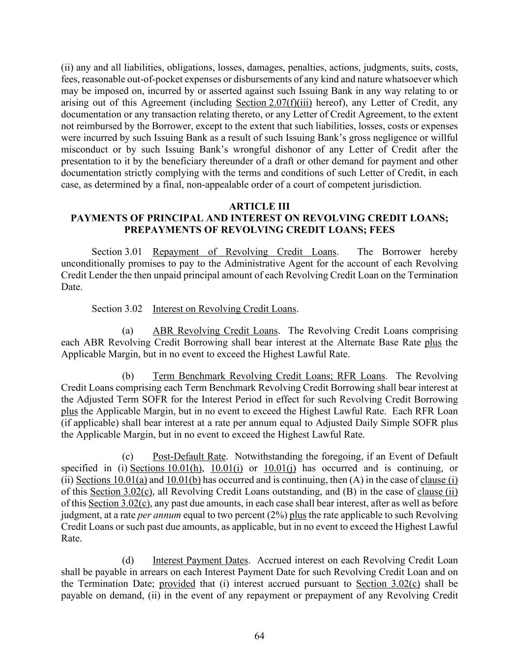 64 (ii) any and all liabilities, obligations, losses, damages, penalties, actions, judgments, suits, costs, fees, reasonable out-of-pocket expenses or disbursements of any kind and nature whatsoever which may be imposed on, incurred by or asserted against such Issuing Bank in any way relating to or arising out of this Agreement (including Section 2.07(f)(iii) hereof), any Letter of Credit, any documentation or any transaction relating thereto, or any Letter of Credit Agreement, to the extent not reimbursed by the Borrower, except to the extent that such liabilities, losses, costs or expenses were incurred by such Issuing Bank as a result of such Issuing Bank’s gross negligence or willful misconduct or by such Issuing Bank’s wrongful dishonor of any Letter of Credit after the presentation to it by the beneficiary thereunder of a draft or other demand for payment and other documentation strictly complying with the terms and conditions of such Letter of Credit, in each case, as determined by a final, non-appealable order of a court of competent jurisdiction. ARTICLE III PAYMENTS OF PRINCIPAL AND INTEREST ON REVOLVING CREDIT LOANS; PREPAYMENTS OF REVOLVING CREDIT LOANS; FEES Section 3.01 Repayment of Revolving Credit Loans. The Borrower hereby unconditionally promises to pay to the Administrative Agent for the account of each Revolving Credit Lender the then unpaid principal amount of each Revolving Credit Loan on the Termination Date. Section 3.02 Interest on Revolving Credit Loans. (a) ABR Revolving Credit Loans. The Revolving Credit Loans comprising each ABR Revolving Credit Borrowing shall bear interest at the Alternate Base Rate plus the Applicable Margin, but in no event to exceed the Highest Lawful Rate. (b) Term Benchmark Revolving Credit Loans; RFR Loans. The Revolving Credit Loans comprising each Term Benchmark Revolving Credit Borrowing shall bear interest at the Adjusted Term SOFR for the Interest Period in effect for such Revolving Credit Borrowing plus the Applicable Margin, but in no event to exceed the Highest Lawful Rate. Each RFR Loan (if applicable) shall bear interest at a rate per annum equal to Adjusted Daily Simple SOFR plus the Applicable Margin, but in no event to exceed the Highest Lawful Rate. (c) Post-Default Rate. Notwithstanding the foregoing, if an Event of Default specified in (i) Sections 10.01(h), 10.01(i) or 10.01(j) has occurred and is continuing, or (ii) Sections 10.01(a) and 10.01(b) has occurred and is continuing, then (A) in the case of clause (i) of this Section 3.02(c), all Revolving Credit Loans outstanding, and (B) in the case of clause (ii) of this Section 3.02(c), any past due amounts, in each case shall bear interest, after as well as before judgment, at a rate per annum equal to two percent (2%) plus the rate applicable to such Revolving Credit Loans or such past due amounts, as applicable, but in no event to exceed the Highest Lawful Rate. (d) Interest Payment Dates. Accrued interest on each Revolving Credit Loan shall be payable in arrears on each Interest Payment Date for such Revolving Credit Loan and on the Termination Date; provided that (i) interest accrued pursuant to Section 3.02(c) shall be payable on demand, (ii) in the event of any repayment or prepayment of any Revolving Credit